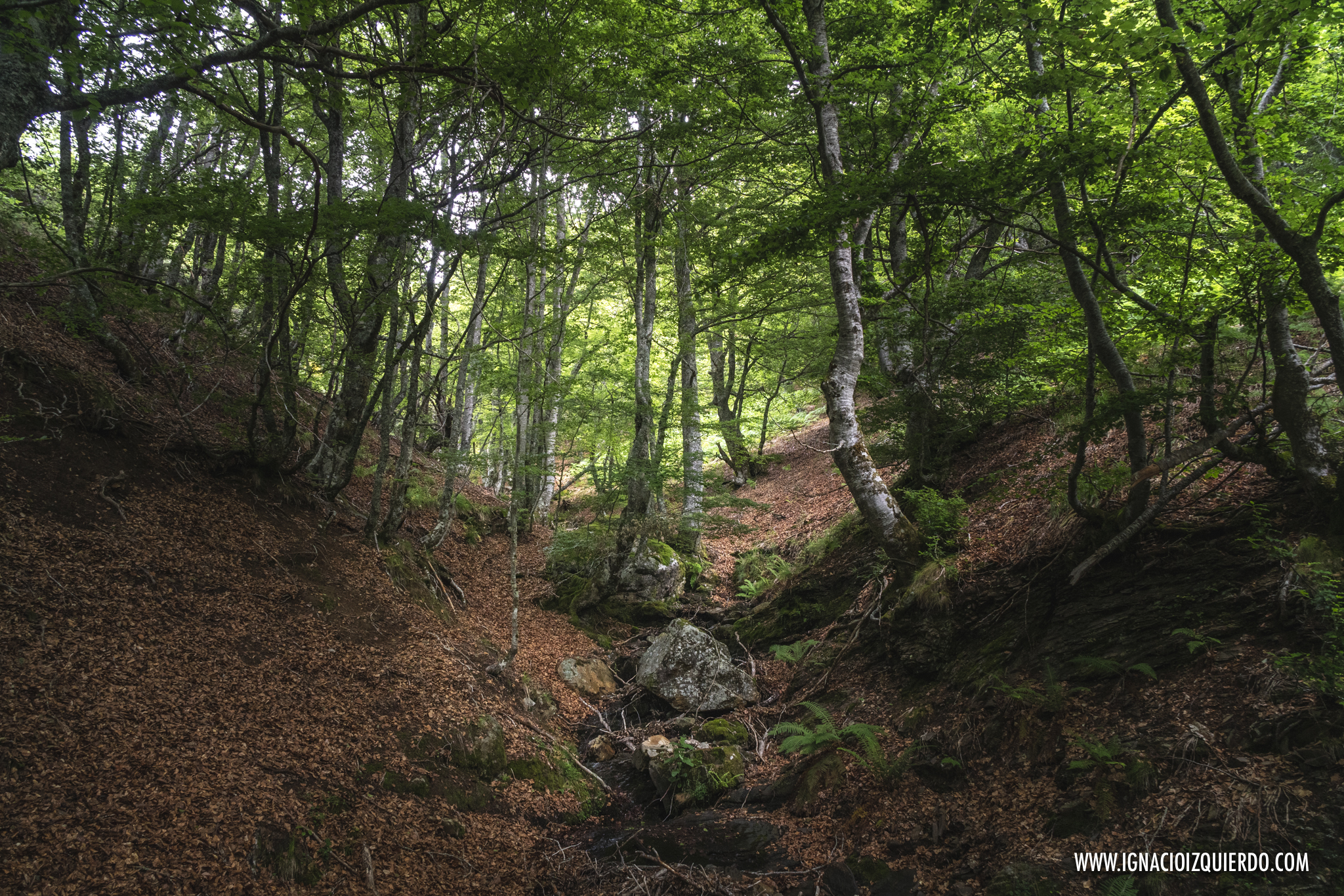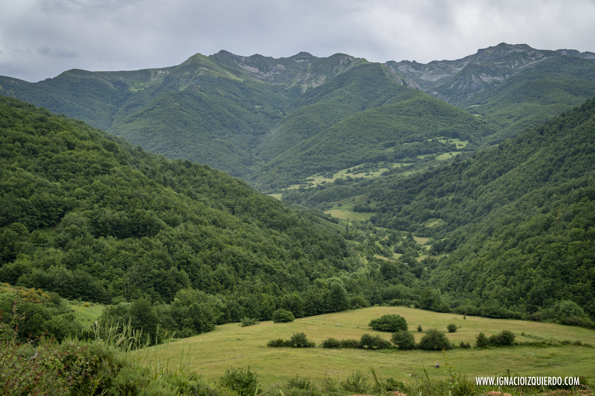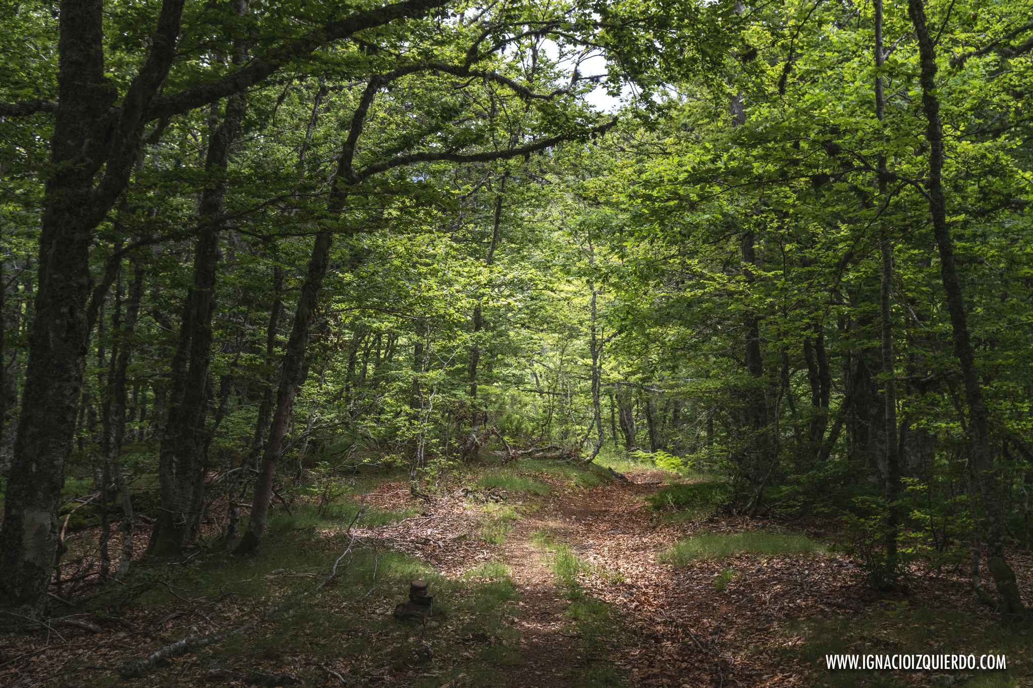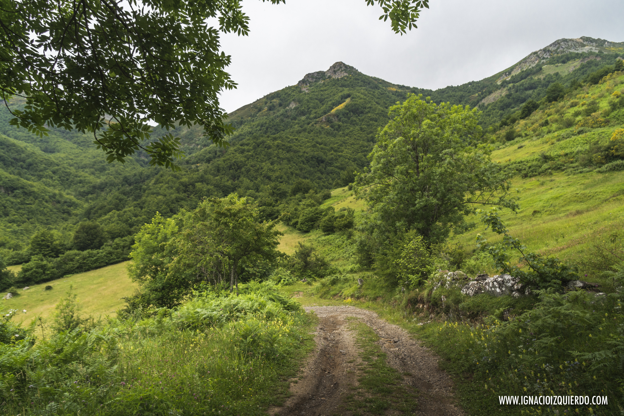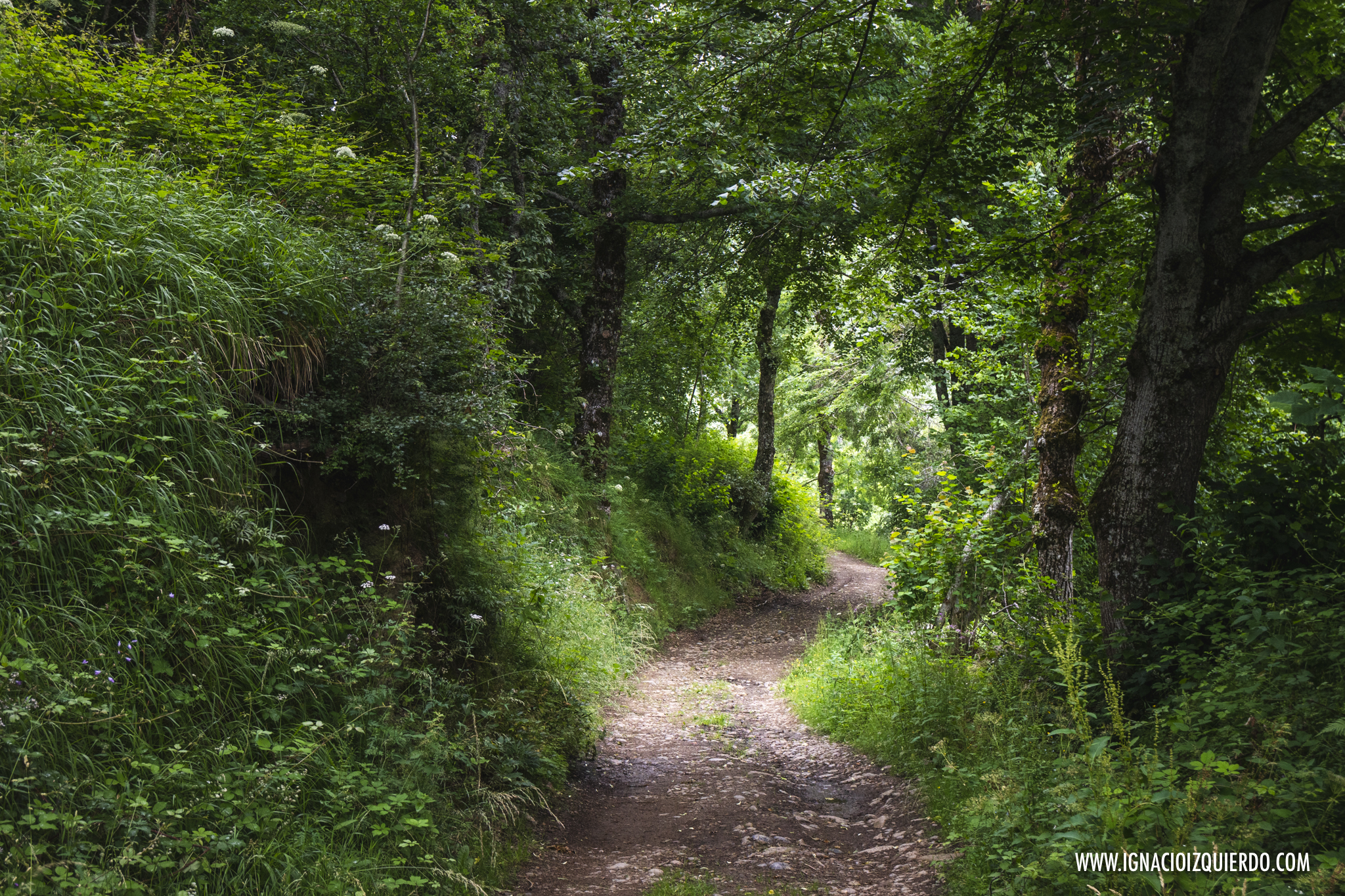 Era un camino frondoso, rodeado de paredes y techos verdes, cerradito y acogedor, a pesar de que el clima solo enfriara los ánimos. Había empezado a caminar sin sol, bajo un manto de nubes y las previsiones no eran nada buenas. Norte de España. Cordillera Cantábrica. No se podía culpar al fuego de quemar. Antes de que me hubiera dado cuenta ya había comenzado el tamborileo de las gotas de lluvia contra las hojas, ramas y suelo. Apenas llevaba unos kilómetros. Dese la vuelta, parecía avisar. Pardiez, pronto comenzamos con las dudas y el mal tiempo, querido Sancho.
