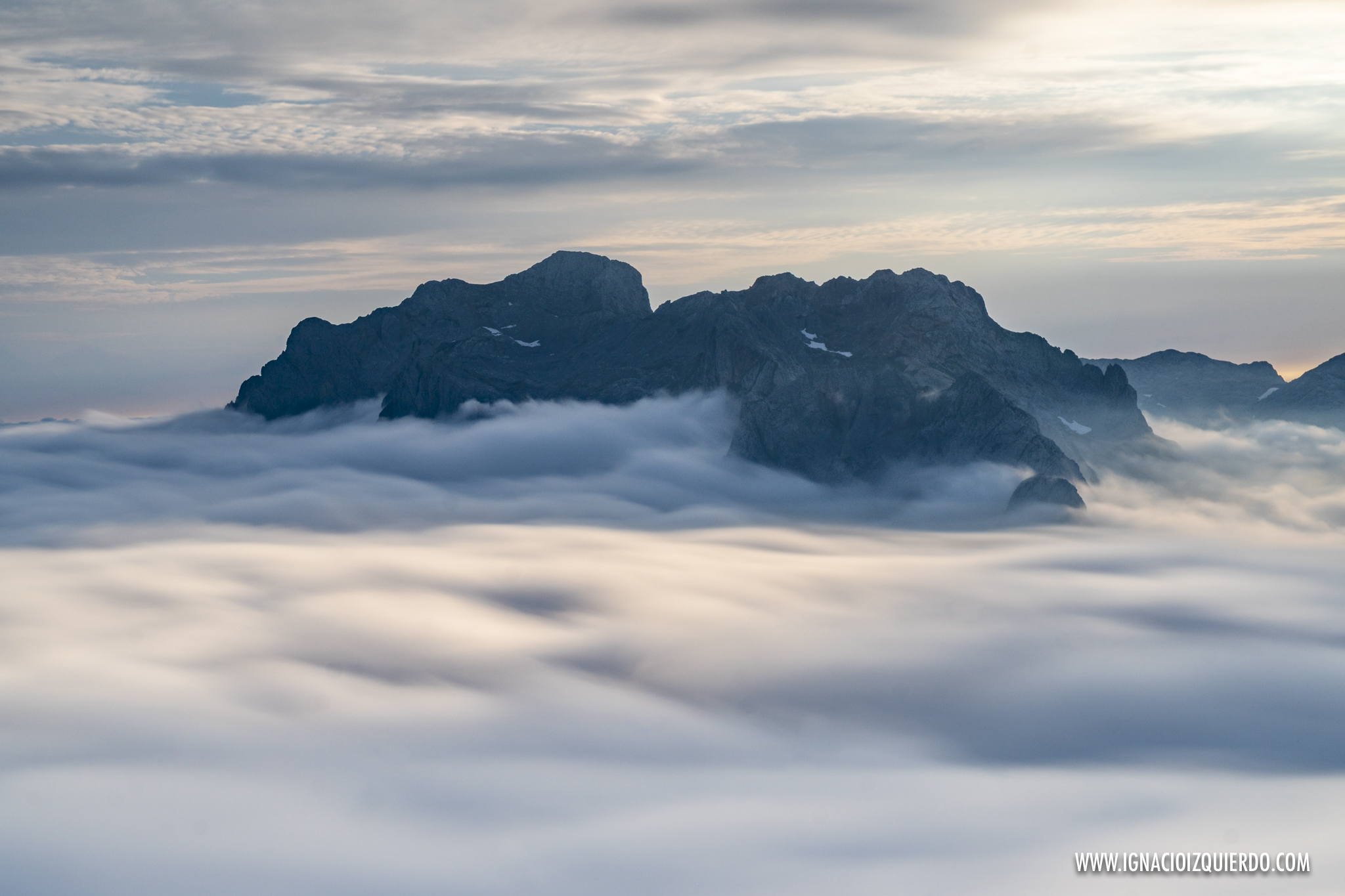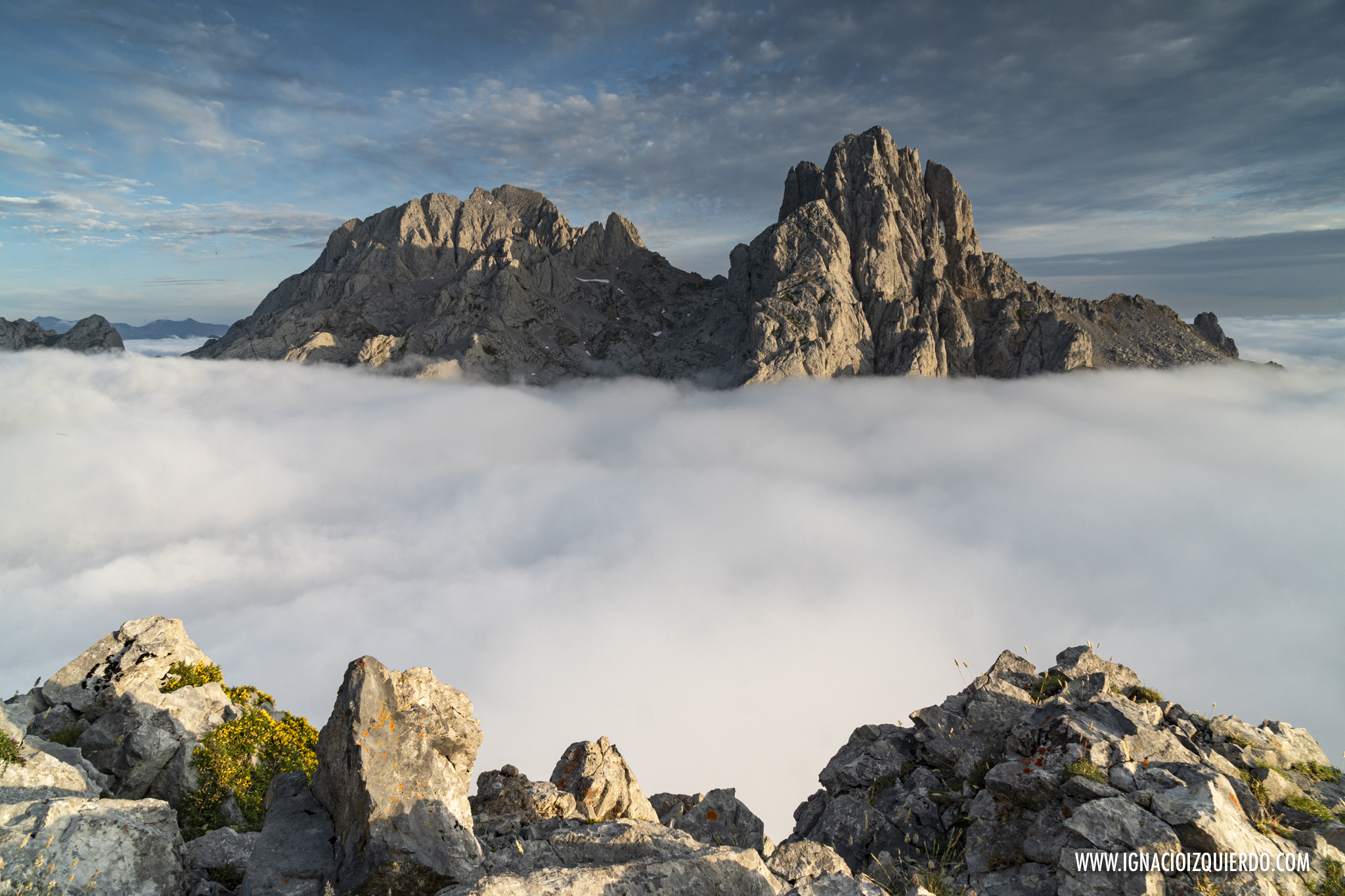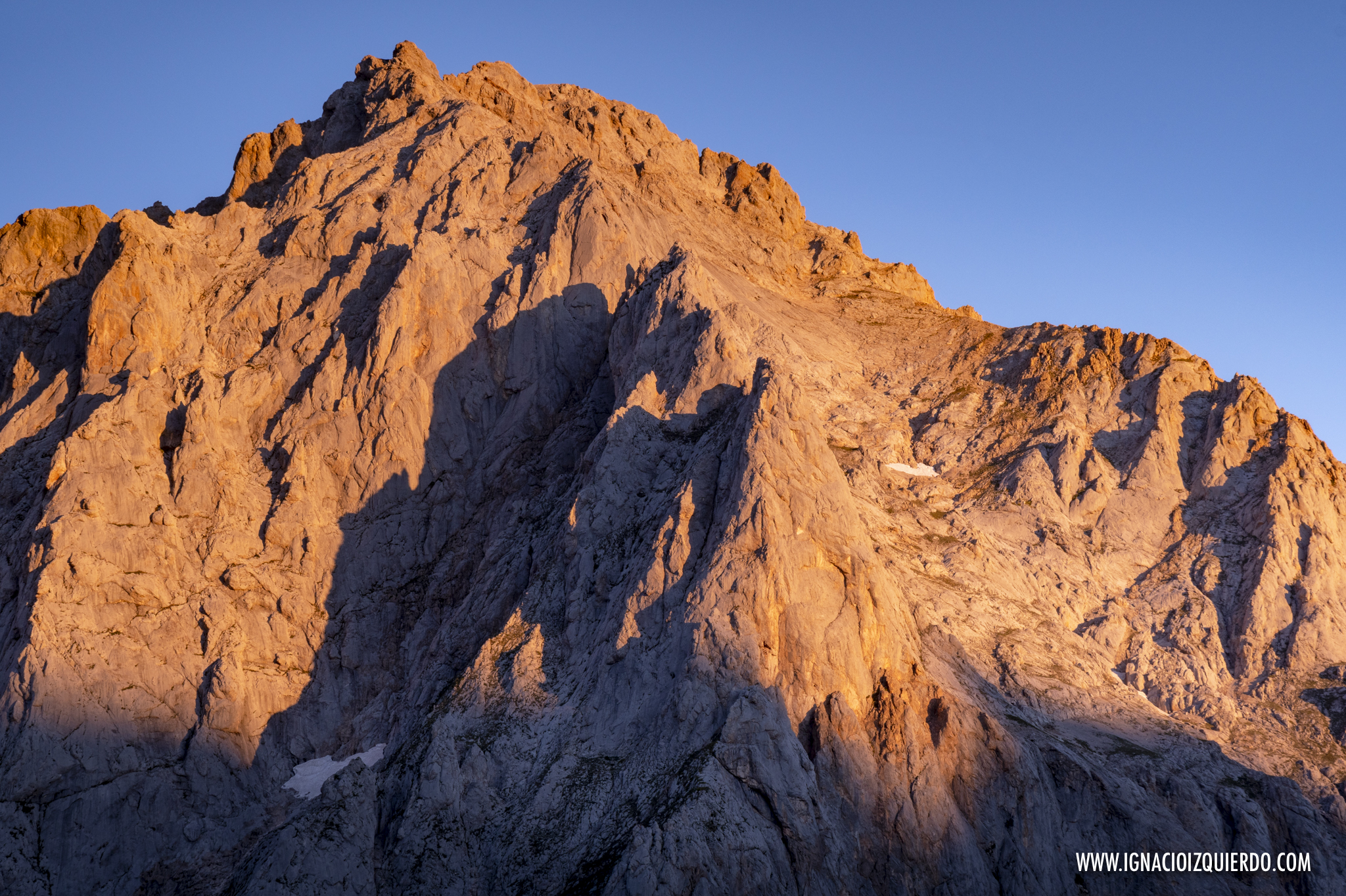 El hotel de Áliva despertó con un amanecer limpio, sin mota alguna de nubes que ensuciaran el perfecto azul del cielo. Sobre mi cabeza, Peña Vieja y Peña Olvidaba se iban vistiendo de luz naranja según el sol ascendía en la lejanía del horizonte. Era un tremendo remanso de paz y de tranquilidad. Pocos eran los que habían abandonado las sábanas a esas horas y quienes lo habían hecho no era sino por obligación. Remolón, el hotel se desperezaba y yo estaba solo viendo las montañas. Vaya lujo.
