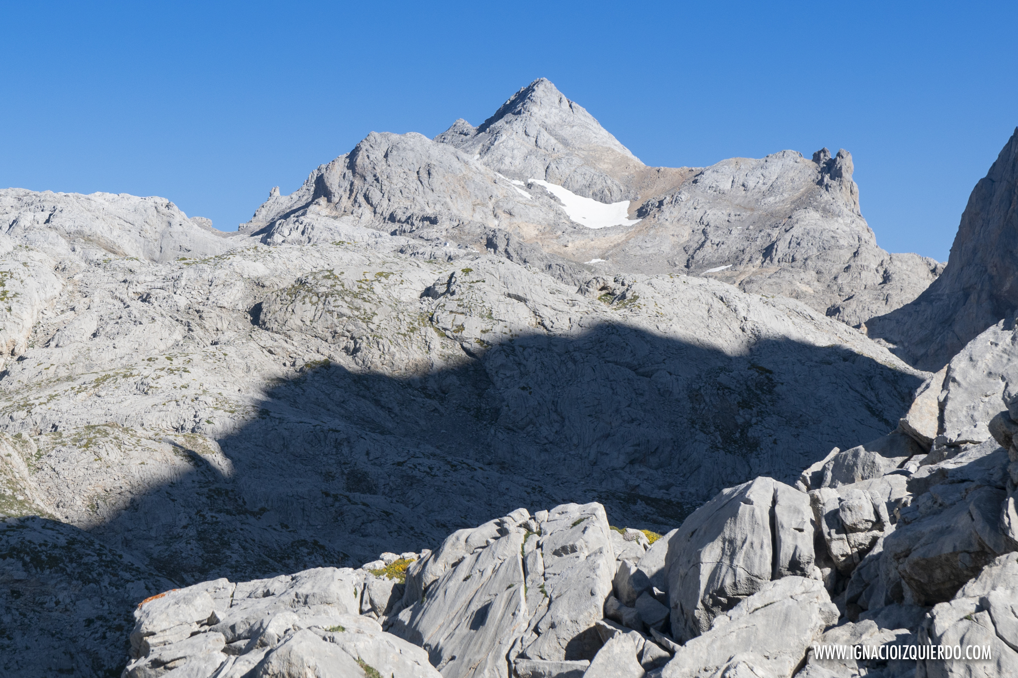 Era recomendable subir un poco más porque elevándome podía encontrar unas cuantas sorpresas: como por ejemplo el Picu Urriellu, apareciendo tras el Collado de los Horcados Rojos. Pero a partir de aquí se acababa la tregua y comenzaba la fiesta. Este tramo se convirtió en una pequeña pesadilla que habría de llevarme casi tres horas completar. Esta pedrera inmensa, de roca salvaje y sin domar tenía un grave problema: era imposible encontrar camino alguno por el que proseguir. Supuestamente se podría identificar la ruta por los hitos (los montones de piedra) pero estos aparecían y desparecían sin criterio alguno y aún siguiéndolos cuando se podía el camino implicaba destrepes, bajadas por paredes verticales y andar con cuidado de no meterse en zonas de las que no pudiera salir. Me tuve que quitar la mochila en unas cuantas ocasiones para dejarla caer.