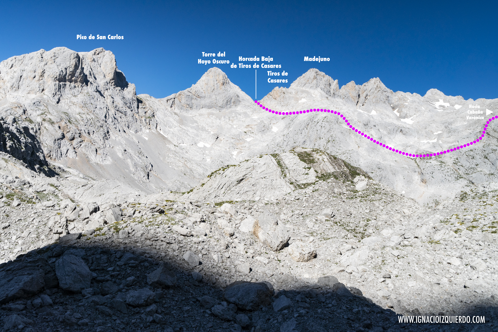 Intentaba seguir el GPS todo lo que podía pero ni por esas conseguía encontrar la ruta óptima para atravesar este tramo hasta la Horcada Baja de Tiros de Casares. Me resulto un pequeño infierno agravado por el estado de mi rodilla, nada contenta con la metamorfosis en cabra a la que me estaba sometiendo. Lo único positivo que podía encontrar era estar haciendo la etapa en un día soleado. No podía ni imaginarme lo que debía de ser hacer este tramo en un día con lluvia, algo que yo, tras haberlo pasado, lo desestimaría directamente. Me parecía demasiado peligroso ir de roca en roca al borde de caídas de varios metros como para encima tener el problema añadido de resbalones por la lluvia.