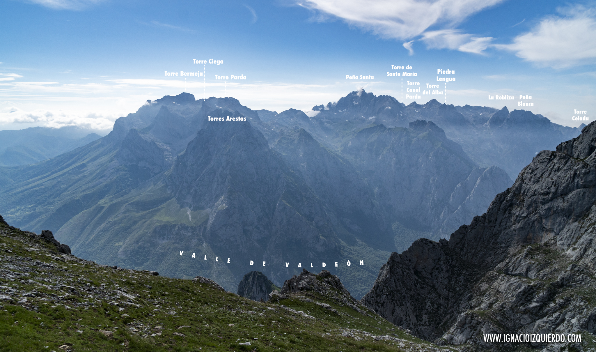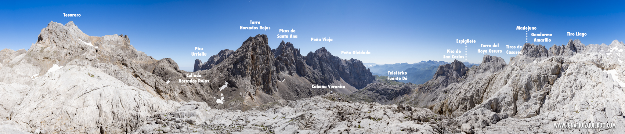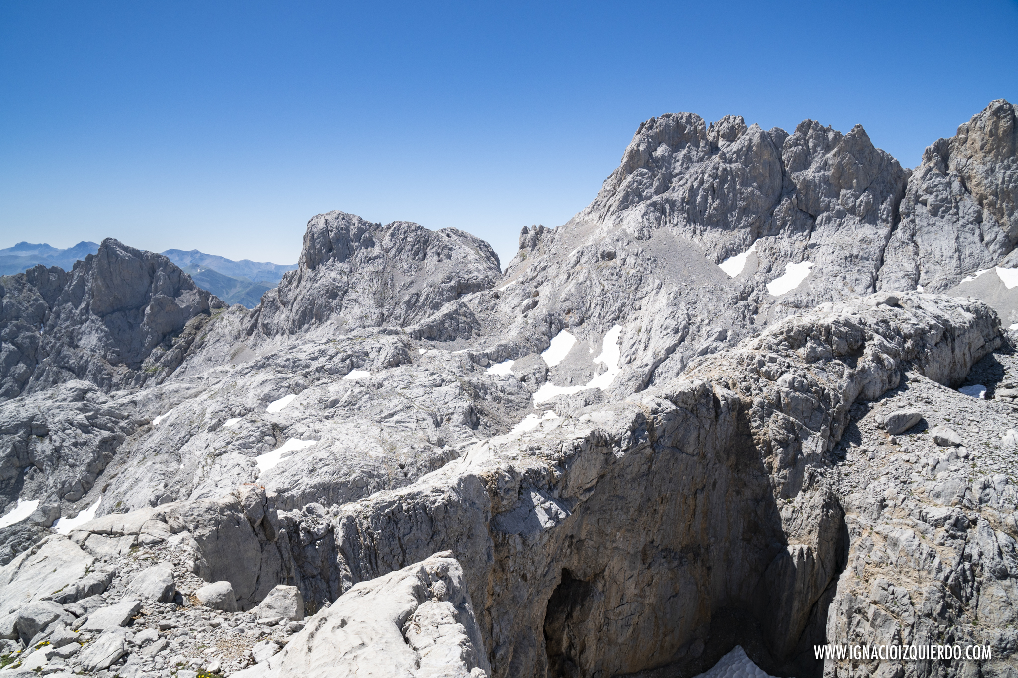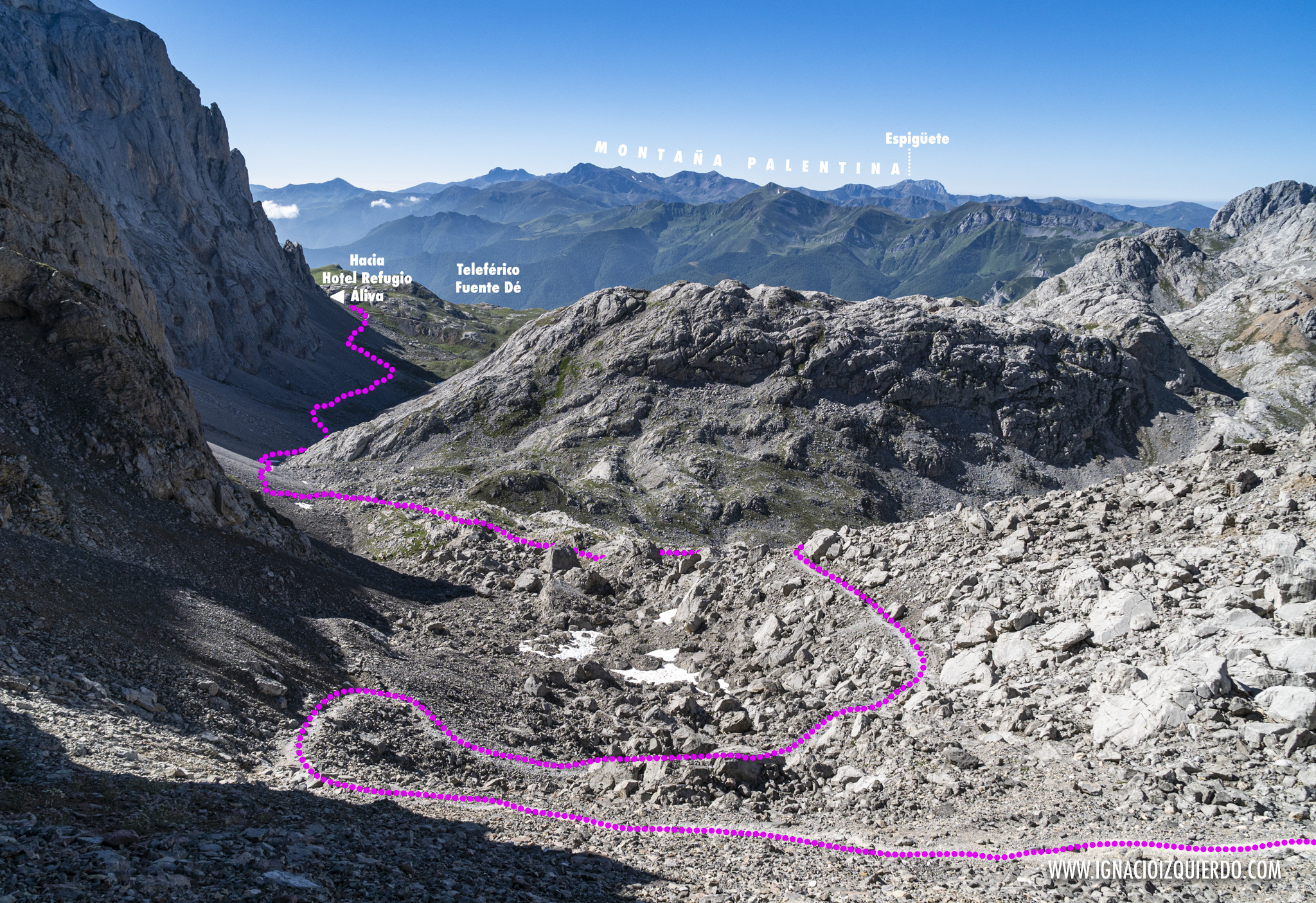 Desde esa cúpula metálica se podía seguir perfectamente el recorrido que había tomado para llegar hasta allí y tenía una panorámica tremenda de la zona con la Torre de los Horcados Rojos, Peña Vieja y Peña Olvidada. Si aguzaba la vista hacia el sur podía ver el Mirador del Cable, final del recorrido del teleférico que sube desde Fuente Dé. Más al sur y como la claridad del día lo permitía, aparecía un viejo conocido: el Espigüete y el resto de picos de la Montaña Palentina. (Lo curioso es que yo cuando hice este Anillo de Picos aún no había vuelto a la Montaña Palentina y no tenía ni idea de lo que era el Espigüete, pero me ha hecho ilusión descubrirlo al preparar estas fotos).