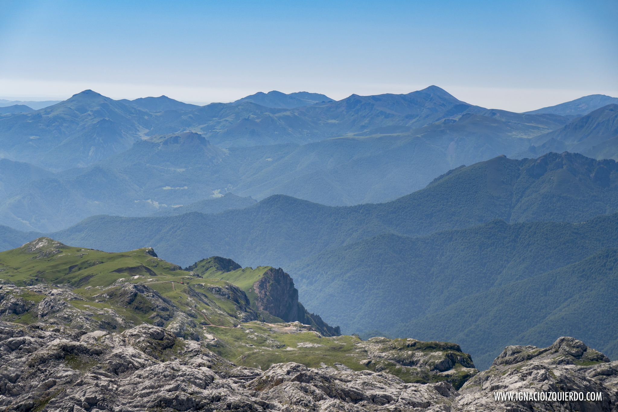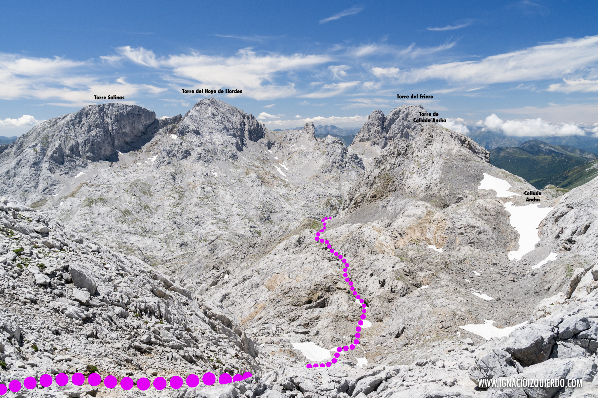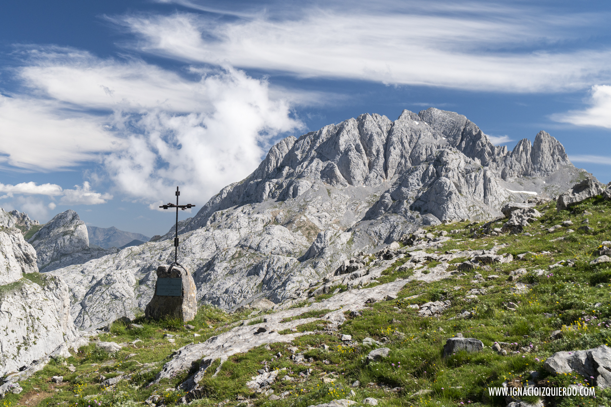 Desde esa cúpula metálica se podía seguir perfectamente el recorrido que había tomado para llegar hasta allí y tenía una panorámica tremenda de la zona con la Torre de los Horcados Rojos, Peña Vieja y Peña Olvidada. Si aguzaba la vista hacia el sur podía ver el Mirador del Cable, final del recorrido del teleférico que sube desde Fuente Dé. Más al sur y como la claridad del día lo permitía, aparecía un viejo conocido: el Espigüete y el resto de picos de la Montaña Palentina. (Lo curioso es que yo cuando hice este Anillo de Picos aún no había vuelto a la Montaña Palentina y no tenía ni idea de lo que era el Espigüete, pero me ha hecho ilusión descubrirlo al preparar estas fotos).