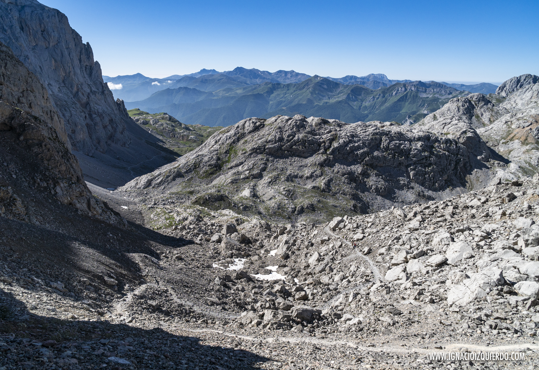 Cruzar esto fue un suplicio. La rodilla ya no sabía ni como quejarse para que le hiciera caso. Esta etapa estaba acabando conmigo y con la poca energía que me quedaba. Estaba tirando de reserva, lo tenía claro. La fatiga no la calmaba ya el comer, era la sentencia del cansancio acumulado. Cuando salí de la pedrera y encontré el camino respiré aliviado. Al menos podía caminar sin saltar, sin arrastrar el culo y la dignidad. El regalo no era solo un terreno más asequible para caminar sino que ya empezaba a tener vistas del Macizo Occidental al otro lado del Valle de Valdeón. Me quedaba el último arrechuchón, terminar de subir hasta las Colladinas y dejarme rodar hasta el refugio.
