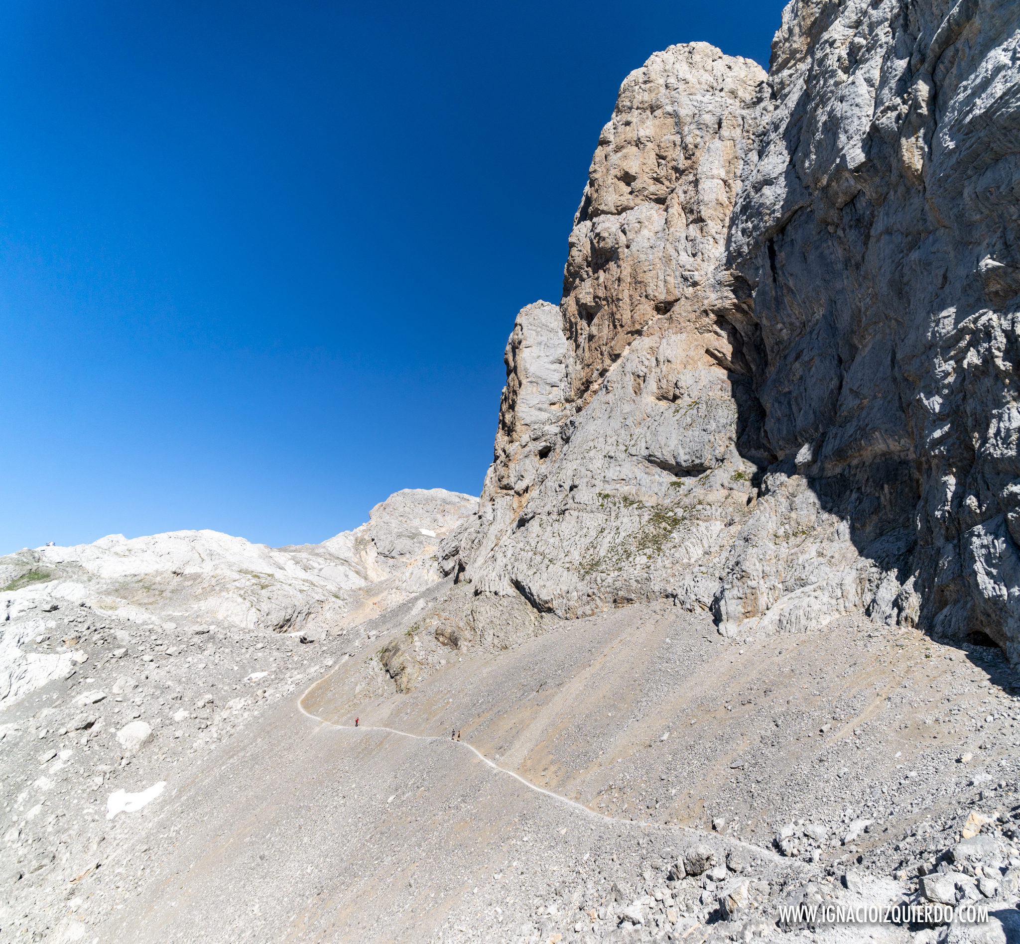 Atravesaba las llanuras de Áliva en una subida progresiva, constante. Sin grandes pendientes, pero también sin la tregua de la superficies planas. Bordeaba el macizo de Peña Olvidada para adentrarme en la ruta que habría de llevarme hasta el Refugio de Cabaña Verónica bajo la sombra de Peña Vieja y las Torres de los Horcados Rojos. Esta ruta también engancha con los excurionistas que vienen suben en el teleférico de Fuente Dé hasta el Mirador del Cable pues es bastante popular hacer una etapa que suba hasta el collado de los Horcados Rojos antes de darse media vuelta. Una excursión de día que si el tiempo acompaña tiene unas vistas tremendas sobre el Macizo Central.