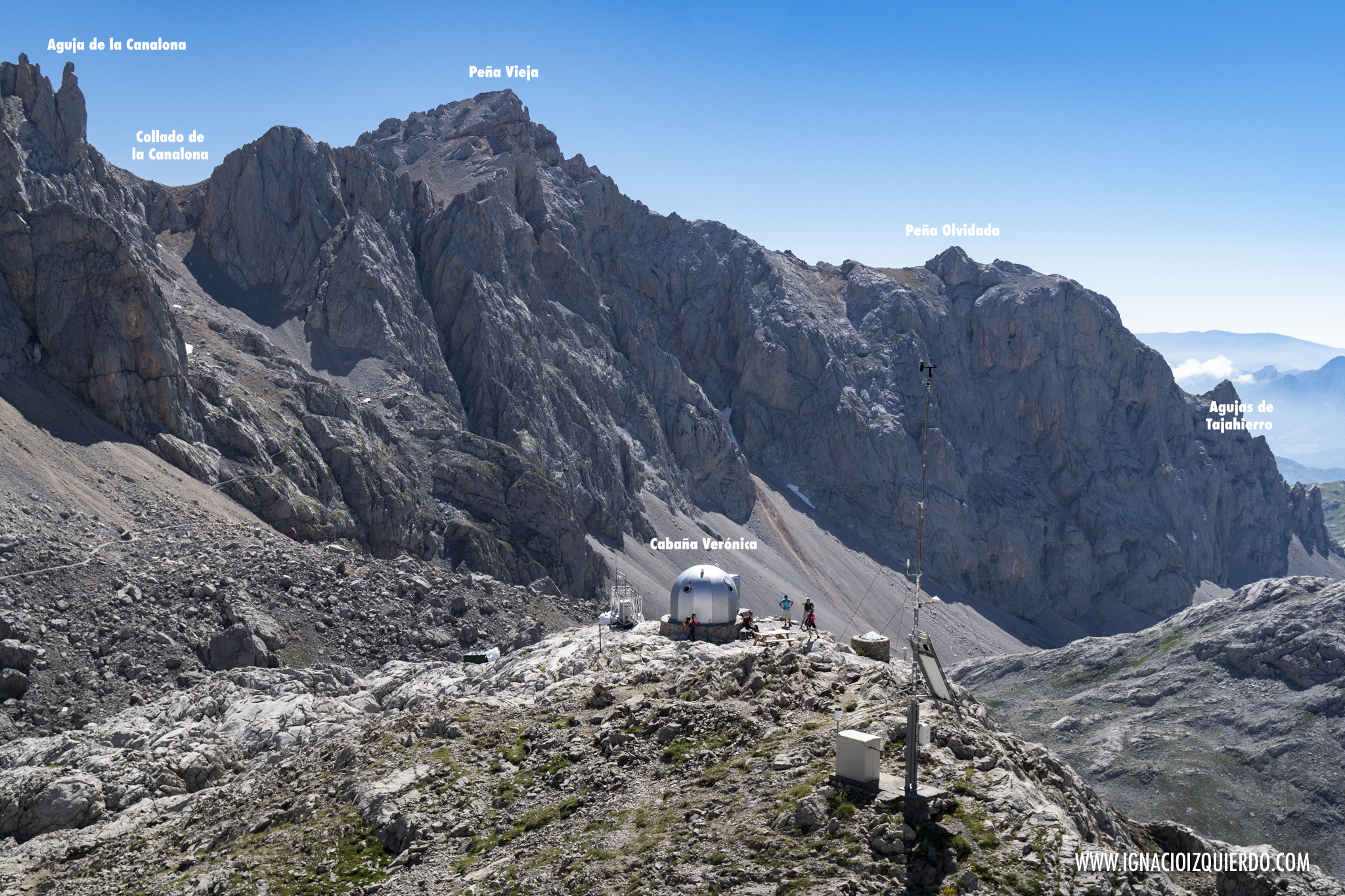 Fue una subida entretenida, con algunos tramos de apretarse los repechos en zigzags pero que no entrañaban ninguna dificultad técnica. Había abandonado la pista para entrar en el sendero y el sol ya empezaba a calentar. Llegué a un desvío que permitía elegir entre subir al Collado de los Horcados Rojos o a Cabaña Verónica, mi primera parada técnica. Cabaña Verónica es un refugio de lo más peculiar. No solo por sus ya comentados 9 metros cuadrados que pueden dar cobijo en literas triples a 6 personas, sino porque que está construido utilizando la cúpula de una batería antiárea de un portaviones estadounidense. Como en los argumentos más locos de Lost, allí, en mitad de la Cordillera Cantábrica, a 2325 metros de altura teníamos un trozo de un barco. Merecía la pena pasar no solo para admirar las vistas sobre las que reposaba sino para conocerlo y visitar también su interior. Dentro todo el espacio está aprovechado al máximo, pues dispone no solo de literas que parecen sacadas de un submarino, sino que tiene también su propia cocina y ofrece, a pesar del tremendo problema del agua, comidas y bebidas calientes.