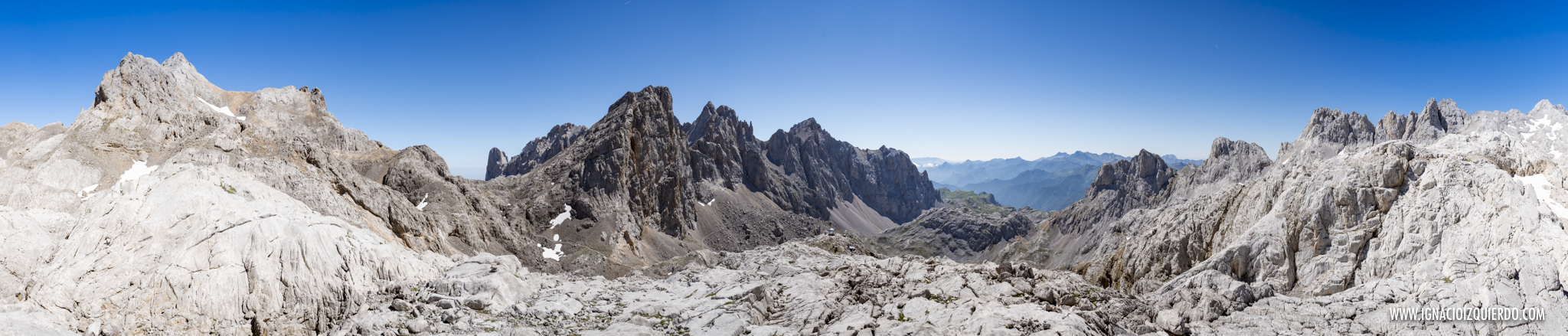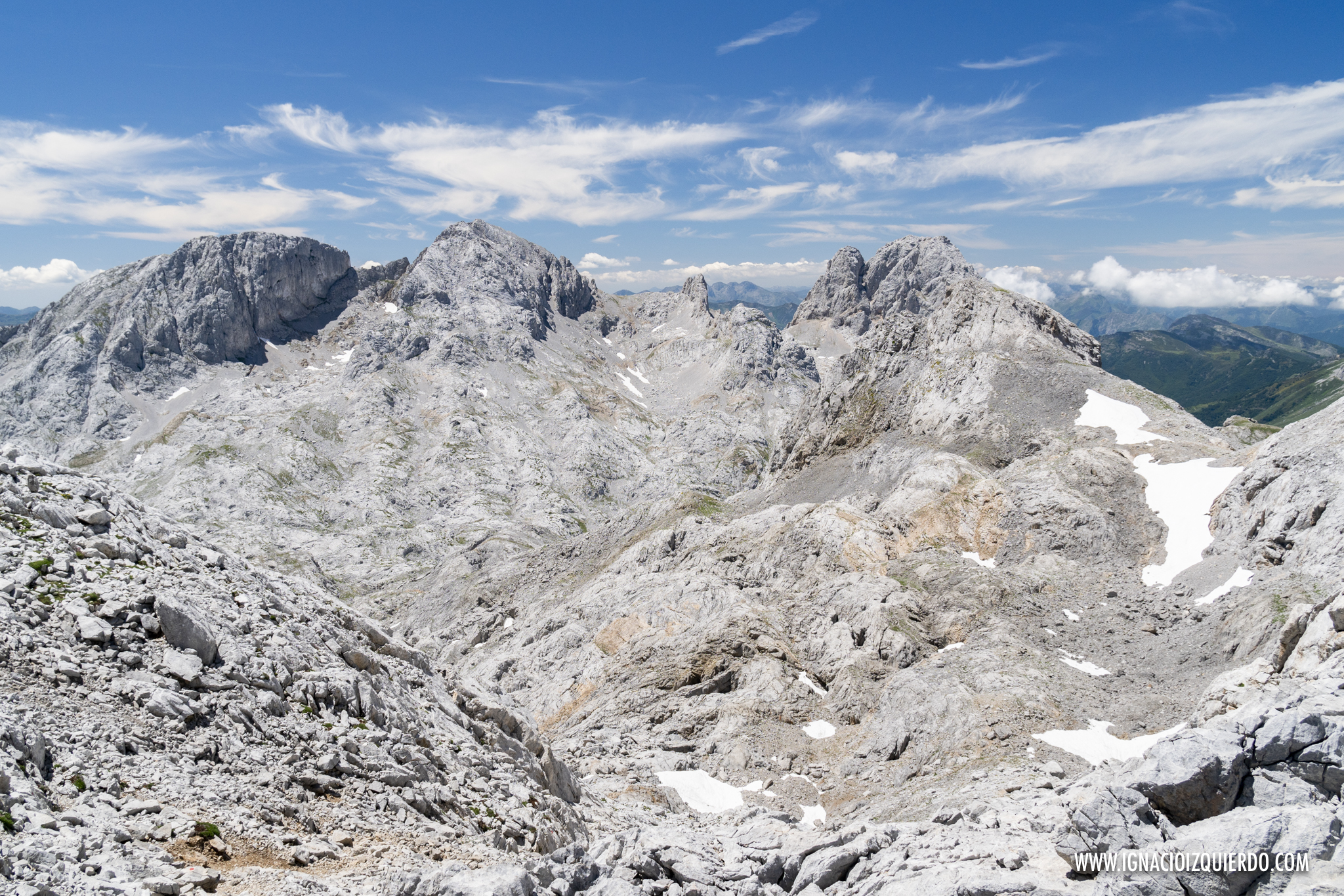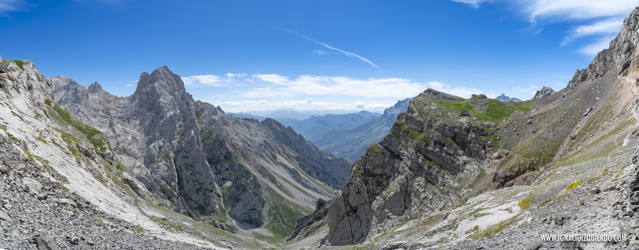 (Panorámica de la zona. Atentos a como asoma el Picu Urriellu por encima del Collado de Horcados Rojos y como se ve al fondo fondísimo la Montaña Palentina)