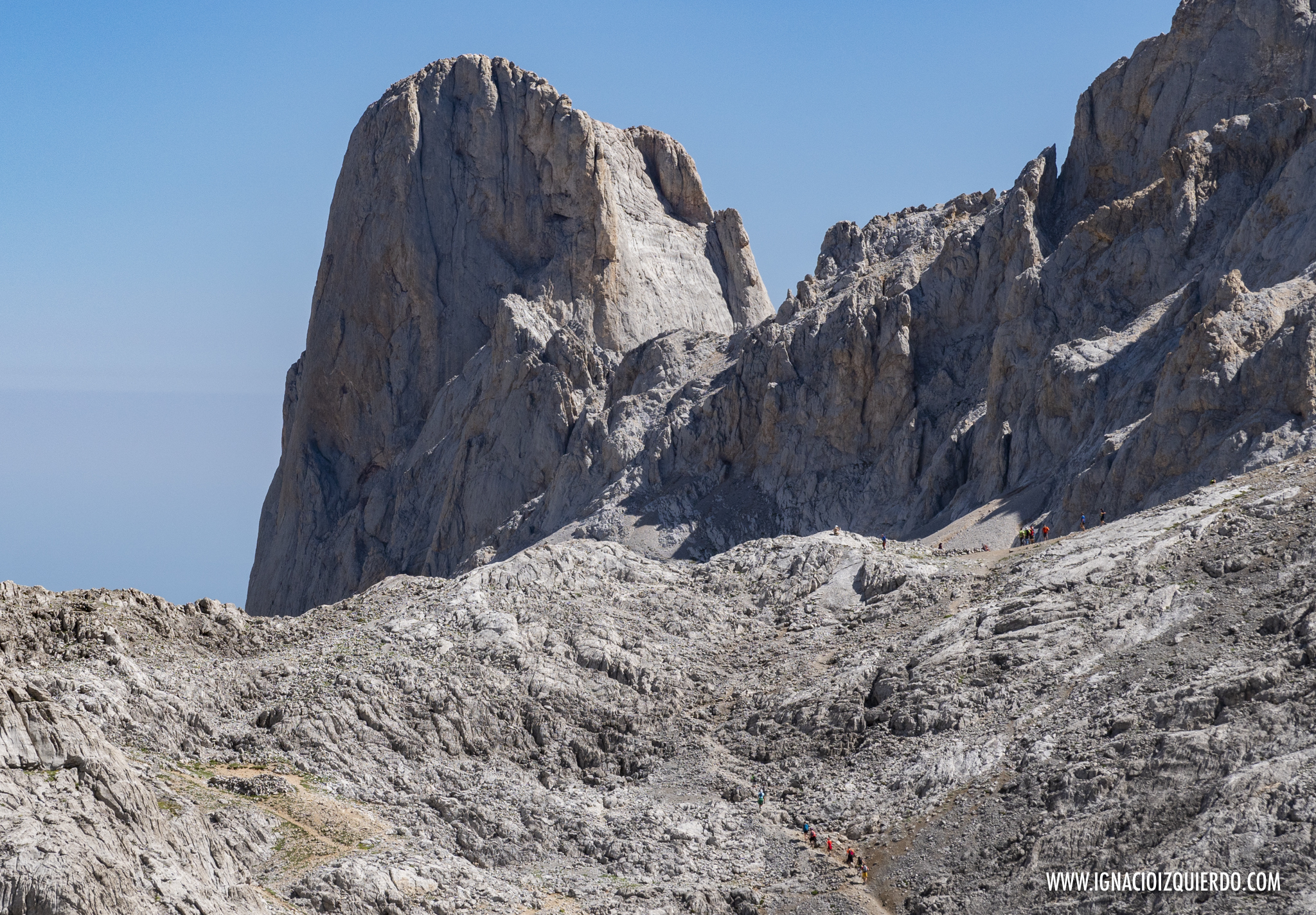 (Excursionistas subiendo al/y en el collado de Horcados Rojos. El Picu Urriellu al fondo)