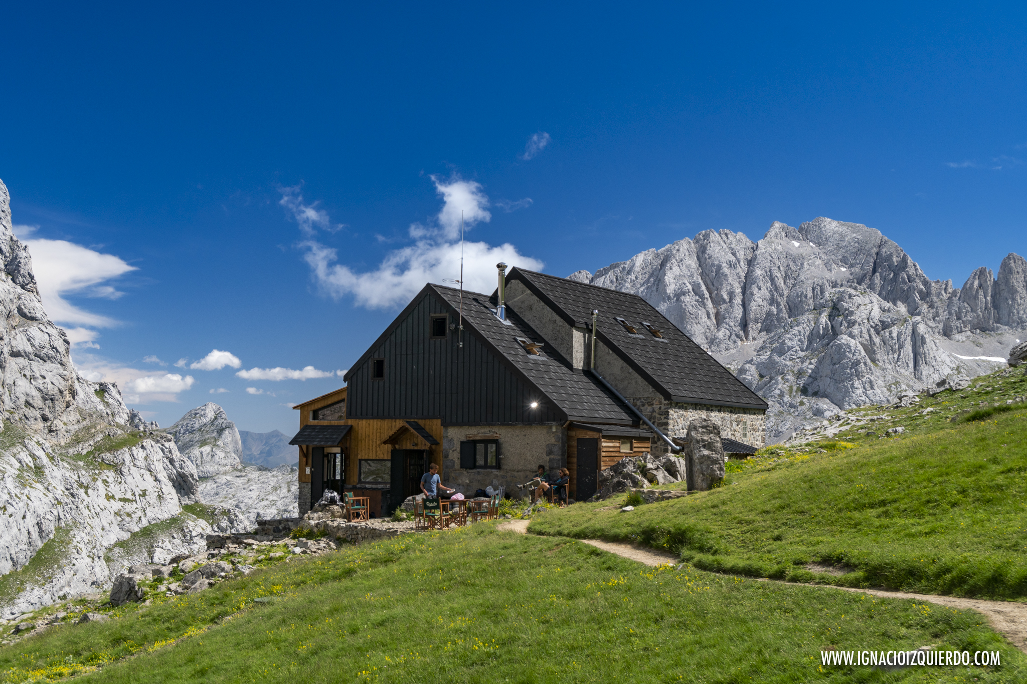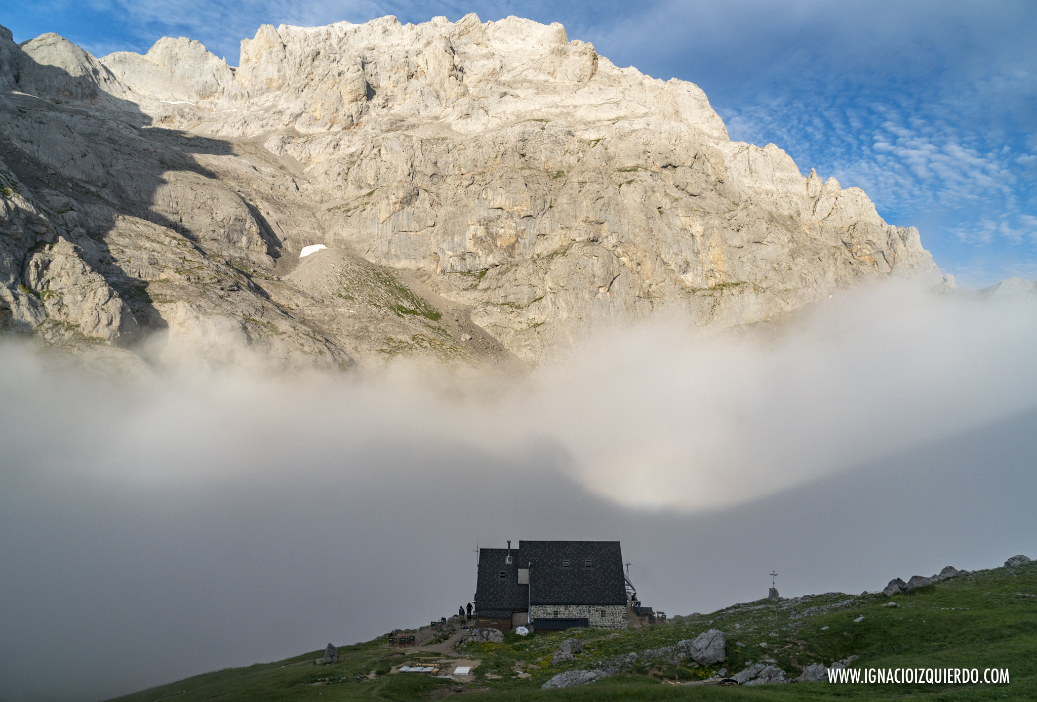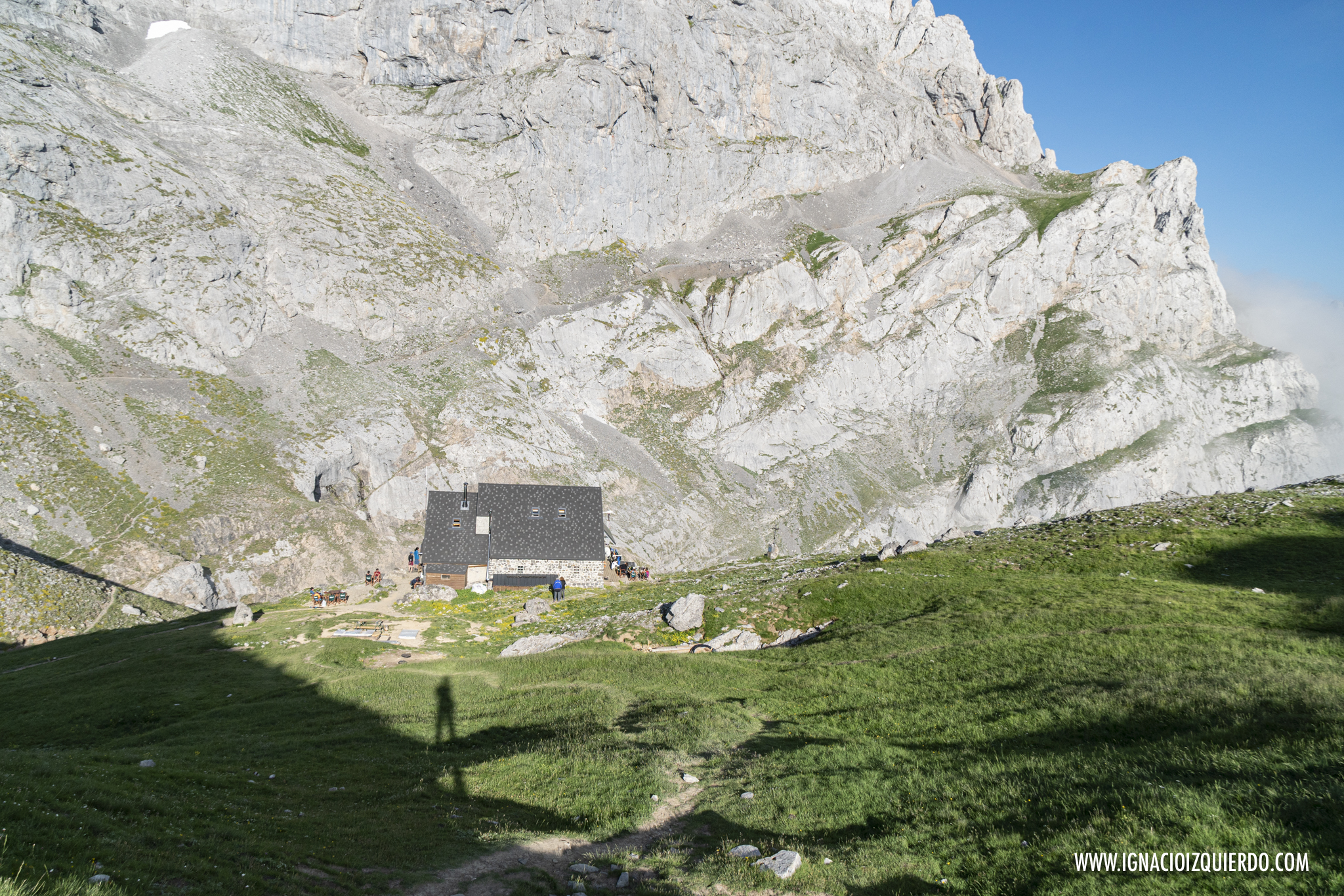 Terminé de bordear el abismo y alcancé ese refugio construido en ese lugar imposible, transportado a lomos de animales durante 1941. Podía imaginármelos subiendo esas cuestas ilógicas cargados con bolsas de cemento, pero me costaba más imaginar las proezas que habrían tenido que realizar para subir cocinas o las enormes vigas. Y sin embargo allí estaba, otro refugio improbable e imposible de Picos de Europa, dispuesto a recibirme con cerveza fría.