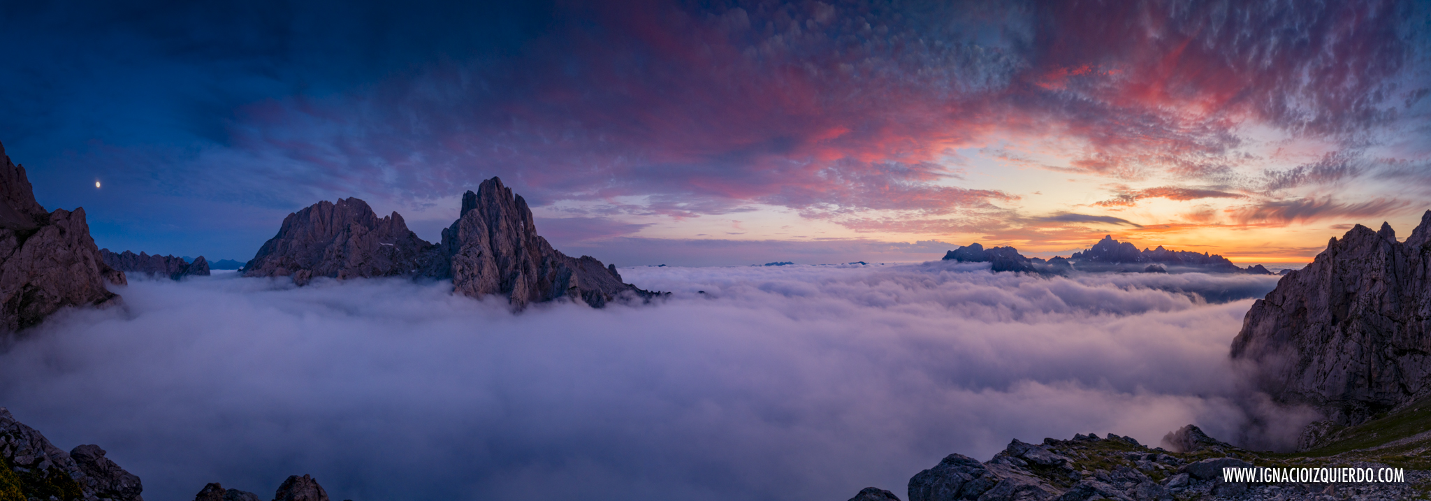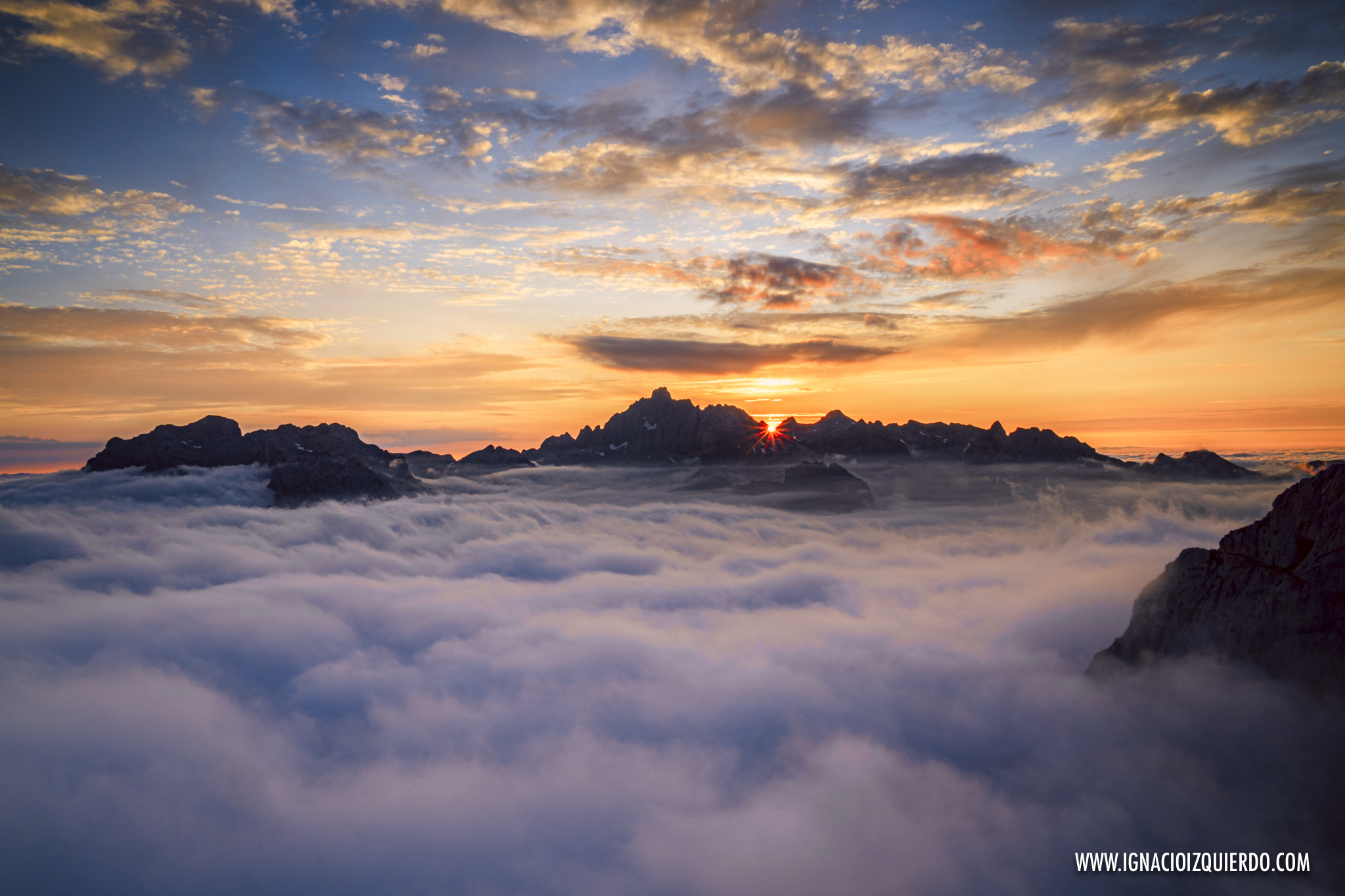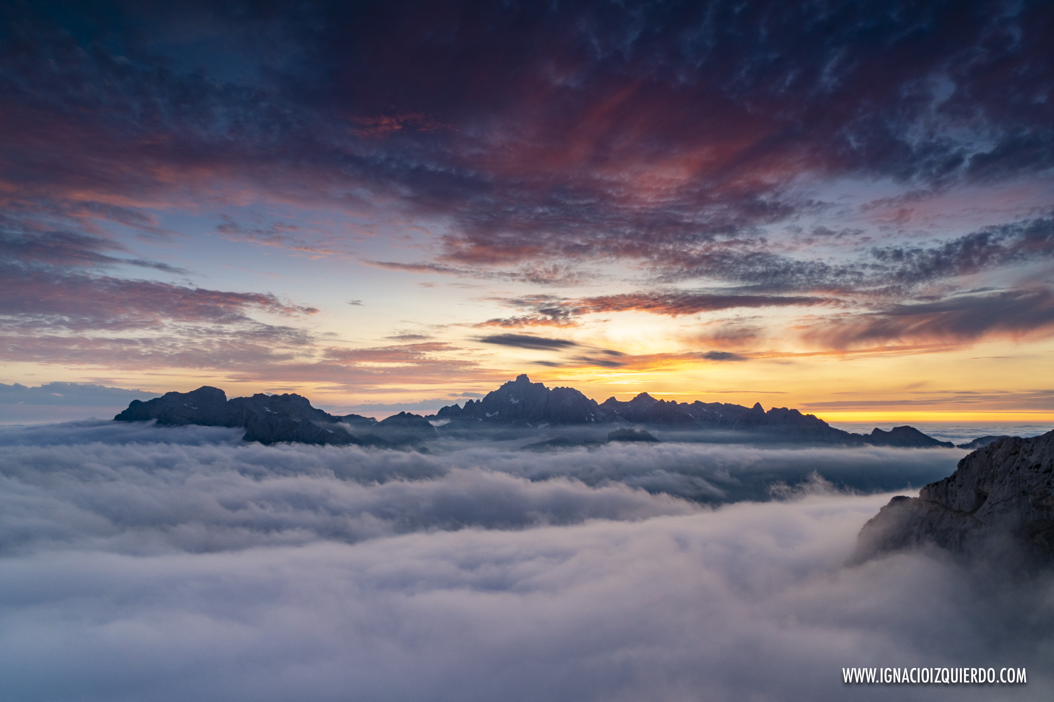 La cena la habíamos pasado con el refugio envuelto en nubes pero esta vez la montaña tuvo compasión. Al fin. Después de todo el sufrimiento acumulado pensó que este era el momento para hacer las paces. Hizo bajar las nubes justo por debajo de donde estábamos, sumiendo el resto del mundo en la oscuridad. Como si fuera un regalo privado, para público reducido, allí estaba el atardecer más espectacular de todos los que había vivido en esos días de caminata.
