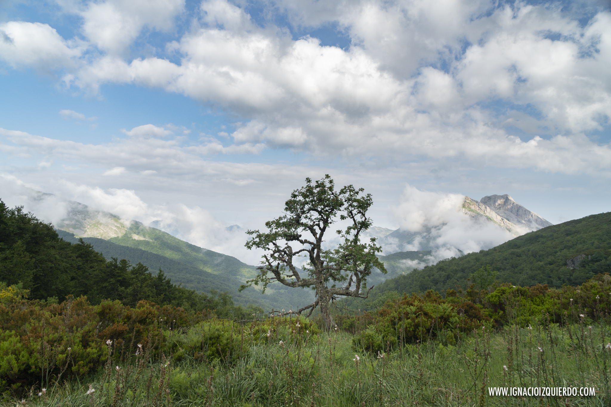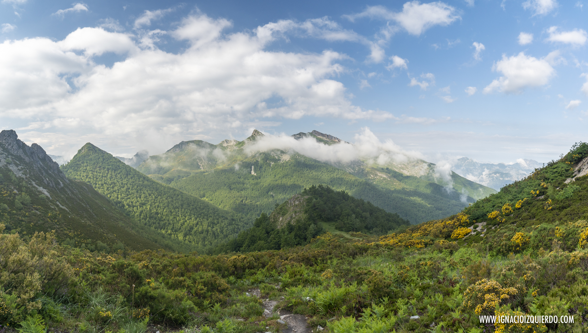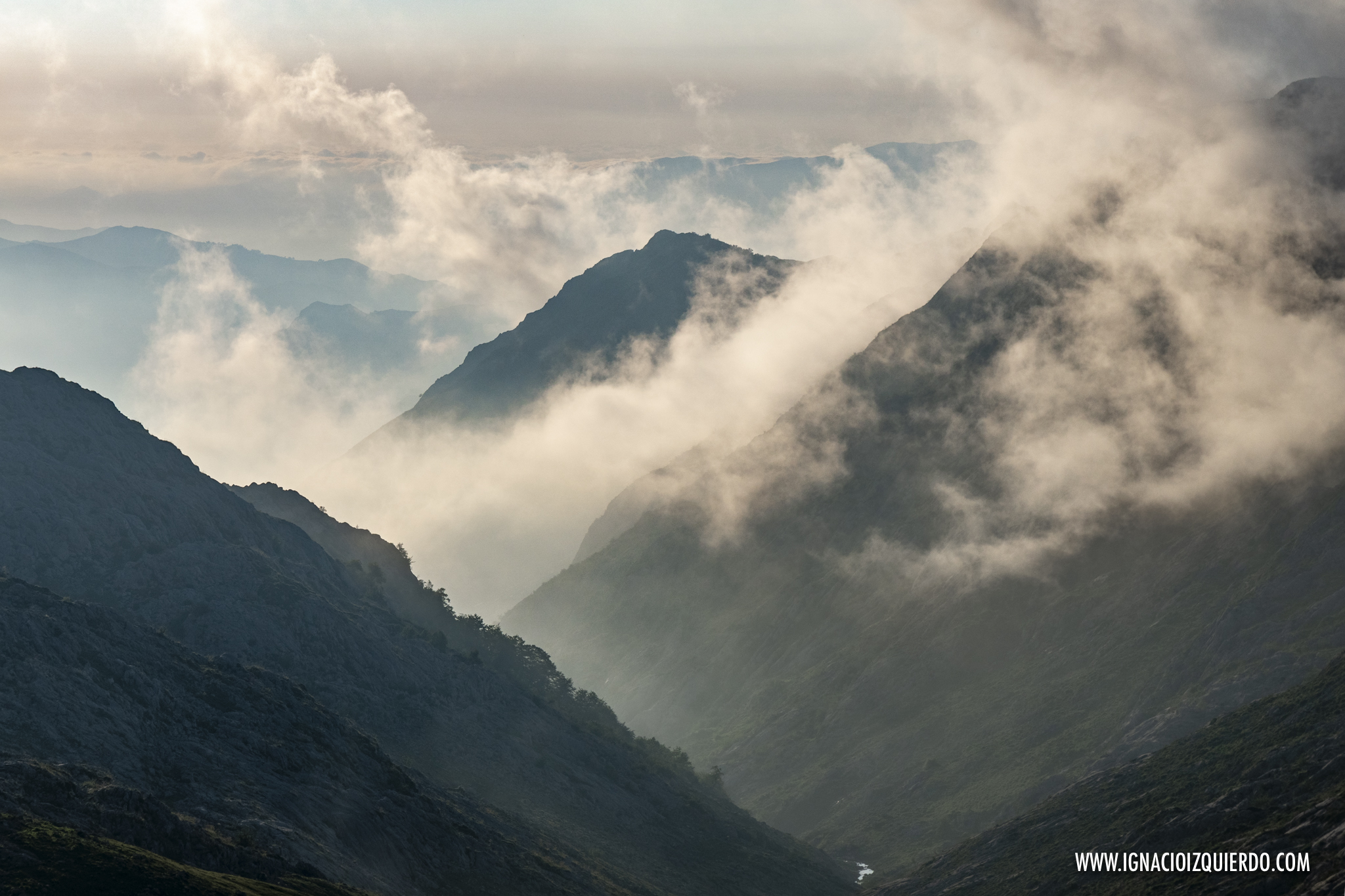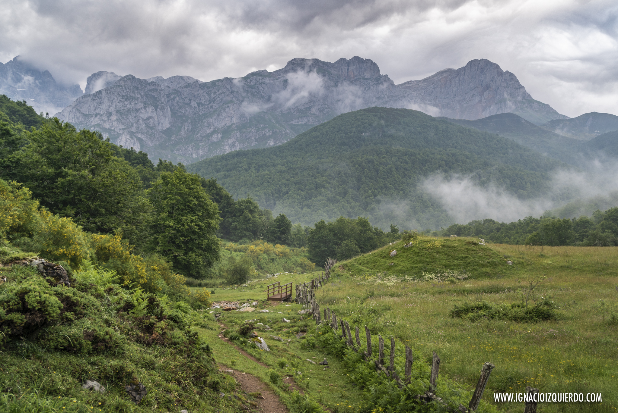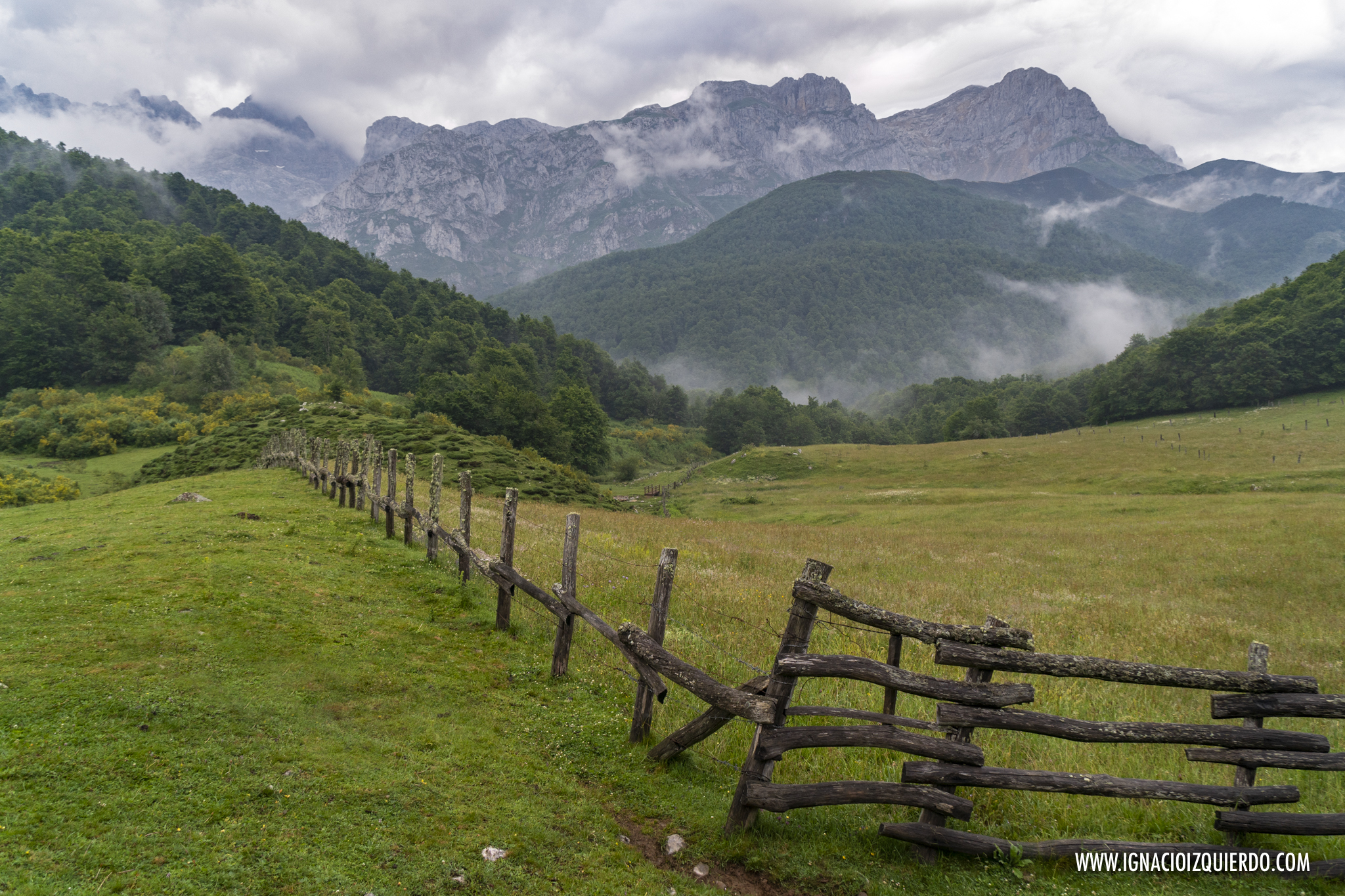 El viento se llevó algo del mal tiempo mientras el café y las tostadas me calentaban el cuerpo. Lo justo para caminar bajo nubes que seguían allí, en las alturas envolviendo picos. Perdí definitivamente la esperanza de ver Peña Santa y volví a adentrarme en los bosques, subiendo por Cuesta Fría, rodeado de verdes y arrullado por el canto de los pájaros. Caminaba solo, y así lo haría en casi la totalidad de la jornada. La montaña era mía aunque no pudiera verla.