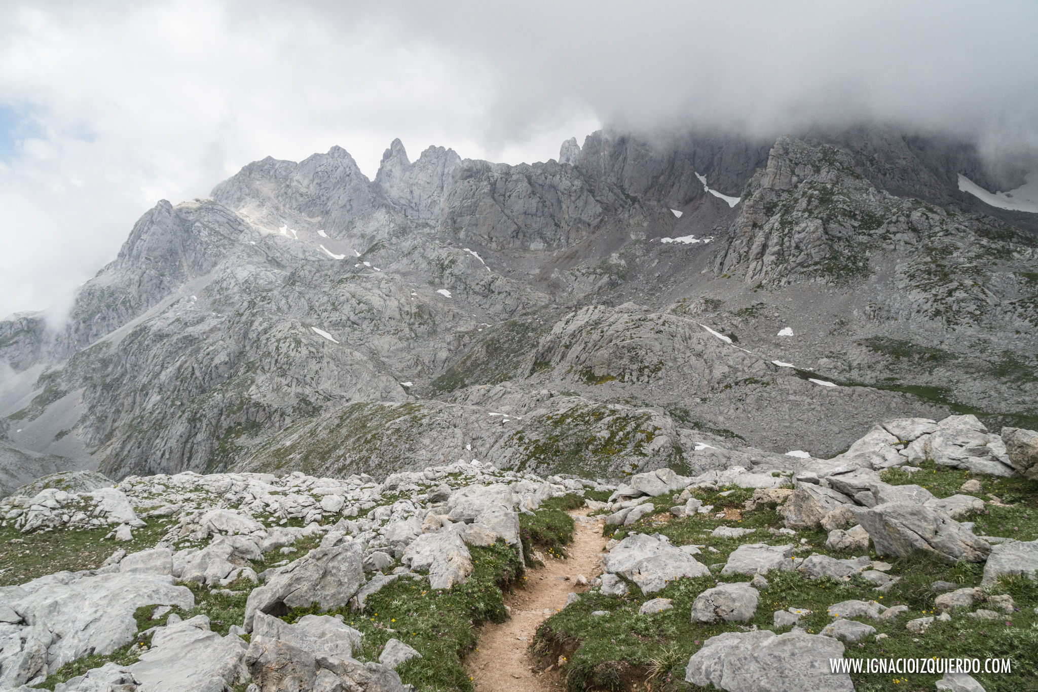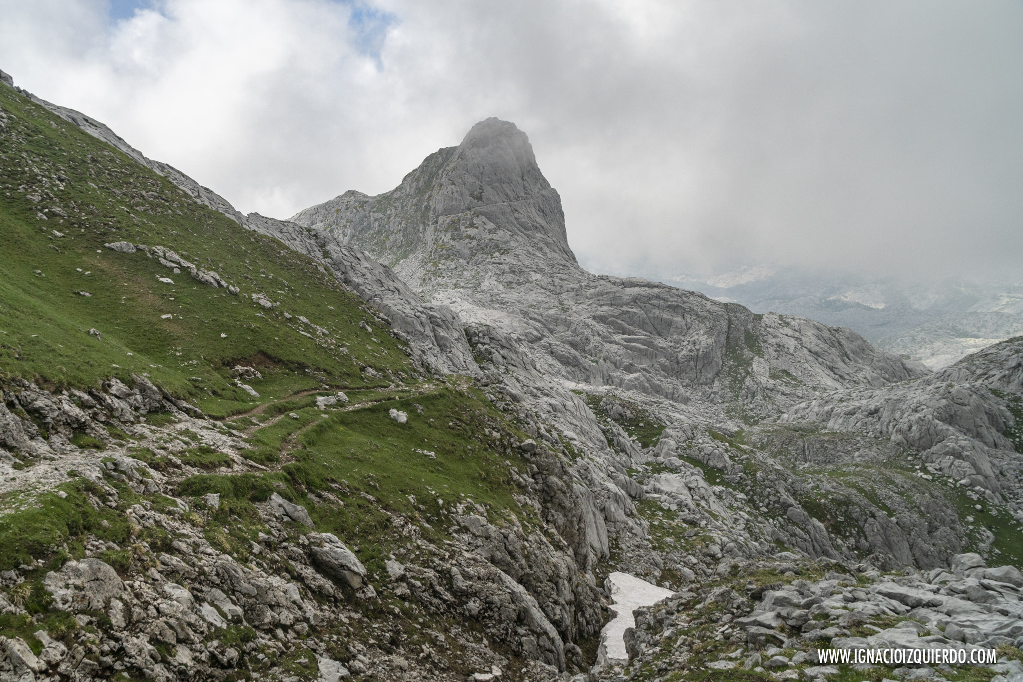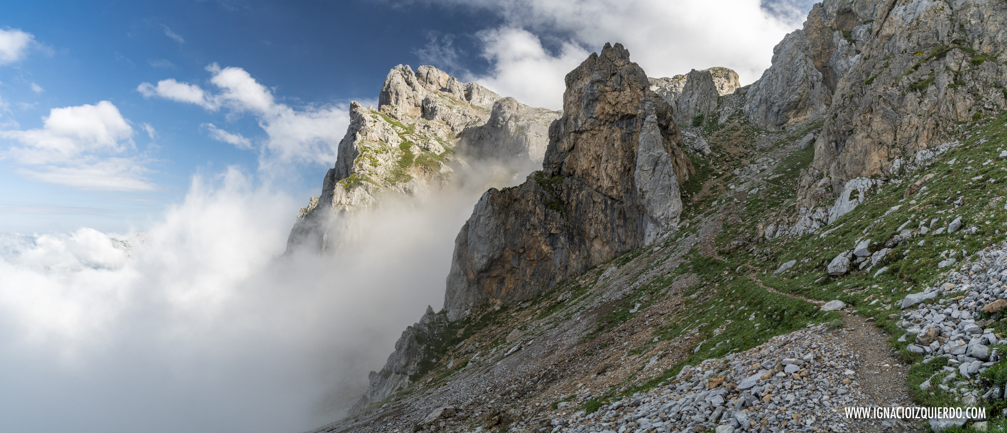 (El Macizo de Peña Santa entre las nubes. Caminando por el Camino del Burro, por encima de gigantes de piedra)