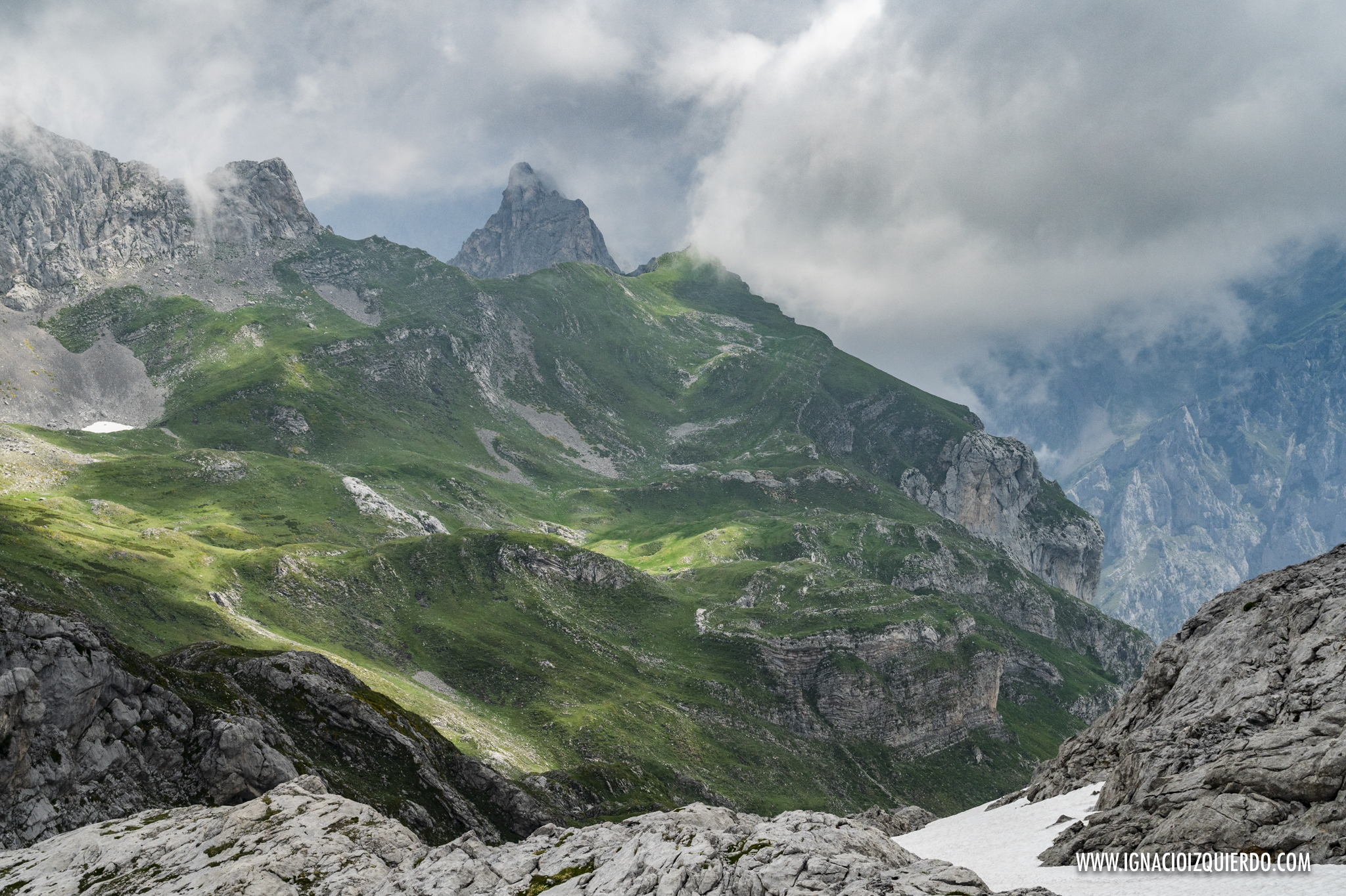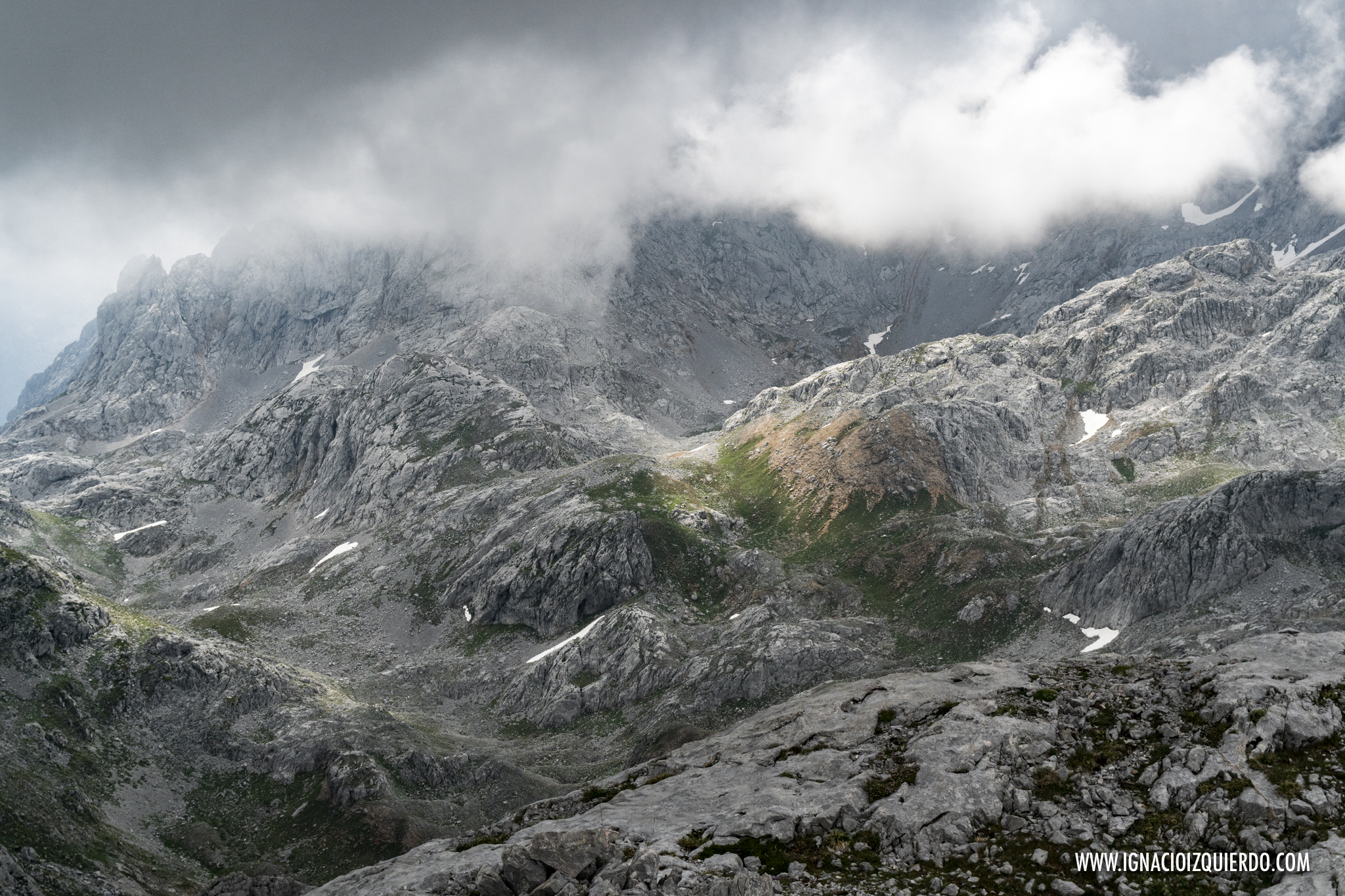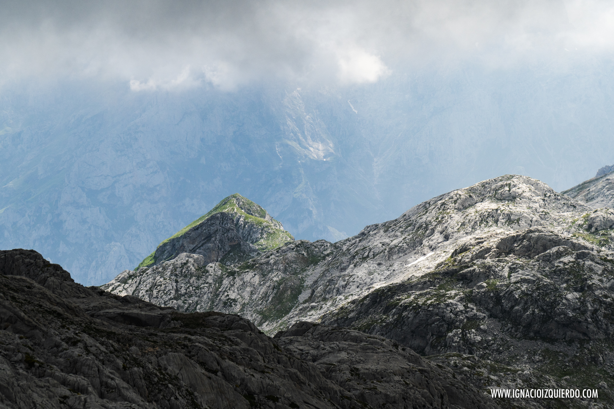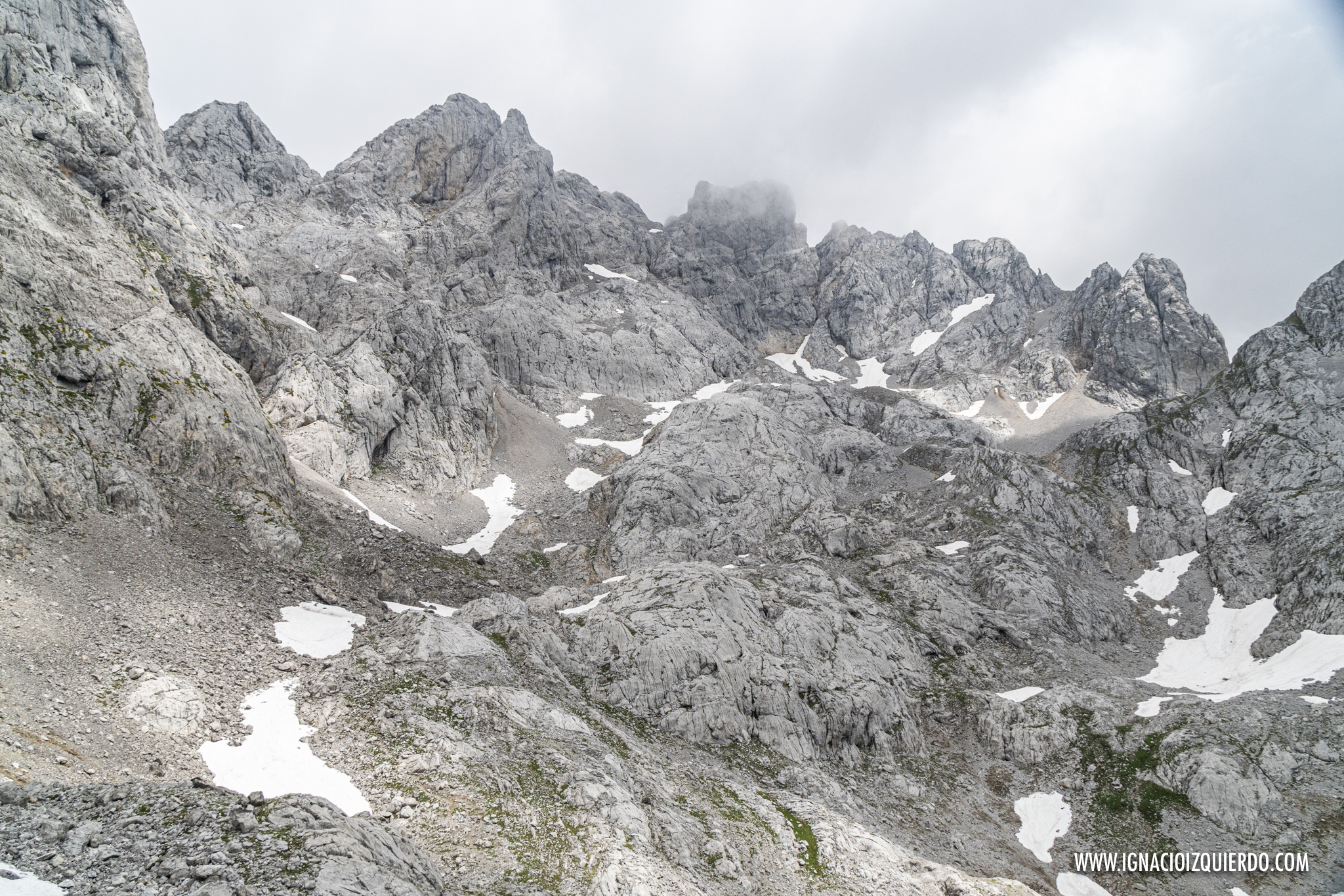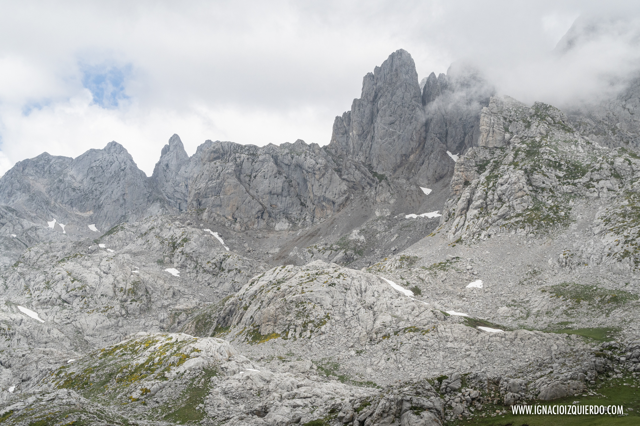 El la subida por el Canal de Perro me adentraba ya en los 2000 metros, espacio alpino, donde desparecían todo rastro de bosque, para dejar paso a matorrales y pastizales allí donde la roca lo permitía. Alcanzaba el Collado del Burro y el paisaje se volvía pura piedra. Mazacotes de roca caliza por donde discurría como buenamente podía un camino. Al fondo las oscuras montañas de Mordor, señor Frodo… digo, al fondo estaba mi segunda oportunidad para ver la Peña Santa. Fallida de nuevo. Las oscuras nubes habían decidido lo contrario.