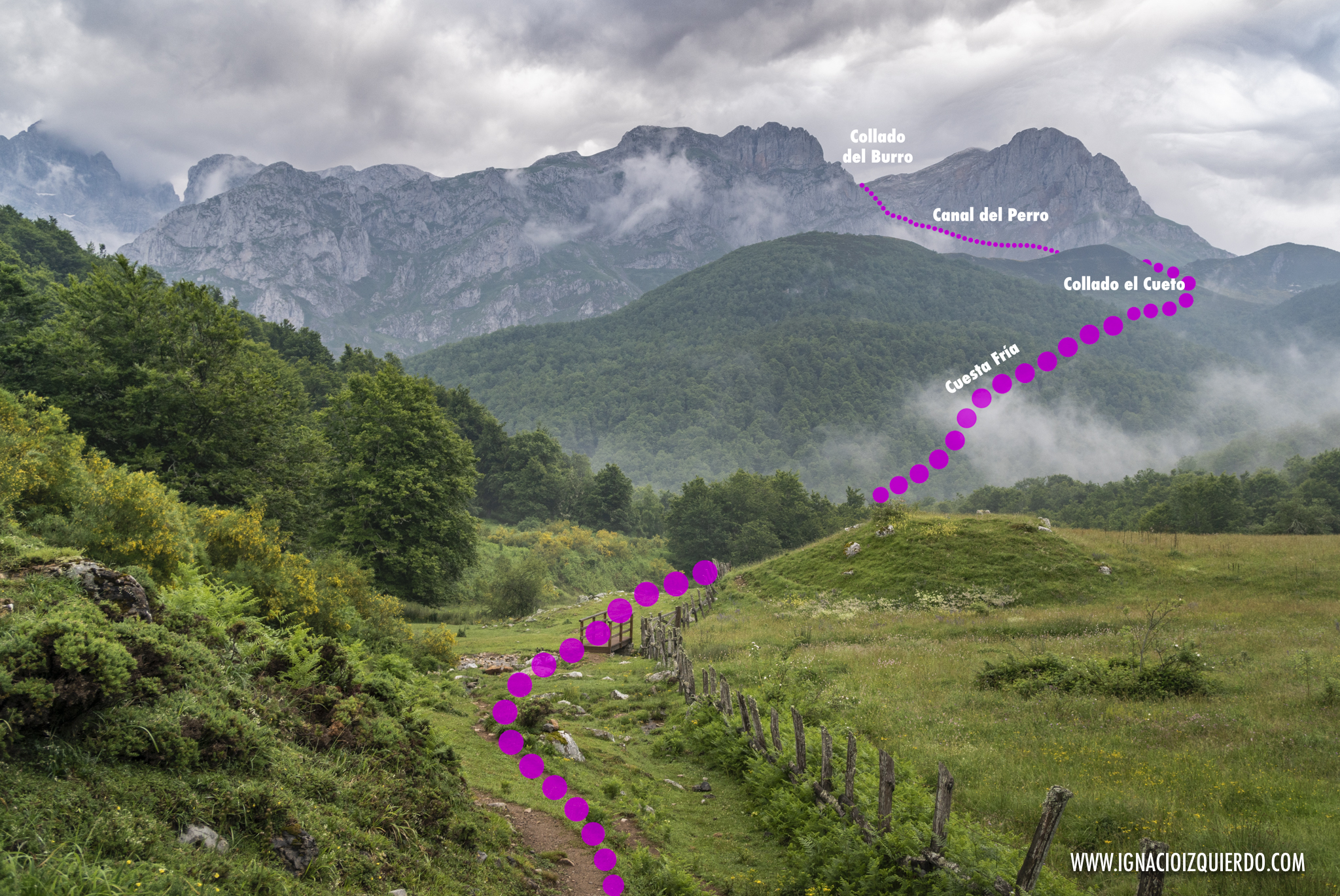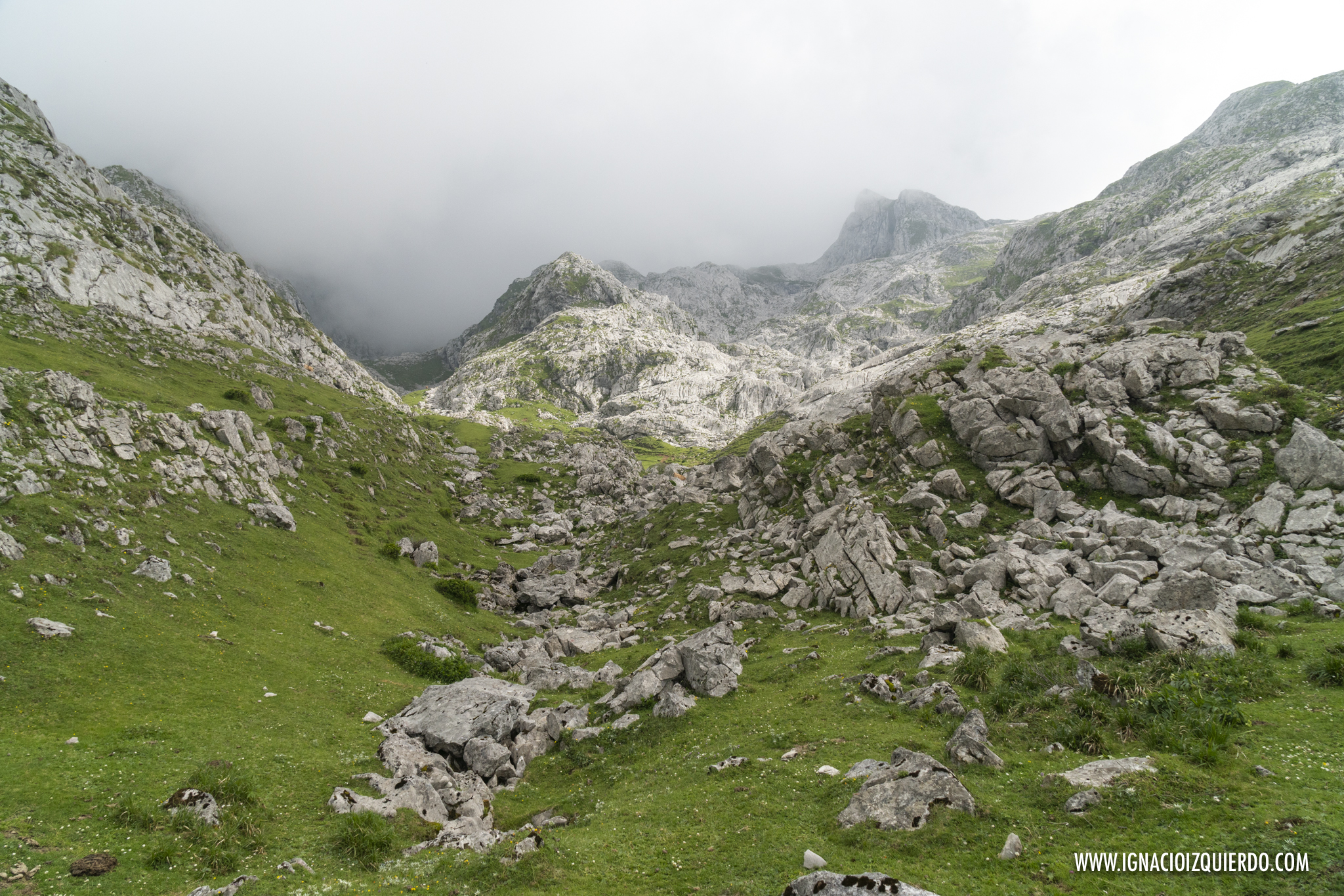 Tuve un paréntesis de nubes al salir del hayedo y alcanzar el Collado de El Cueto. Desde allí se podía reconocer el valle que iba dejando atrás y asomaban timidamente la Pica Samaya y el Pico Jairo. En algunos puntos se distinguía como una pequeña motita el refugio de Vegabaño. Fue un regalo de vistas que tan pronto como vino se fue. La niebla volvió a envolverme. Era un aviso. No te despistes, no te entretengas, la etapa de hoy es dura, déjate de fotos y a patear. Asentí para mis adentros. Tocaba despedirse del Valle de Valdeón y seguir subiendo por un Canal, el del de Perro que tras el velo de la niebla, solo se podía intuir.