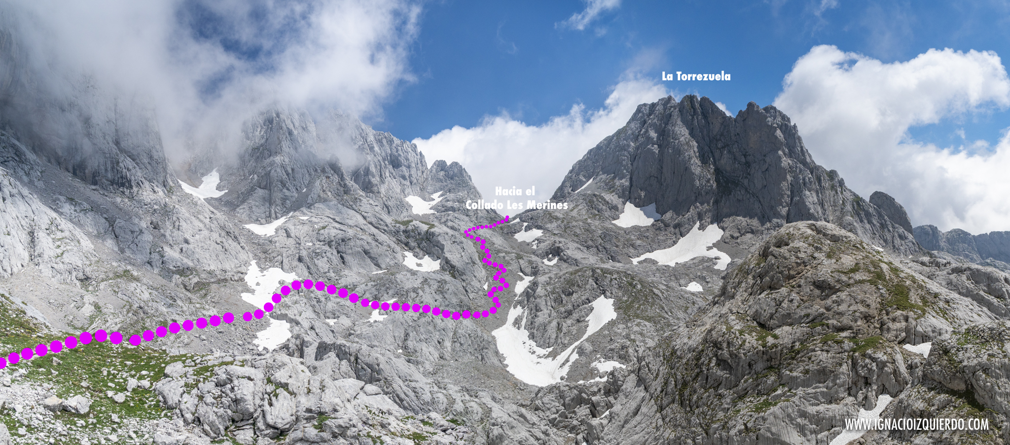 Tocaba bordear la característica Aguja del Corpus Christi para adentrarse en la pedrera de Las Lleronas, un tramo inmenso, nada cómoda de caminar y por donde la ruta se mimetiza en demasiadas ocasiones con el resto de rocas. Ascendía poco a poco, con el esfuerzo trabajoso de las rocas que se arrastran con los el caminar. Lo bordeé hasta alcanzar, manos mediante en unas cuantas ocasiones, el alto de la la Horcada de Pozas.