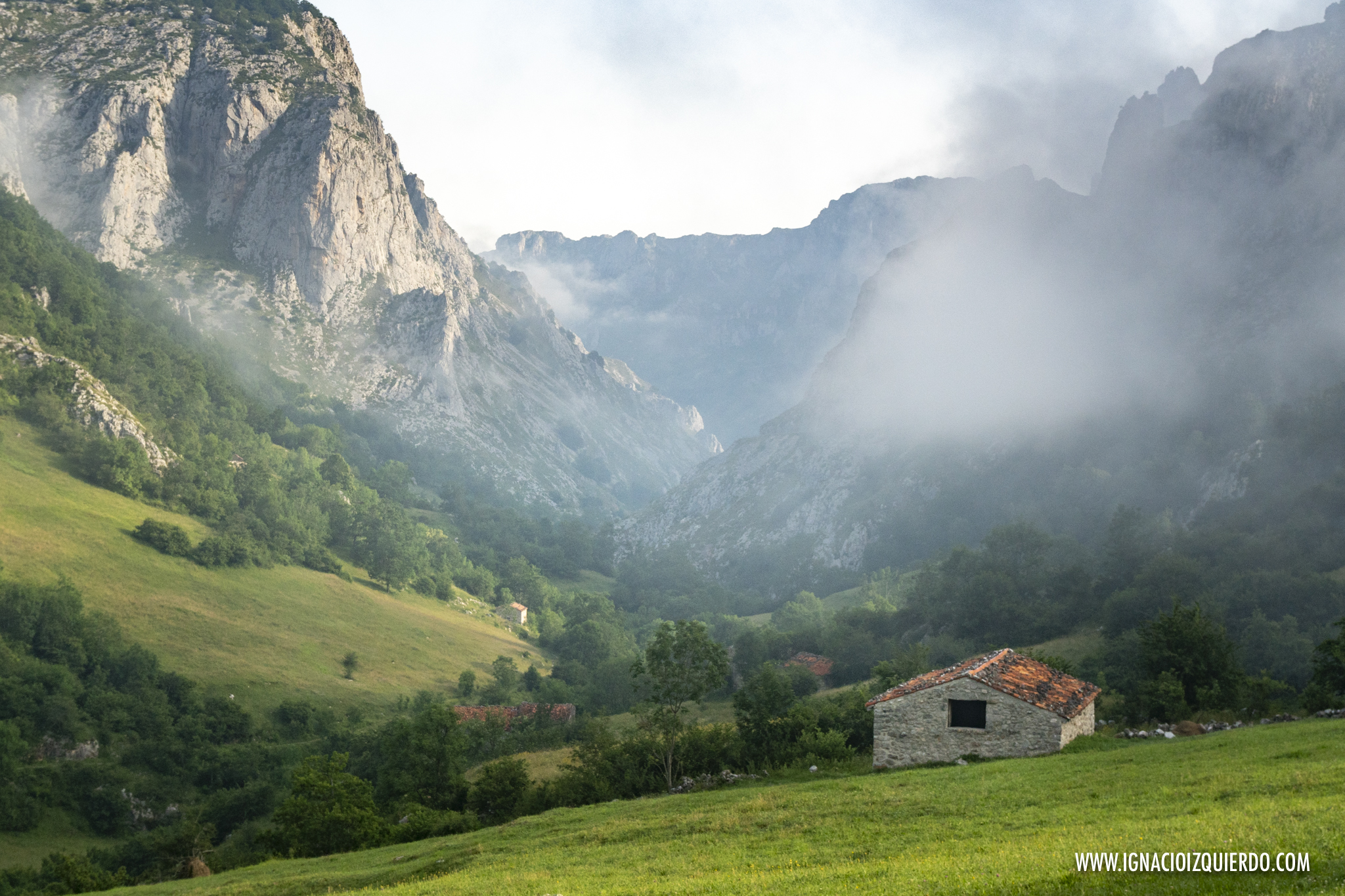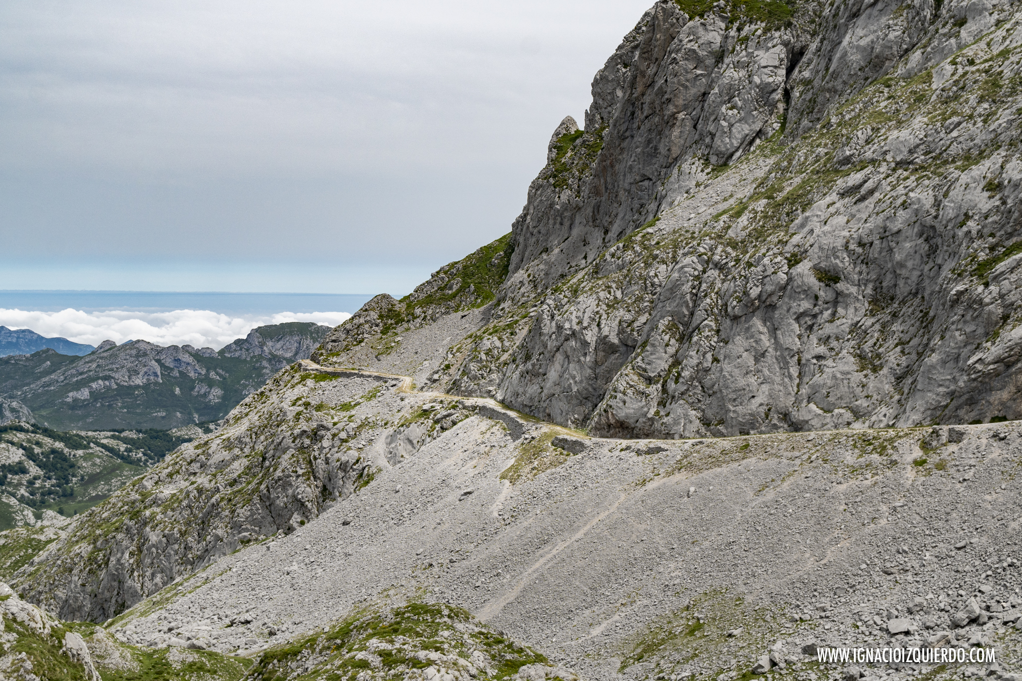 La mañana era fresca, soleada y agradable de caminar, con una primera parte de bajada una vez se atravesaba el collado de Pandébano, cruzando un sencillo parking (el más cercano para todo aquel que quiera acercarse al Picu Urriellu) antes de lazarse al vacío en una carretera zigzageante que descendía a toda velocidad hasta llegar a los Invernales del Cabao, una serie de refugios construidos por pastores para protegerse del frío y guardar en ganado en las épocas invernales. Me puedo imaginar que quien haga el recorrido en sentido contrario no olvidará con fácilidad esa subida. Supongo que por eso muchos optan por acercarse con el coche hasta el parking aunque sea desde Sotres.