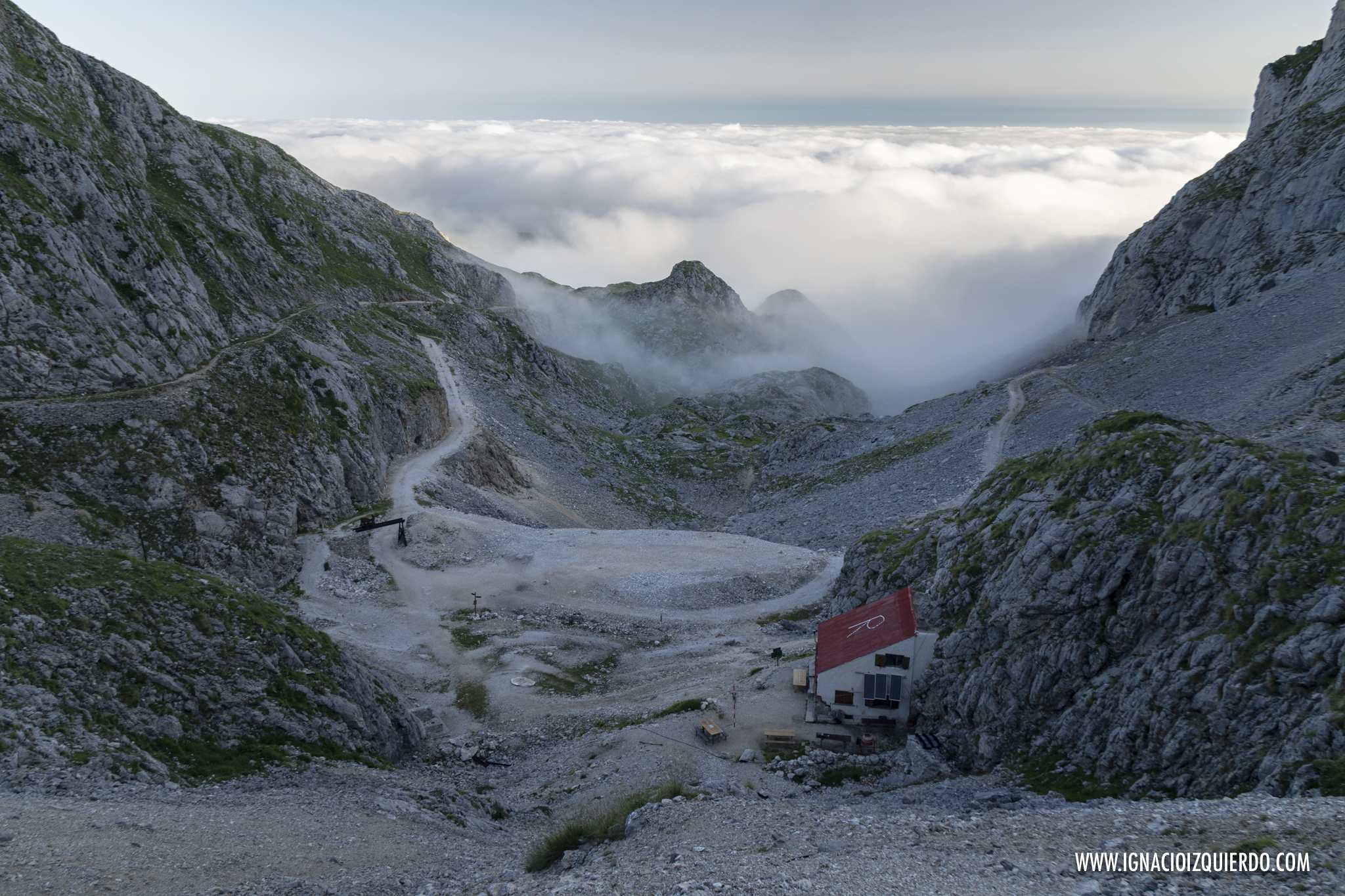 Pero no era momento de quejarse, amigo Sancho. Habría que caminar más despacio y habría que hacer cuantas paradas fueran necesarias. Esperaba que la cosa no se complicase y que las 8 horas teóricas no se me alargaran hasta el infinito de los tiempos, pero tenía una bajada complicada, la de la Canal de Jidiello a la que temía bastante. Ya me preocuparía de ese punto cuando tocará porque la primera impresión del día no era sino la de la niebla cerrada que envolvía al Casetón de Ándara.