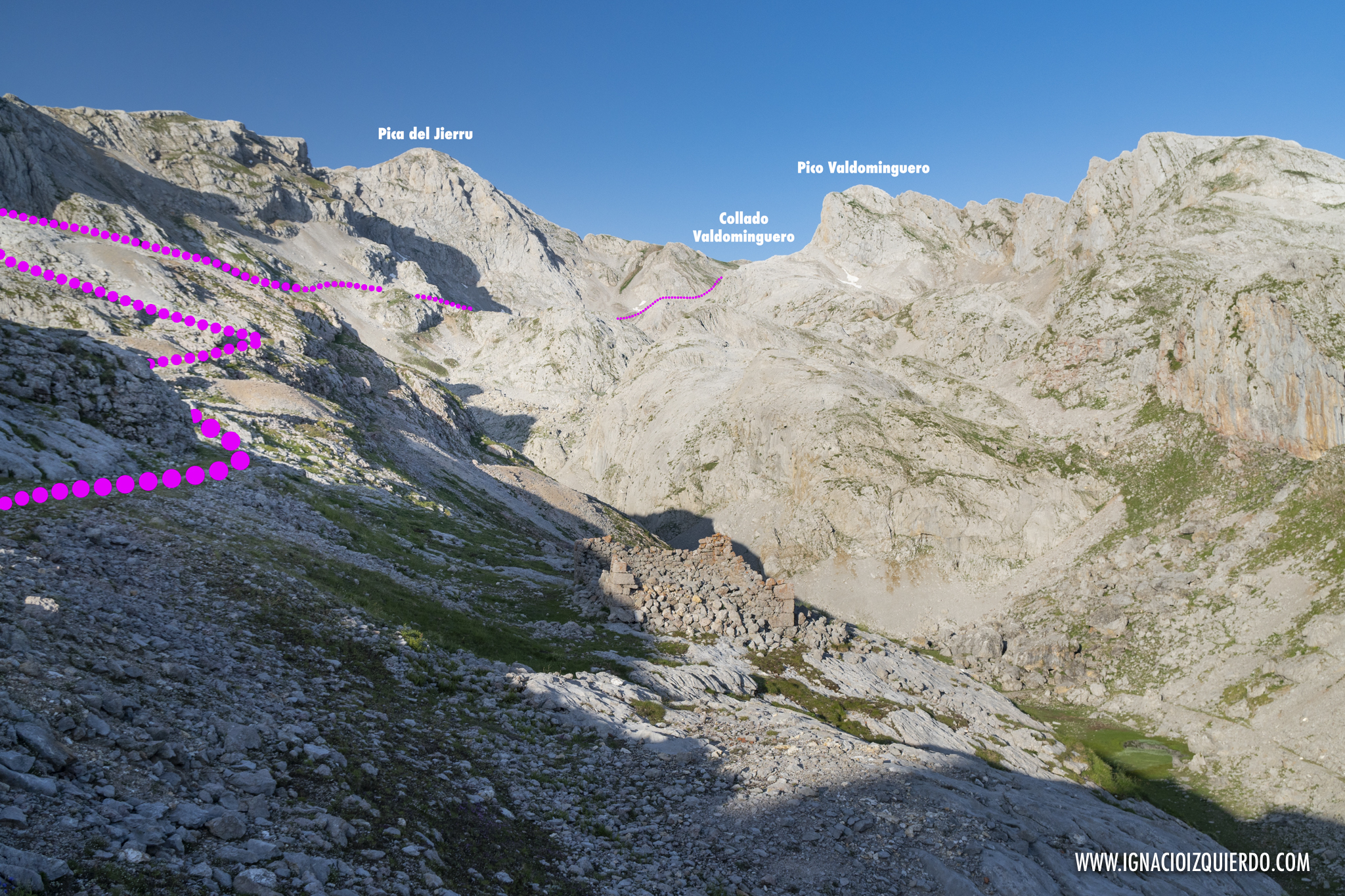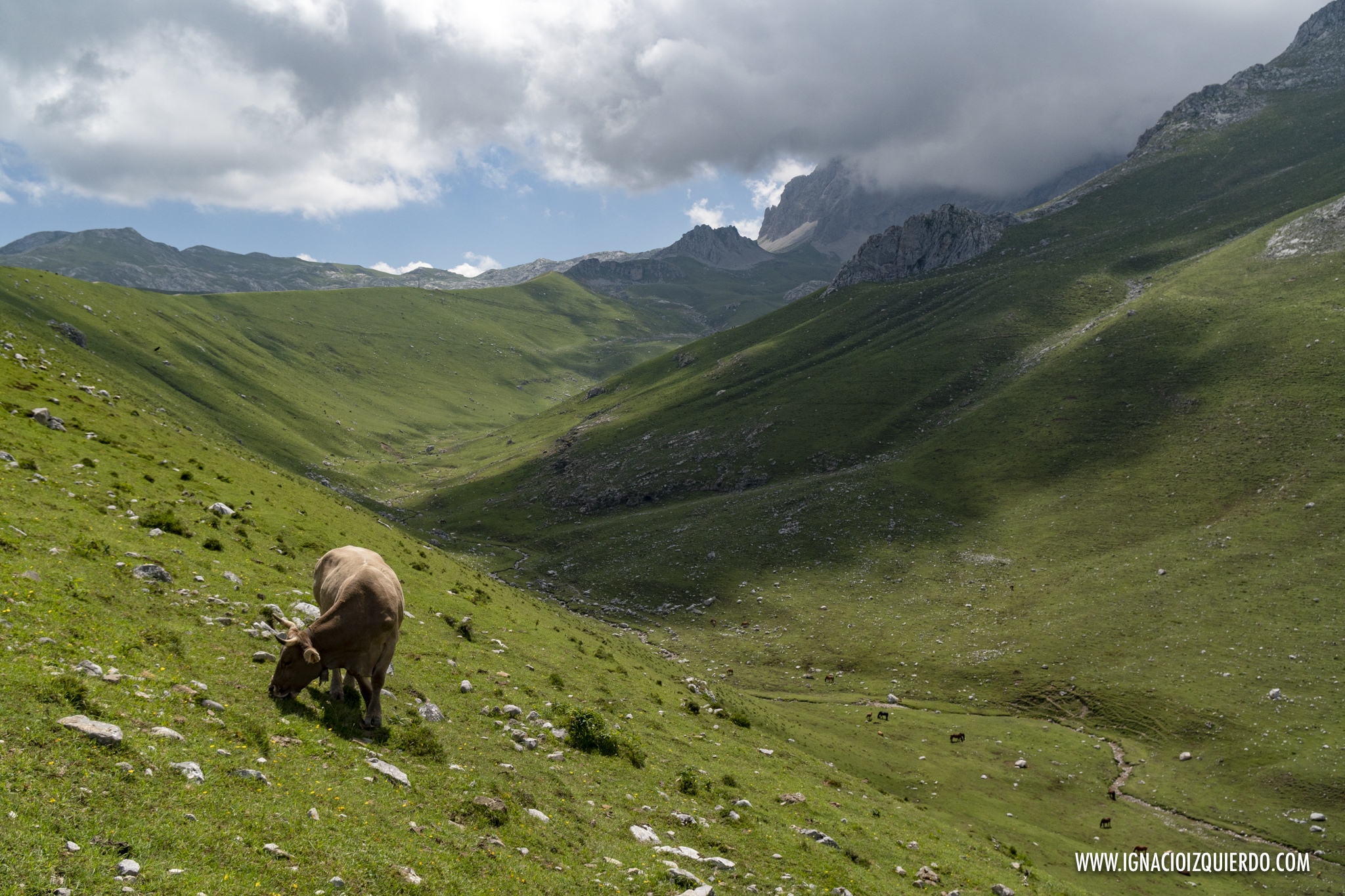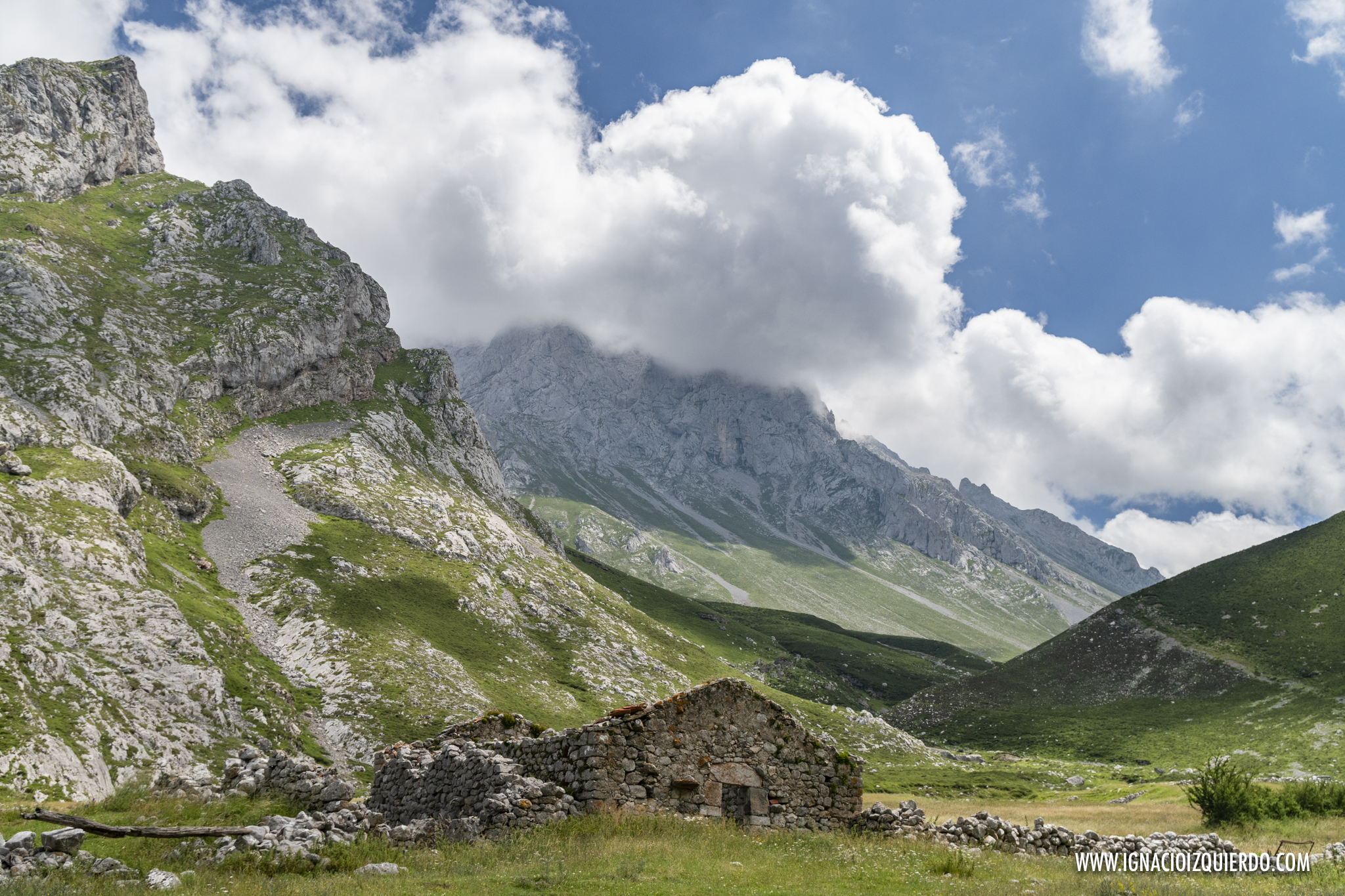 Atravesé los Invernales de Vegas de Sotres y comencé la subida lenta, interminable bajo un sol de medio día que castigaba sin miramientos. No había muchas almas más caminando por allí y si a lo largo del día las había habido, deberían haber pasado por allí antes de que ese valle se hubiera convertido en un horno. Valle, que por cierto, era muy sencillo de identificar como valle glacial, formando la enorme «u», suave y poco abrupta que los caracteriza. Era el resultado de las labores de escultor paciente que fue el hielo masivo que cubrió esta zona. Pero el hielo solo podía imaginarlo, mientras sudaba y caminaba ascendiendo por lo que era la cresta de la morrena que se conoce como Llomba de Toro. Allí al final, medio escondido en el pliegue de una colina estaba el Refugio Hotel de Áliva.