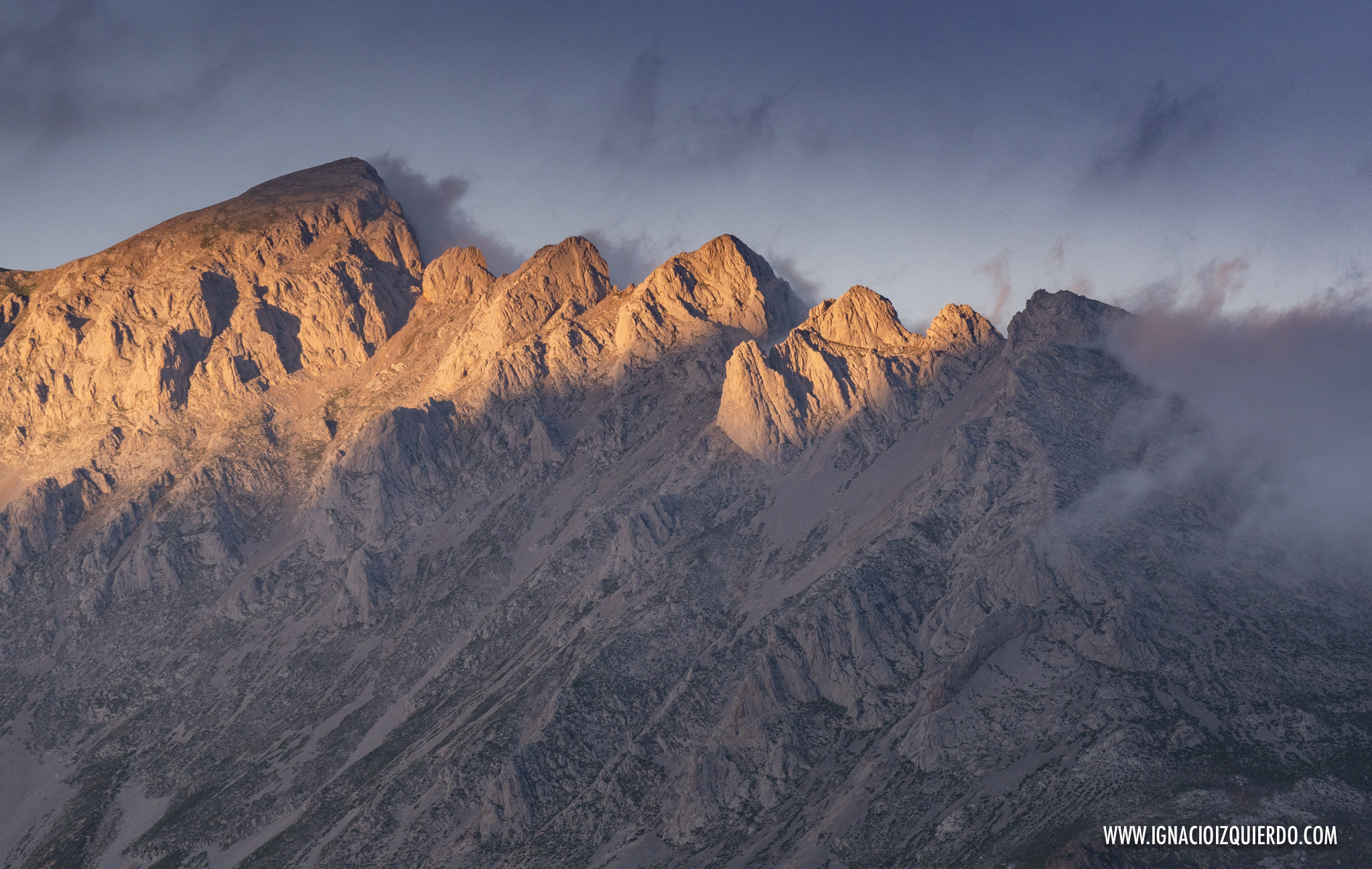 El macizo de Ándara se mantuvo cubierto por las nubes casi toda la jornada, hasta que decidió que el mejor momento para despejarse era cuando yo estaba dándome al deglute de la cena sin esperanza ya de ver esos picos. Pasé de cenar a engullir y salí corriendo, con ambos carrillos llenos, a retratar la montaña como buenamente pude. El hamster fotógrafo. Mereció la pena.