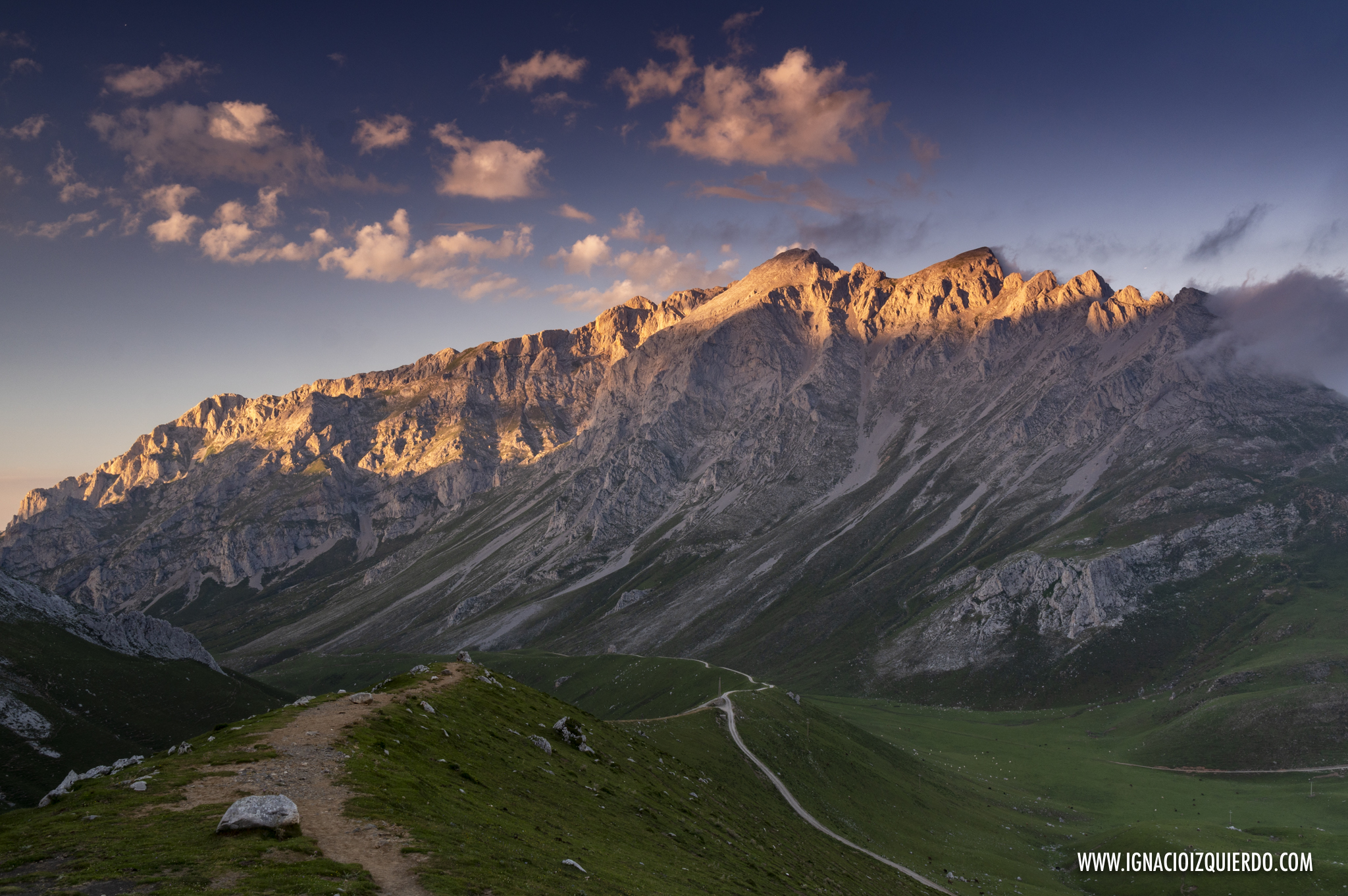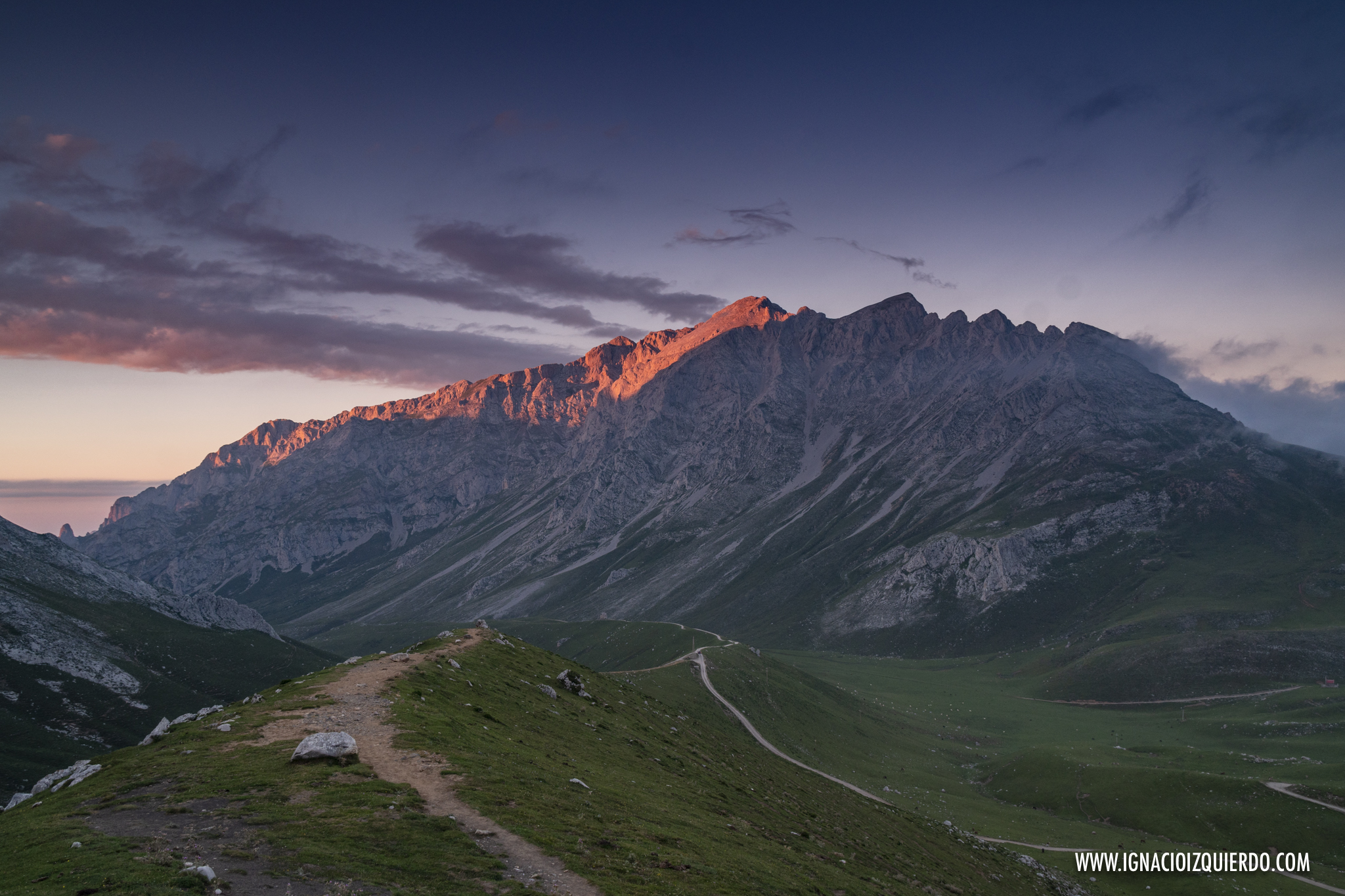 Allí estaban, sonrojándose cada vez más con el rubor del atardecer el Pico Cortés, La Morra de Lechugales y algo más lejos casi escondida la Pica del Jierru. En el fragor de la carrera es pos de la fotografía había salido en chanclas y mal abrigado, así que mientras el sol iba desapareciendo también iba yo perdiendo el ánimo. Aguanté, sin embargo, hasta que el sol terminó por desaparecer y entonces fui yo el que lo hizo, en búsqueda del calor de una cama y unas mantas que me había ganado con creces.