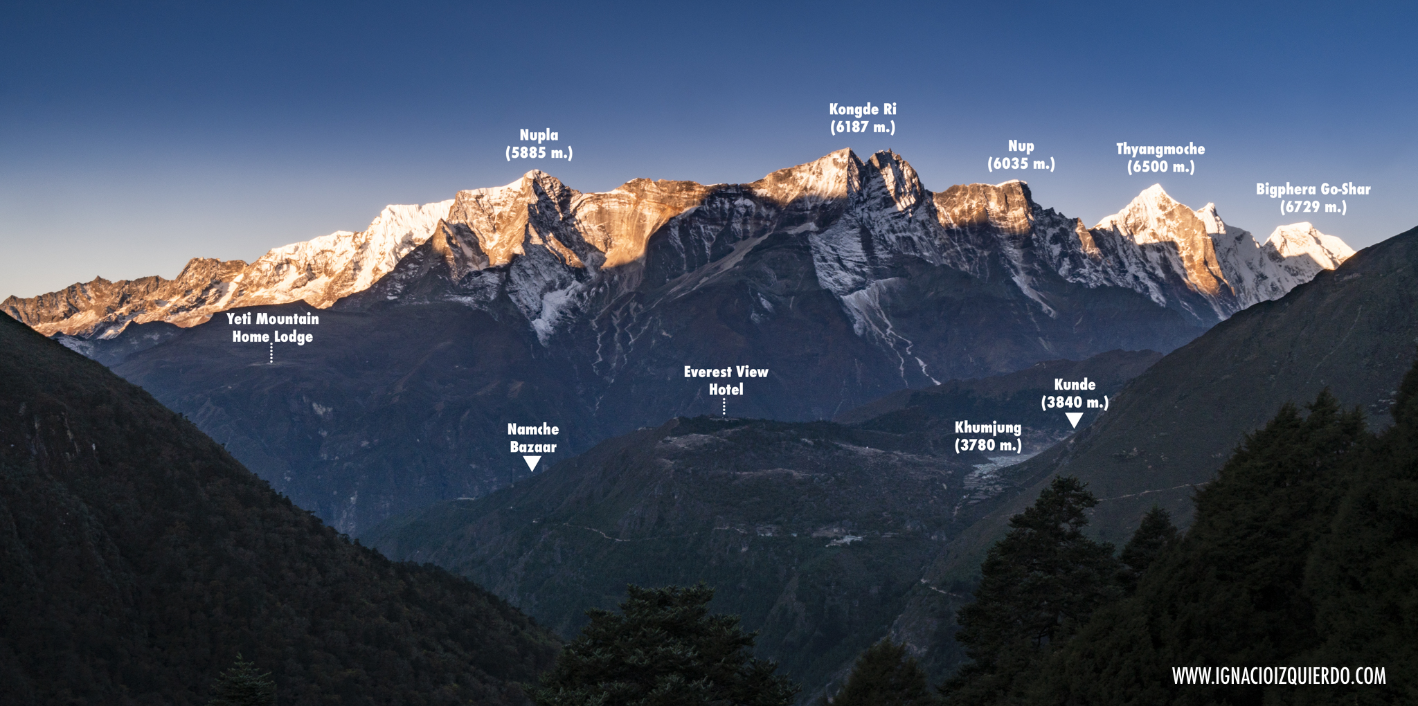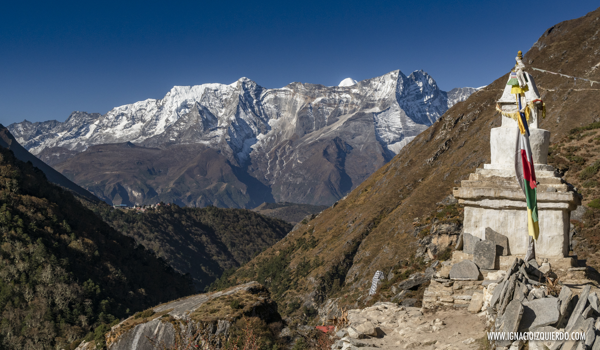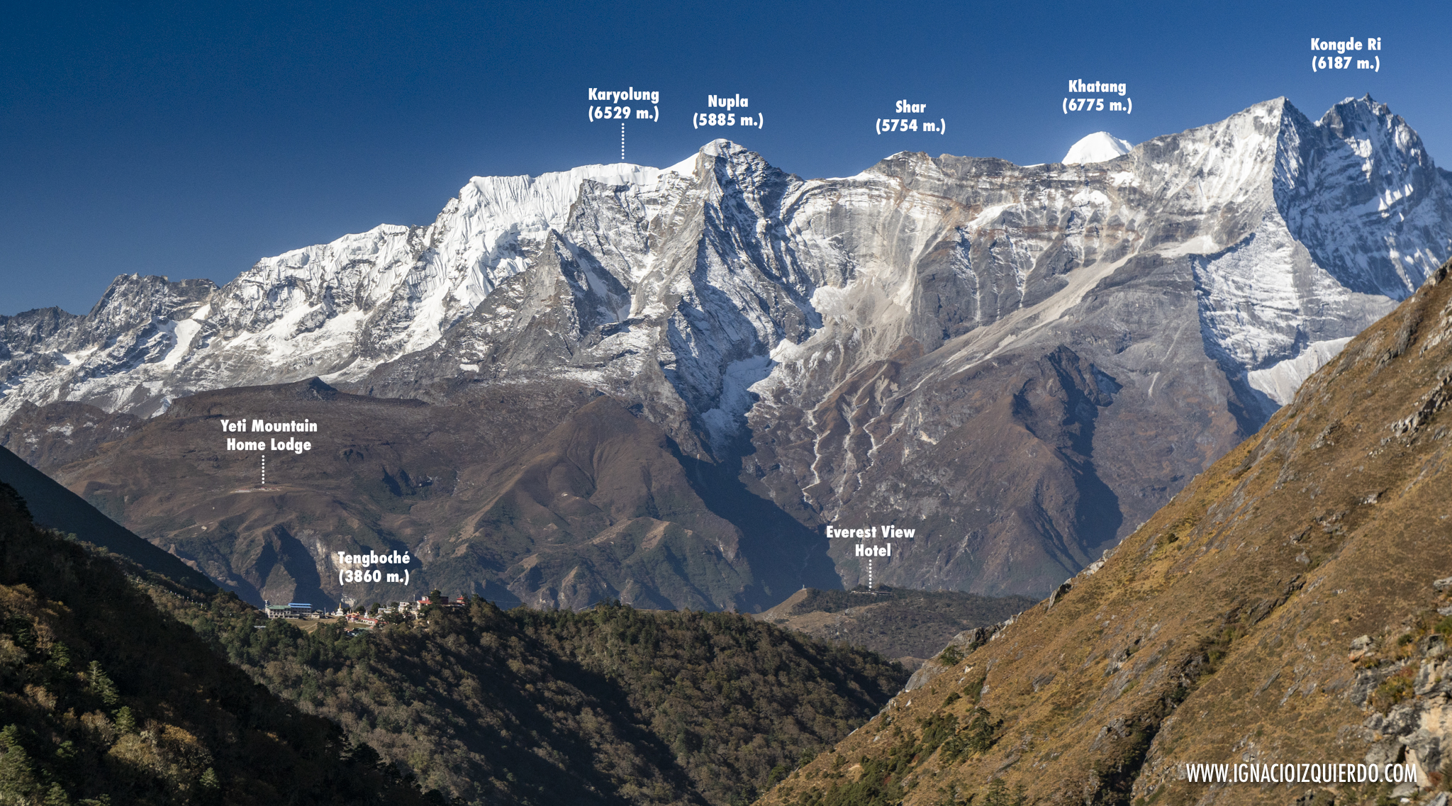 En algún punto de la subida nos alcanzó al fin el sol y al mirar atrás la vista del valle volvía a ser un regalo. Impoluta de nubes y con el macizo de Kongde más impresionante que nunca, con dos nuevos picos de más de 6500 metros mostrándose tras su primera fila de roca. El Karyolung (6529 m.) cuya cima se había mantenido oculta todos estos días tras el Nupla y la cumbre perfectamente nevada del Khatang (6775 metros), un pastelito de nata helada que surgía de entre las montañas. También valía para ir identificando al resto y ver en la lejanía el monasterio de Tengboché que habíamos dejado apenas una hora antes. (En el orden de las cosas que voy descubriendo a posteriori, se podía ver el Yeti Mountain Home Lodge. Dejemos ese nombre en un pequeño cajón de la memoria. Será importante dentro de unas cuantas etapas.).