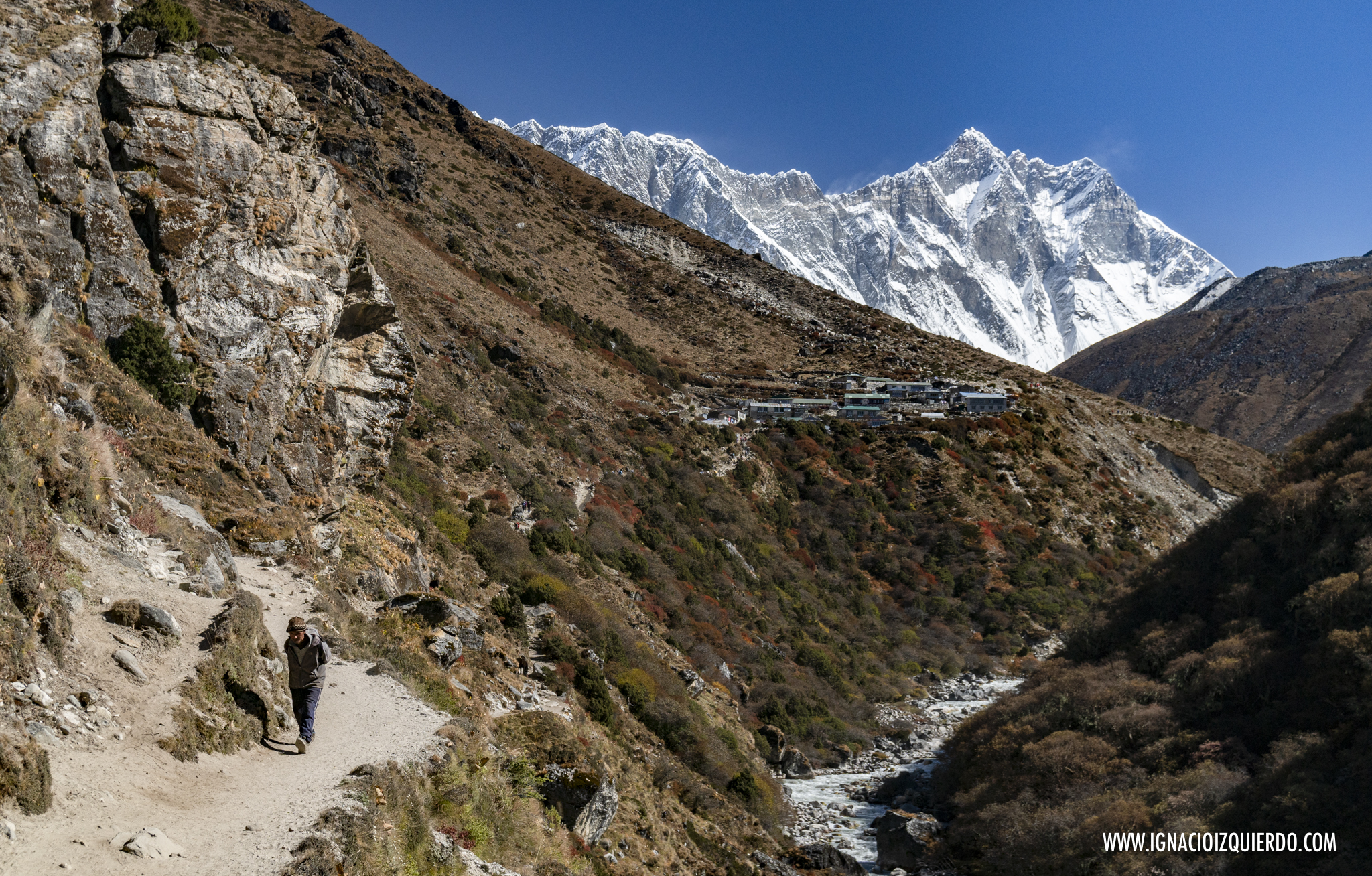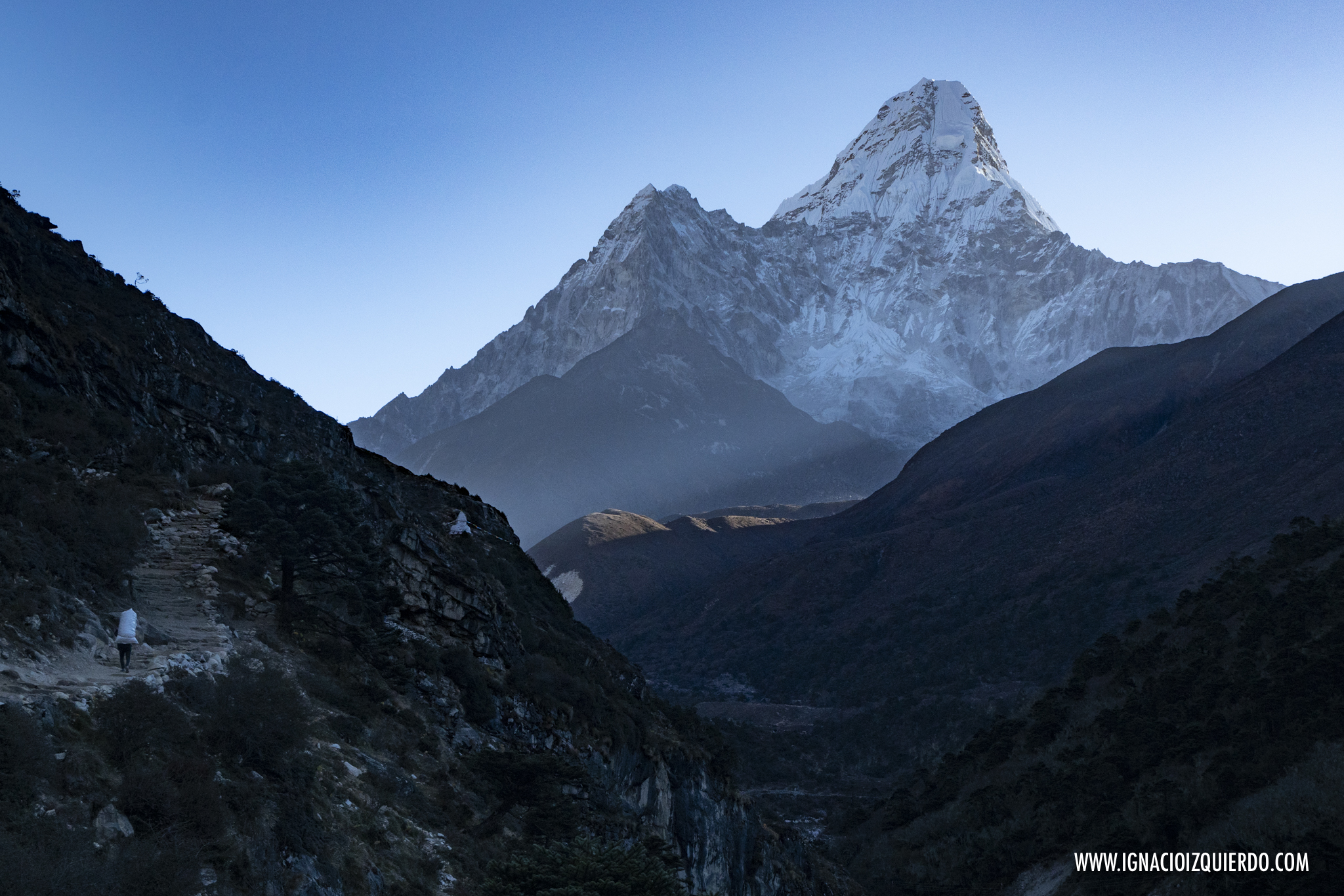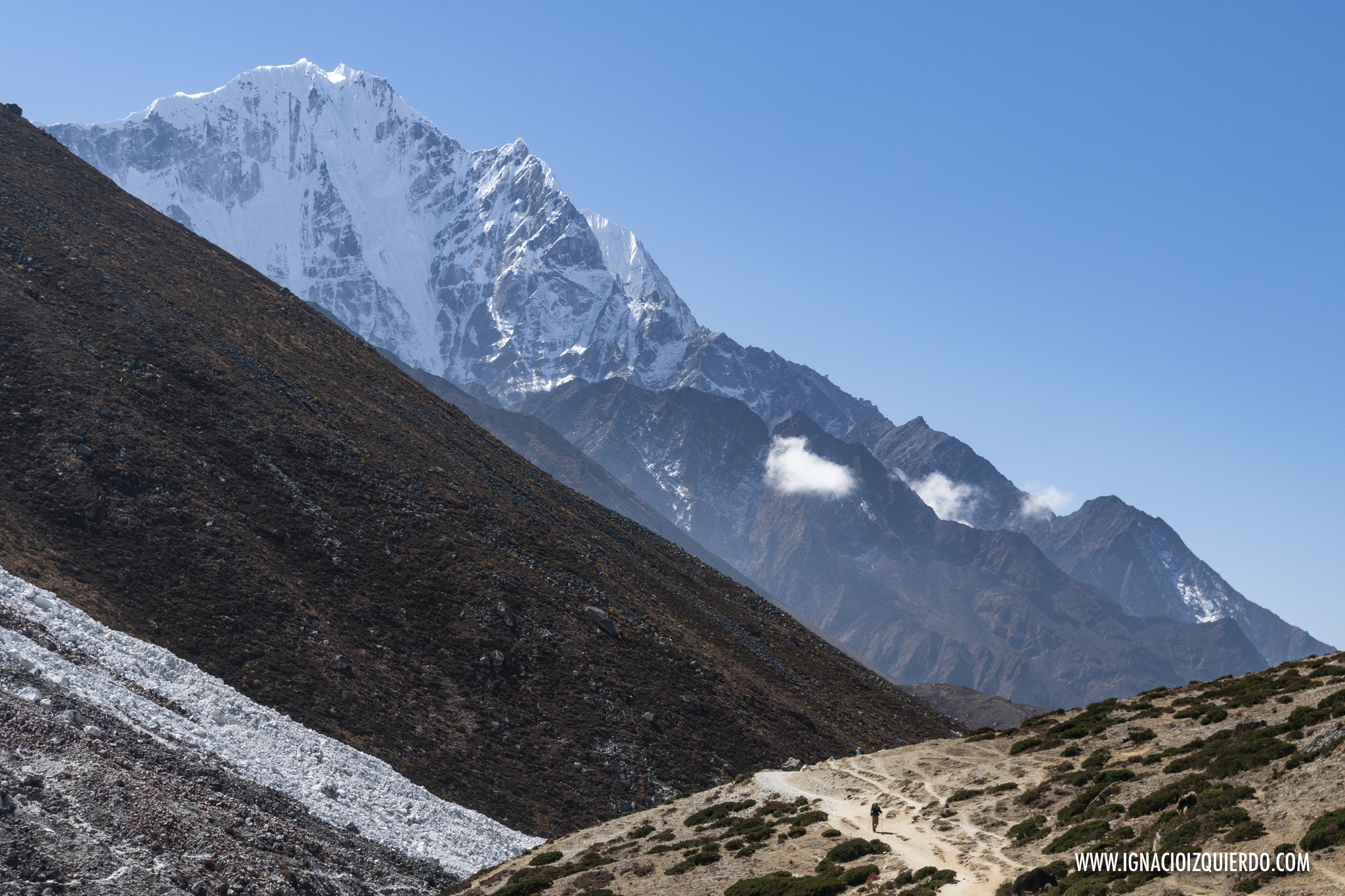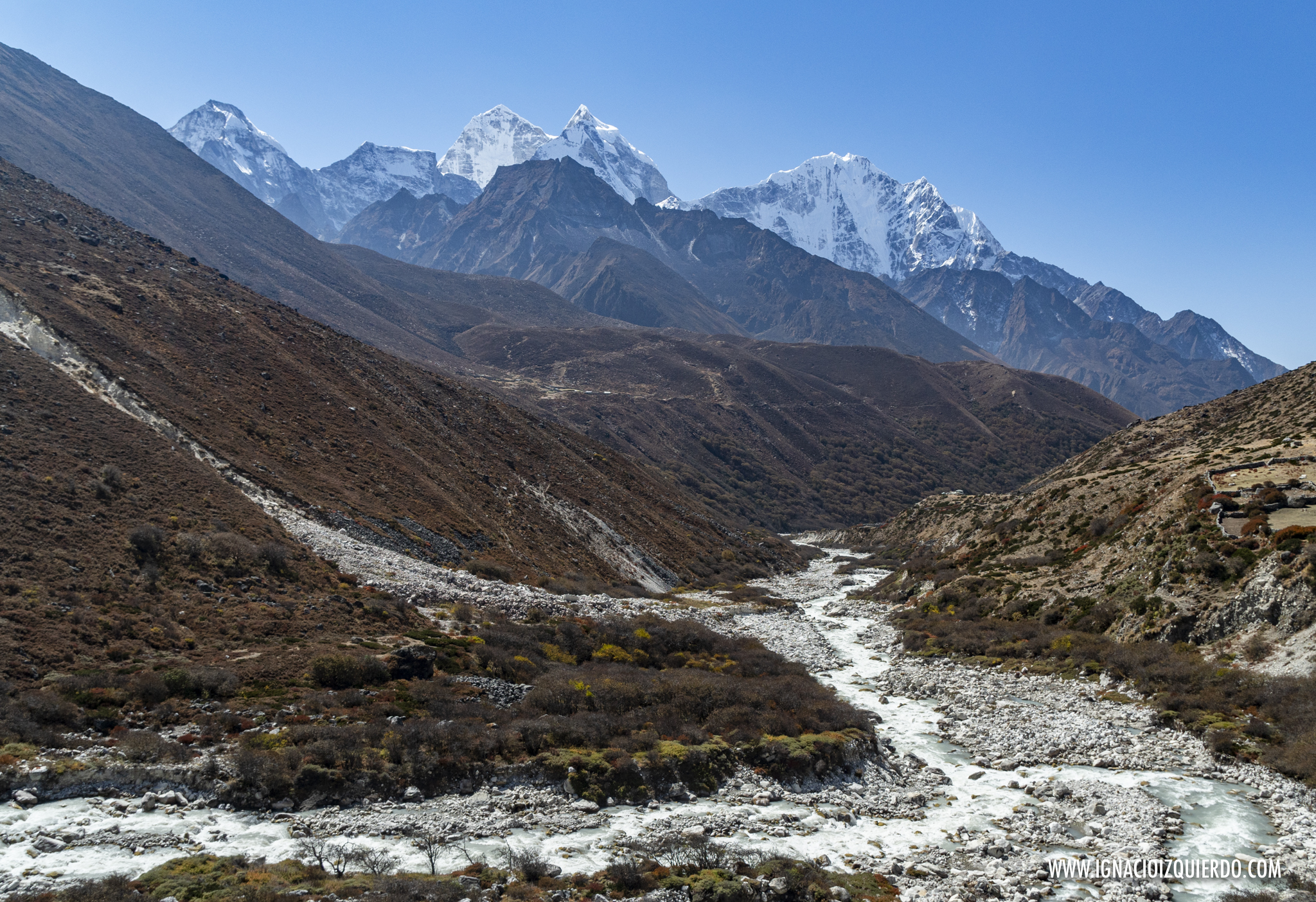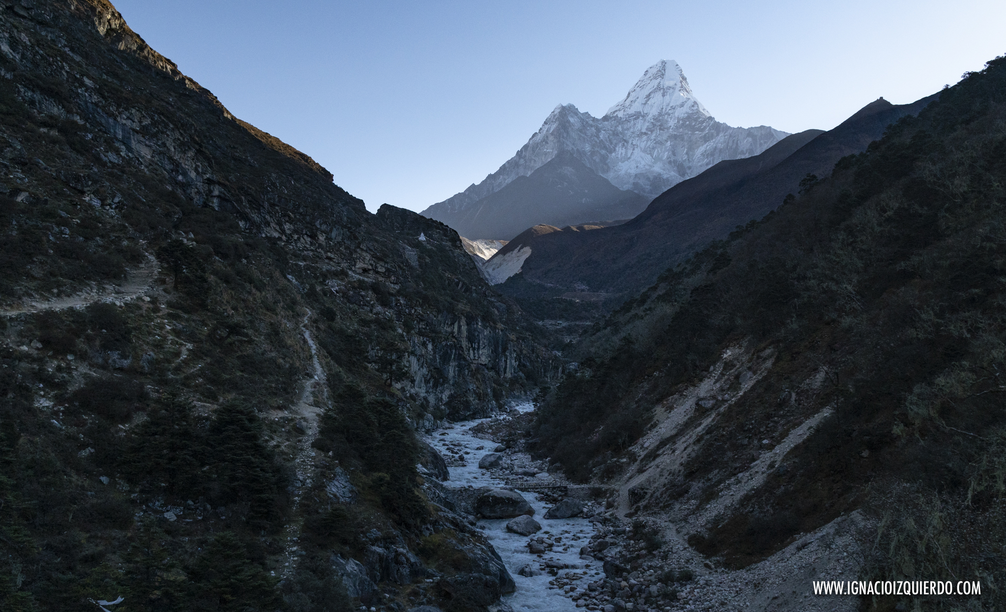 Poco a poco íbamos subiendo, caminando junto al margen del río Imja Khola. Nos habíamos separado del Dudh Koshi el día anterior al atravesar el Phunke Tenga y ahora caminábamos junto al ruido de agua recién nacida de glaciares y lo hacíamos en la sombra de los gigantes, en una garganta estrecha que ascendía sin pausa. Al fondo, en la lejanía, aparecía el Ama Dablam y mi velocidad de crucero se reducía drásticamente en el afán imposible de fotografiar todos sus ángulos, de robarle el alma con la cámara.