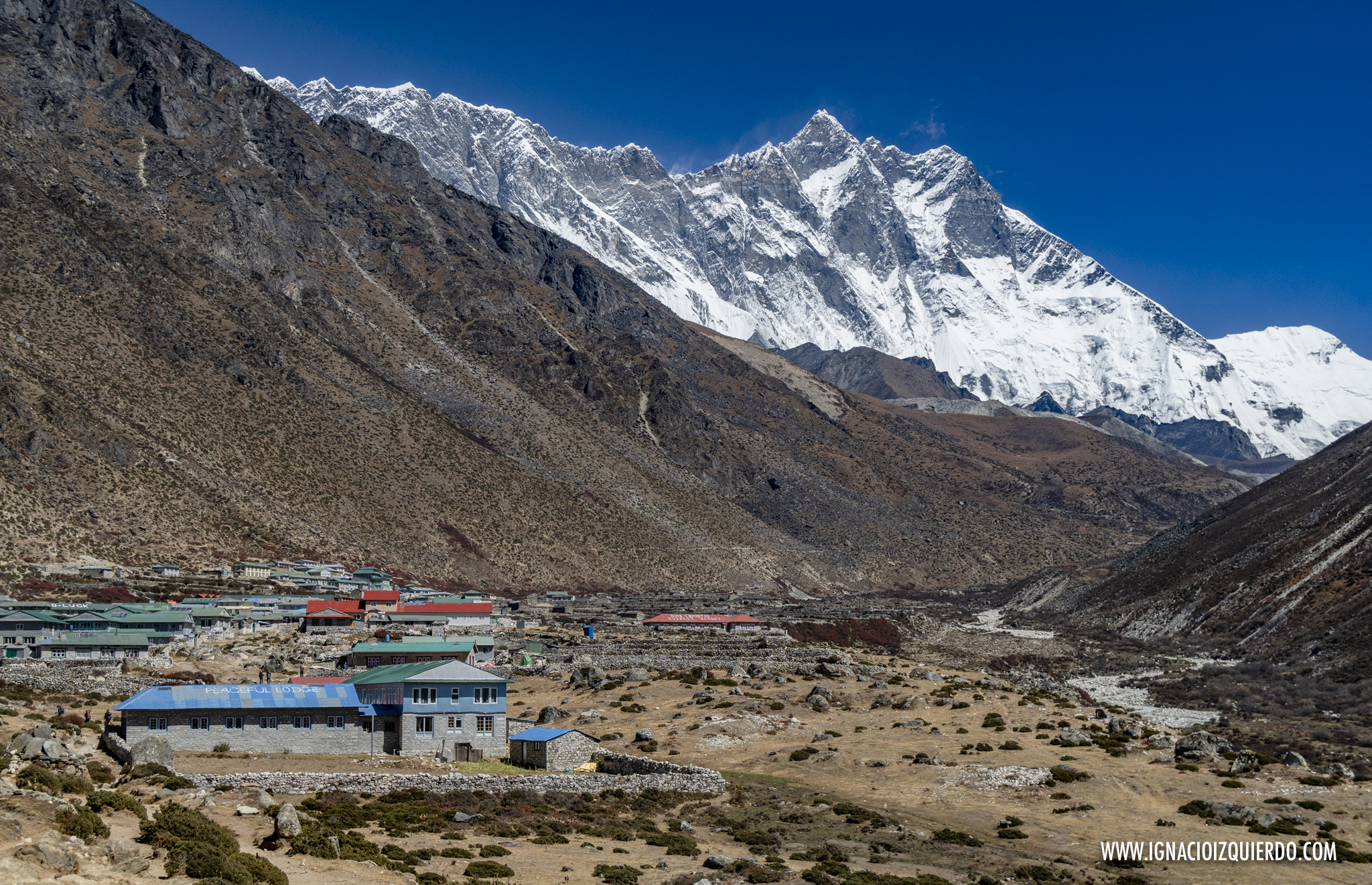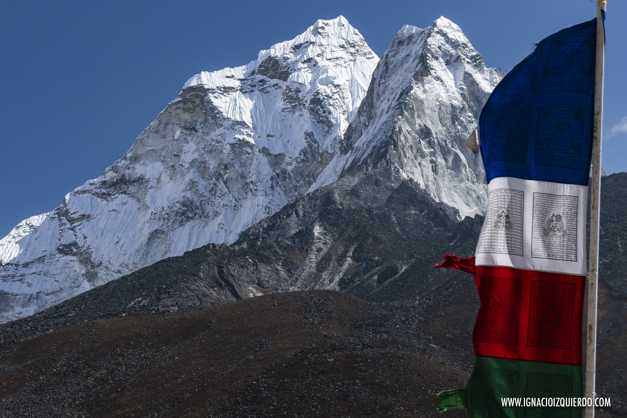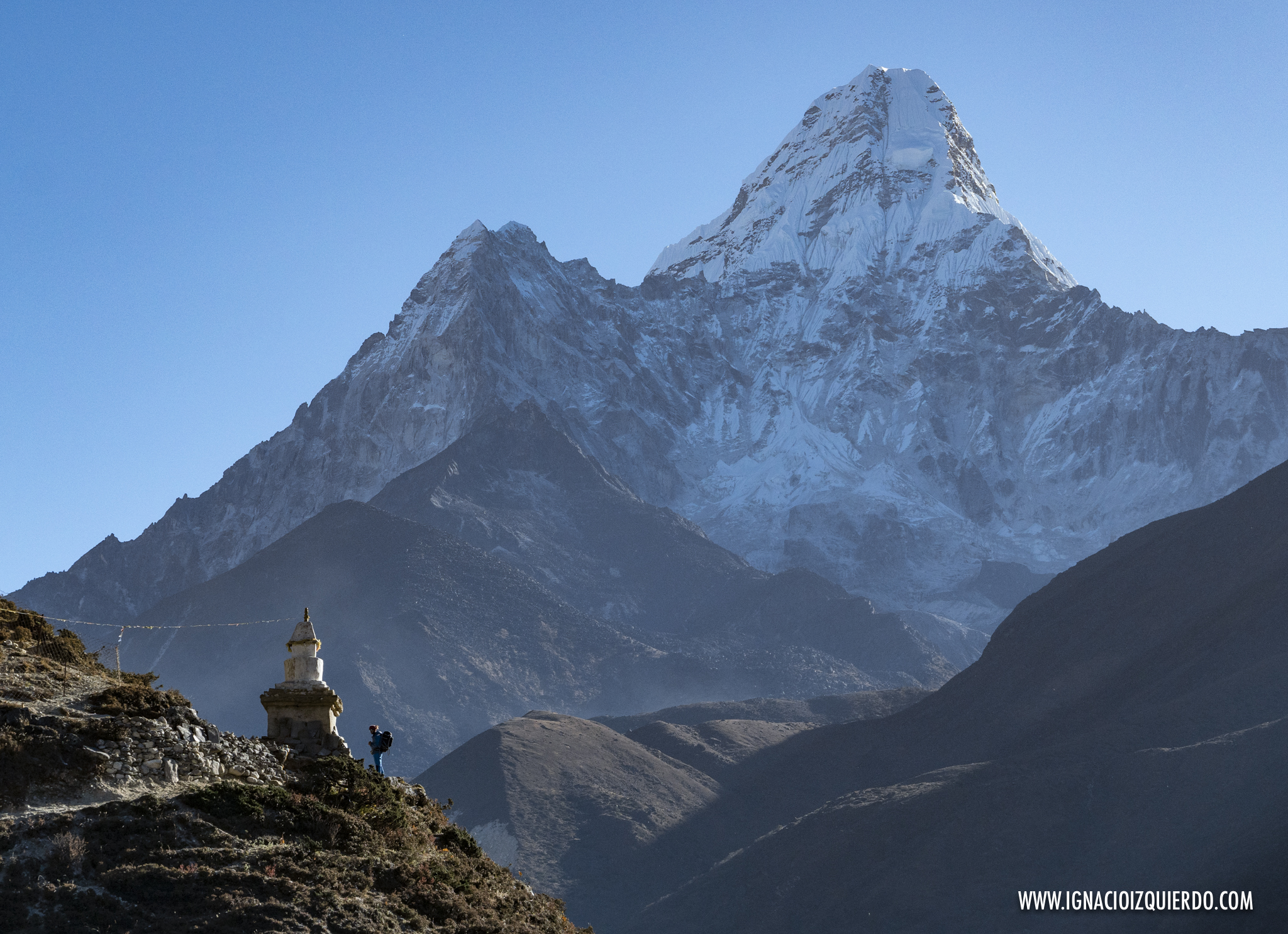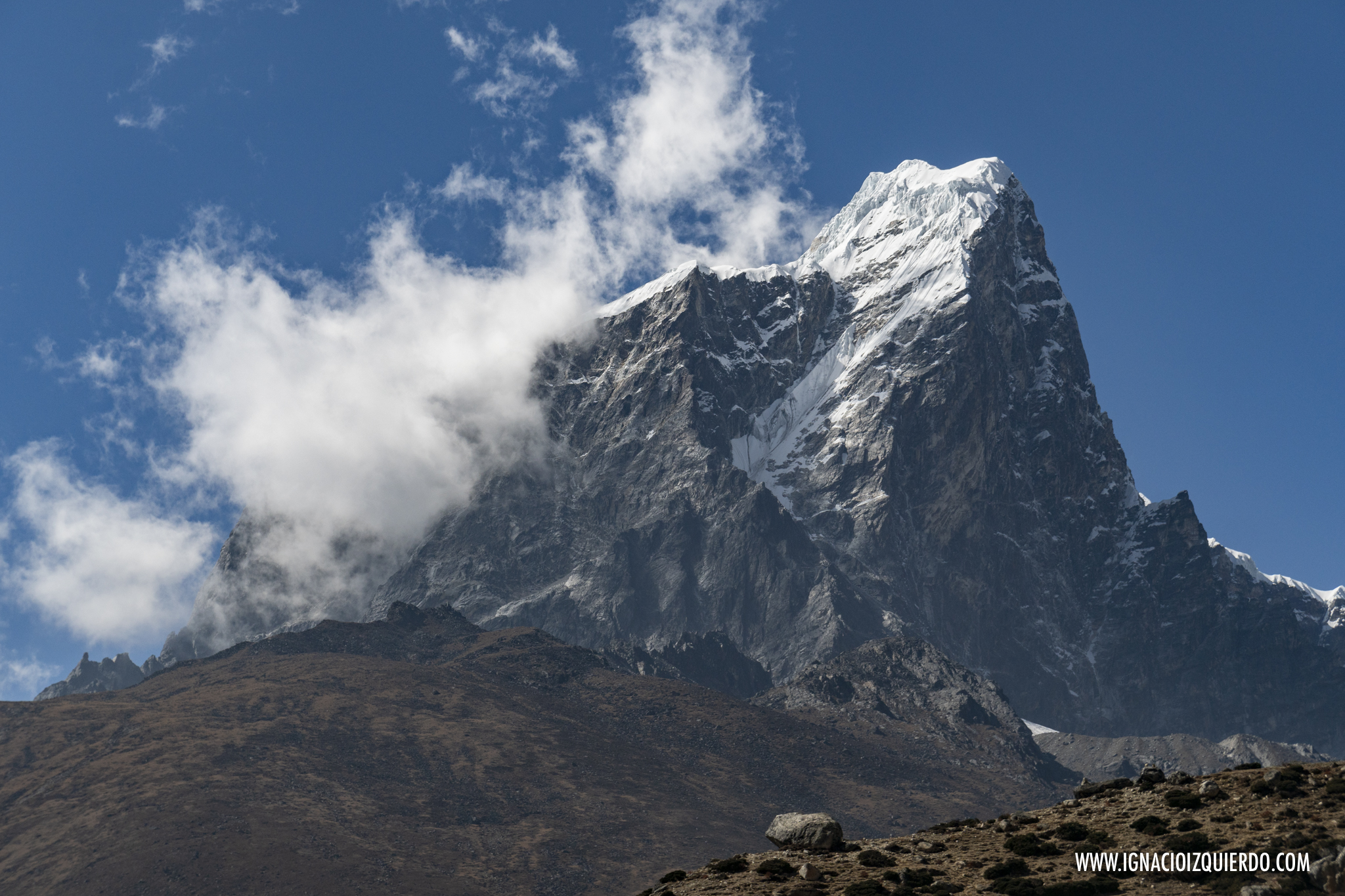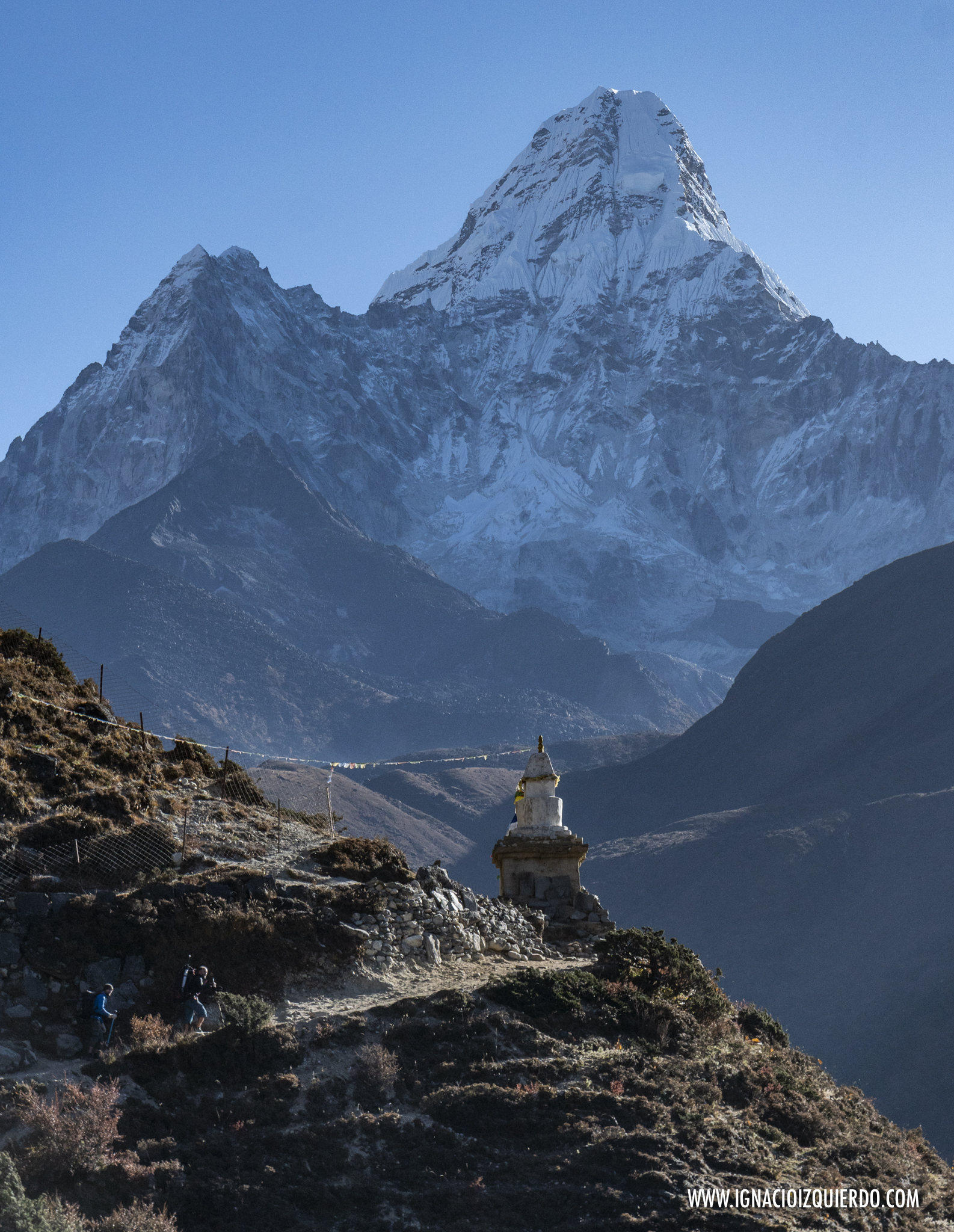 Poco a poco íbamos subiendo, caminando junto al margen del río Imja Khola. Nos habíamos separado del Dudh Koshi el día anterior al atravesar el Phunke Tenga y ahora caminábamos junto al ruido de agua recién nacida de glaciares y lo hacíamos en la sombra de los gigantes, en una garganta estrecha que ascendía sin pausa. Al fondo, en la lejanía, aparecía el Ama Dablam y mi velocidad de crucero se reducía drásticamente en el afán imposible de fotografiar todos sus ángulos, de robarle el alma con la cámara.