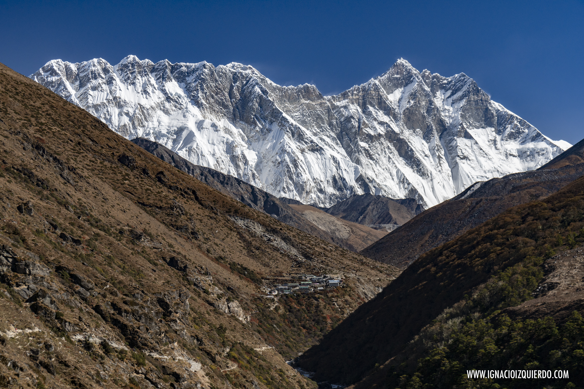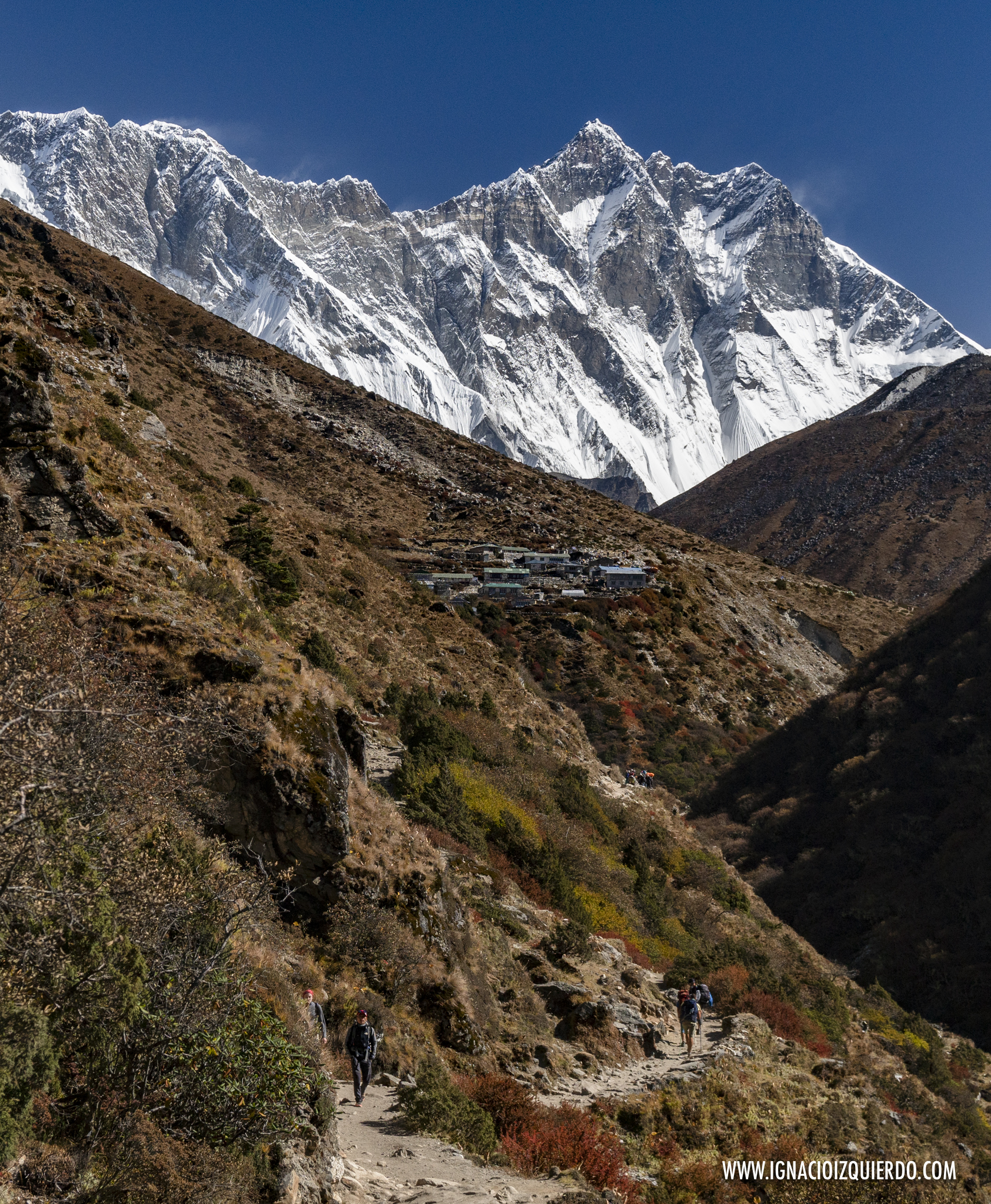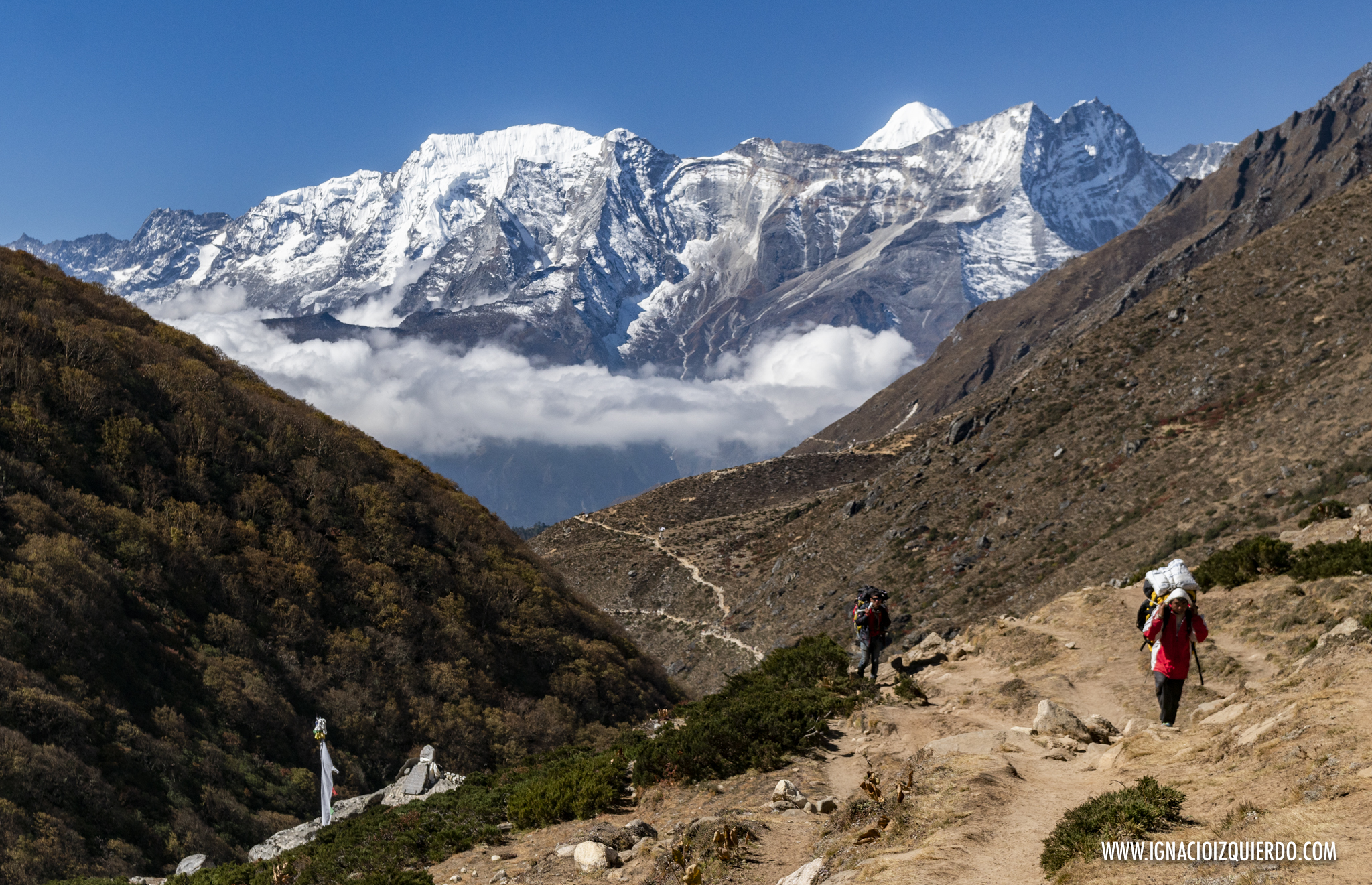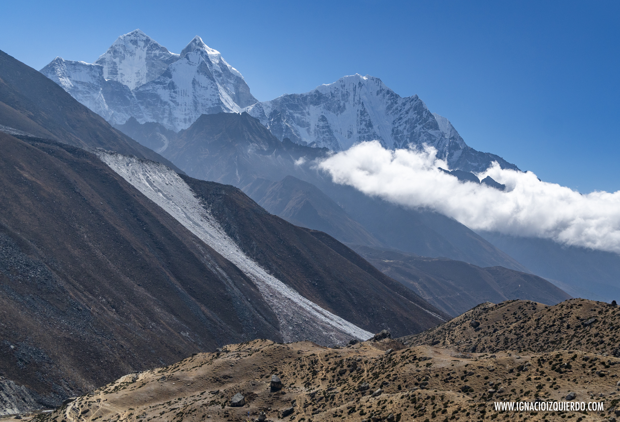 Poco a poco íbamos subiendo, caminando junto al margen del río Imja Khola. Nos habíamos separado del Dudh Koshi el día anterior al atravesar el Phunke Tenga y ahora caminábamos junto al ruido de agua recién nacida de glaciares y lo hacíamos en la sombra de los gigantes, en una garganta estrecha que ascendía sin pausa. Al fondo, en la lejanía, aparecía el Ama Dablam y mi velocidad de crucero se reducía drásticamente en el afán imposible de fotografiar todos sus ángulos, de robarle el alma con la cámara.