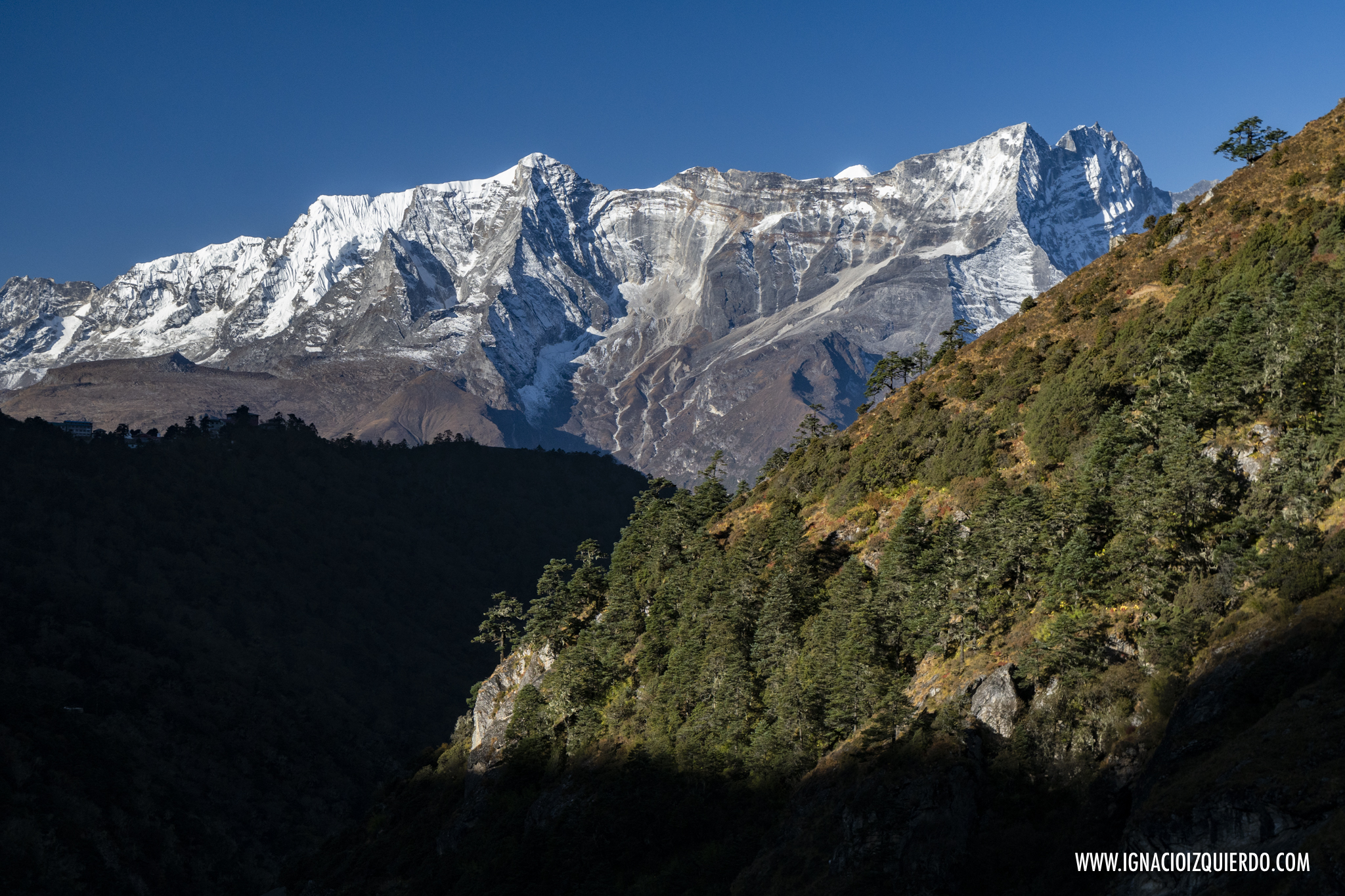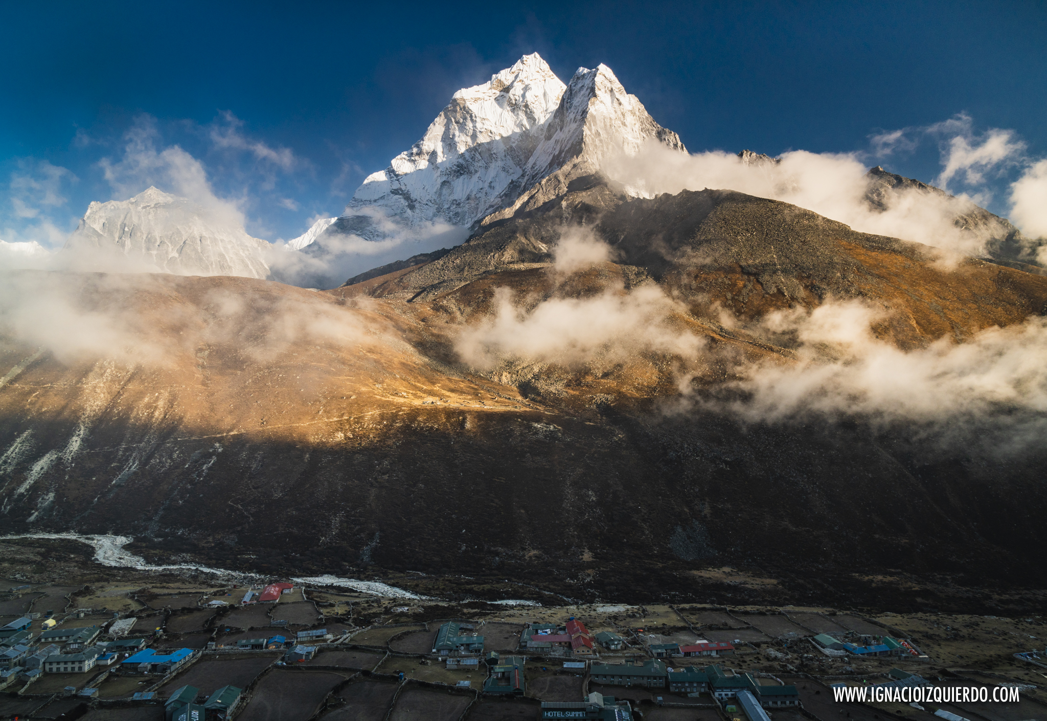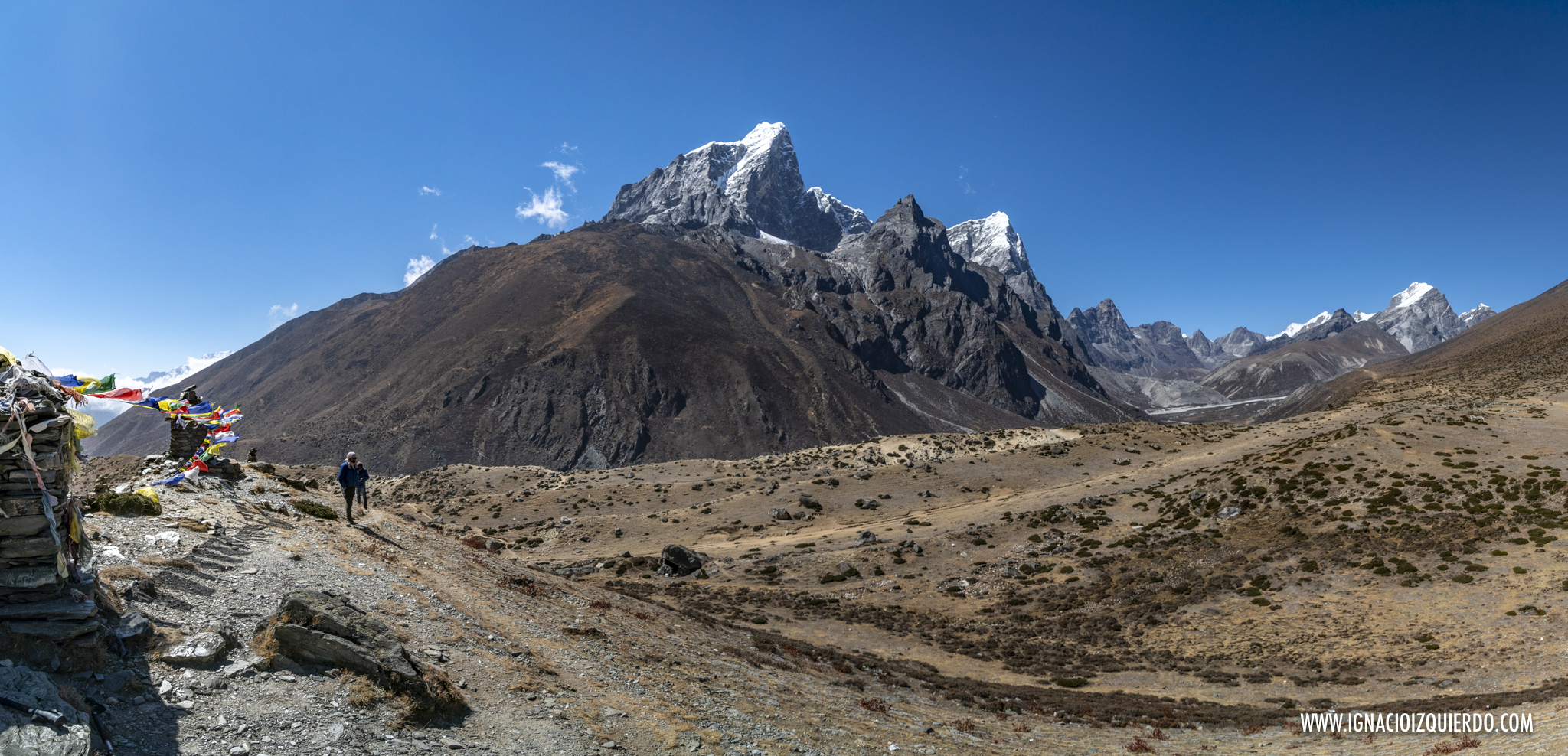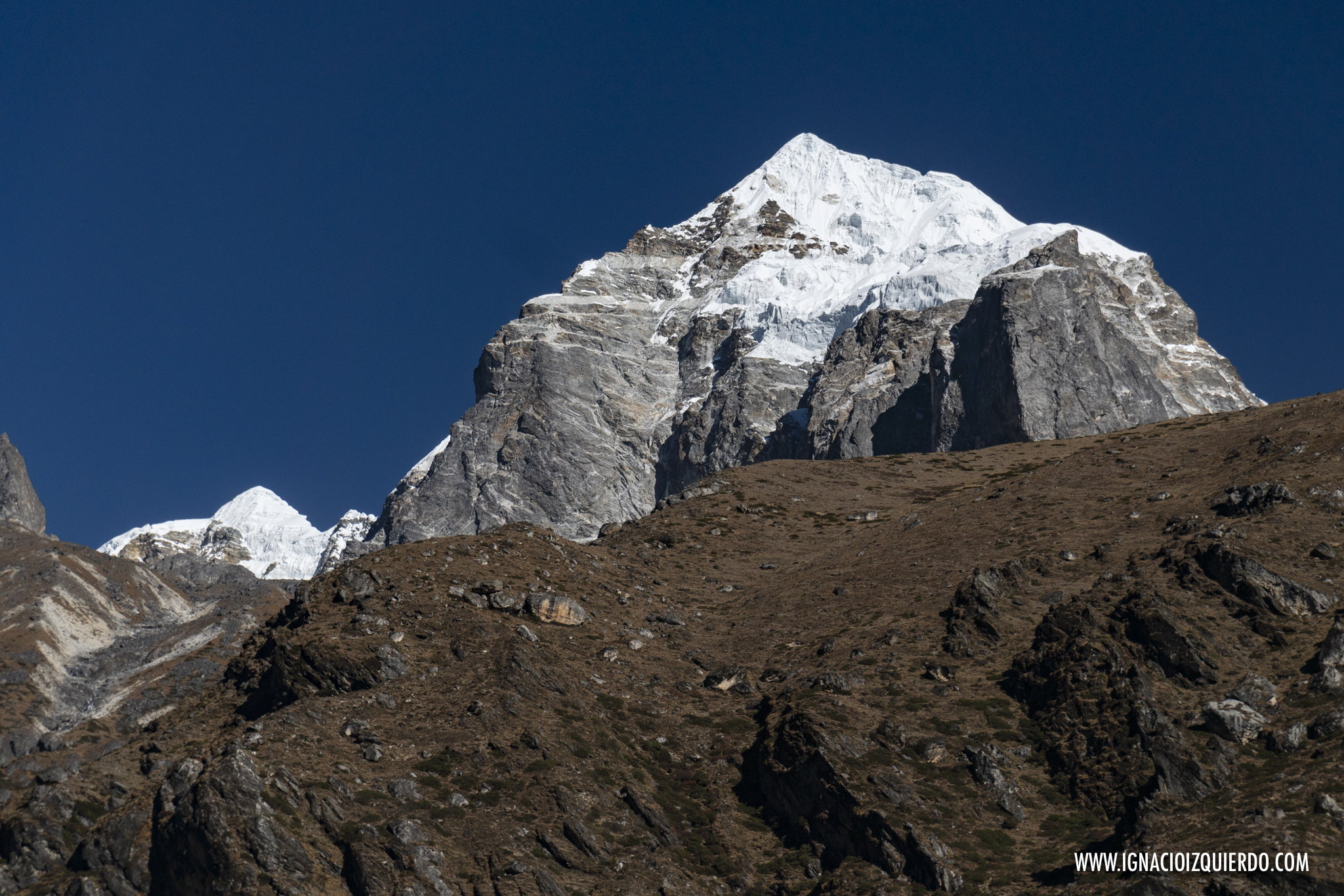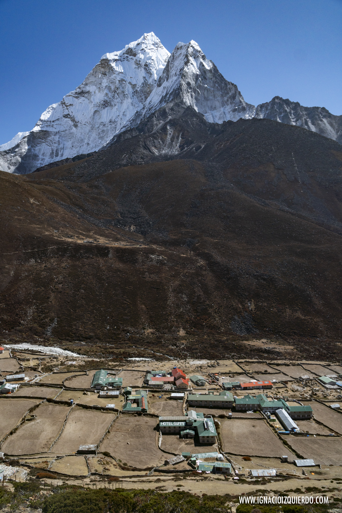 Poco a poco íbamos subiendo, caminando junto al margen del río Imja Khola. Nos habíamos separado del Dudh Koshi el día anterior al atravesar el Phunke Tenga y ahora caminábamos junto al ruido de agua recién nacida de glaciares y lo hacíamos en la sombra de los gigantes, en una garganta estrecha que ascendía sin pausa. Al fondo, en la lejanía, aparecía el Ama Dablam y mi velocidad de crucero se reducía drásticamente en el afán imposible de fotografiar todos sus ángulos, de robarle el alma con la cámara.