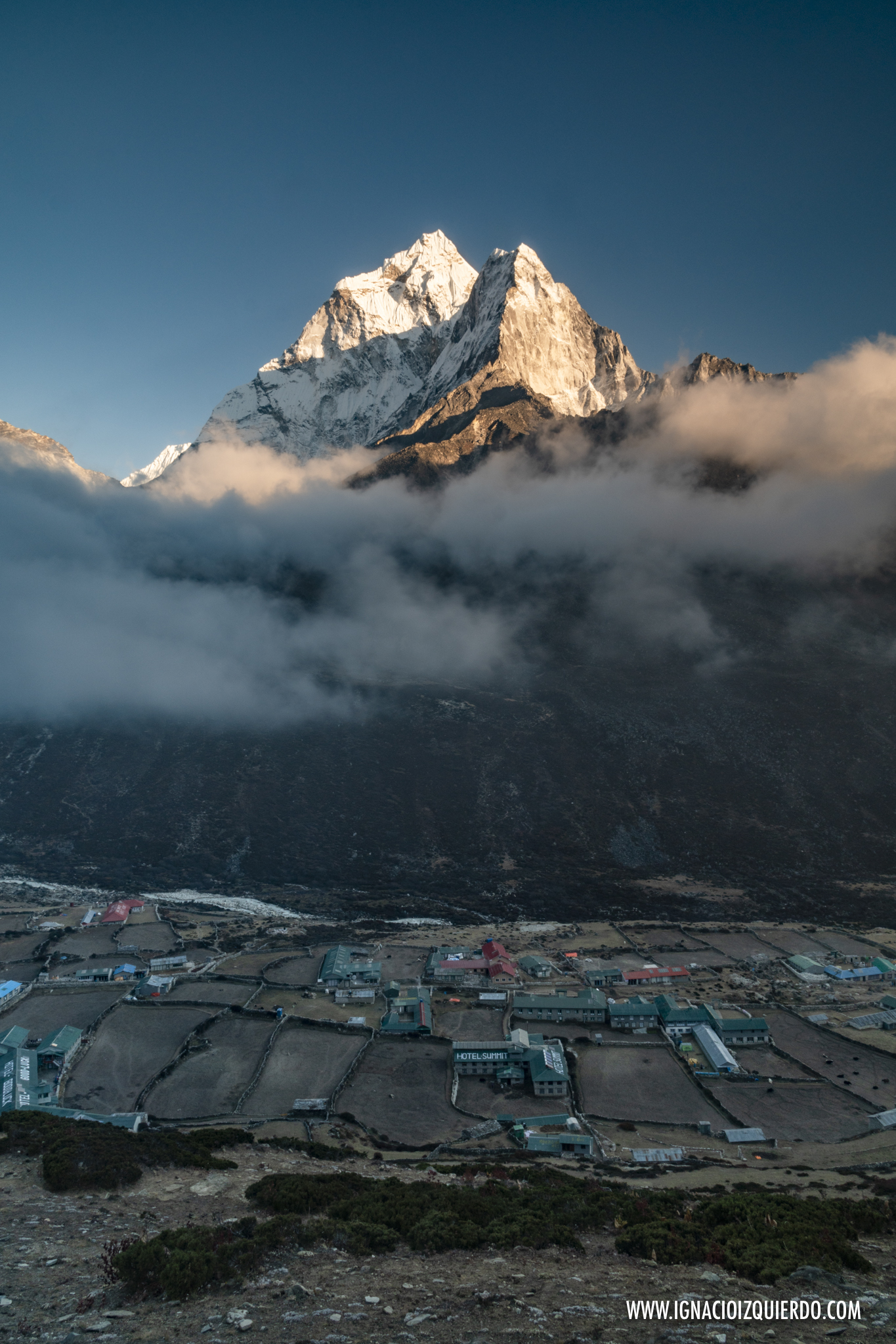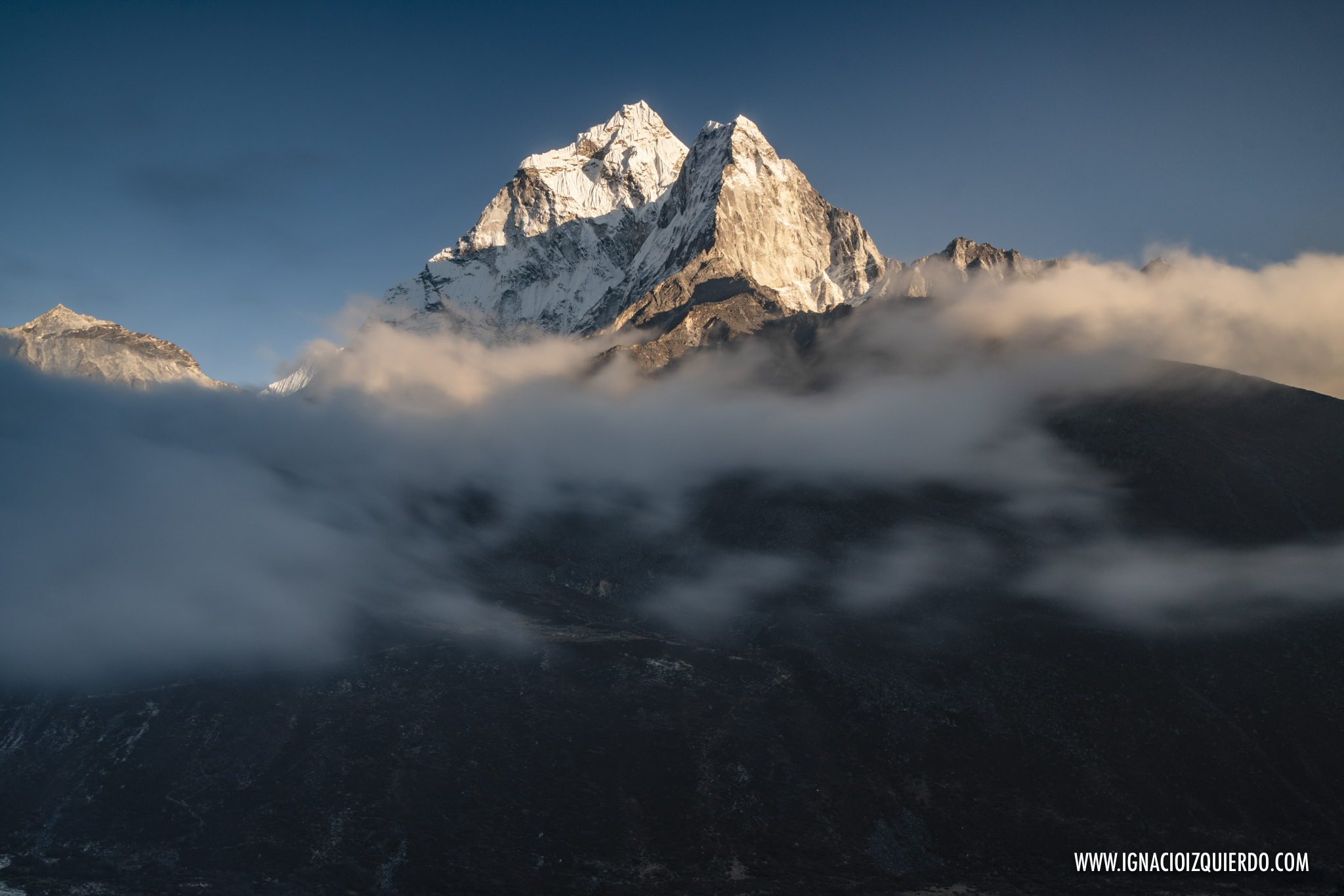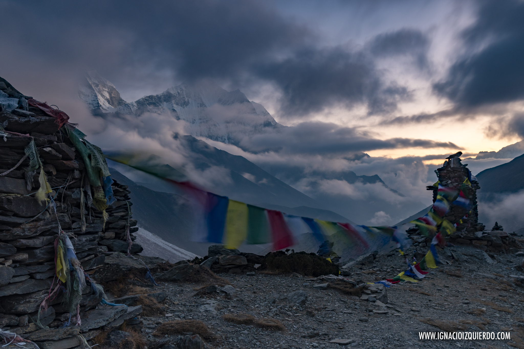 De vez en cuando las nubes aflojaban un poco y la cumbre del Ama Dablam asomaba durante unos instantes. No era mucho a lo que agarrarse pero me dió la moral suficiente para animarme a volver a subir a alguna colina y esperar a ver si podía hacer alguna foto del atardecer. Sería casi el primer atardecer que disfrutaría si lo conseguía. Hubo que tener fe, mucha, y no dejarse intimidar ni desistir antes de tiempo a las arremetidas del viento gélido y el frío imperante pero al final la montaña se apiadó de ese pobre hombre congelado agarrado a un trípode y me regaló un atardecer glorioso.