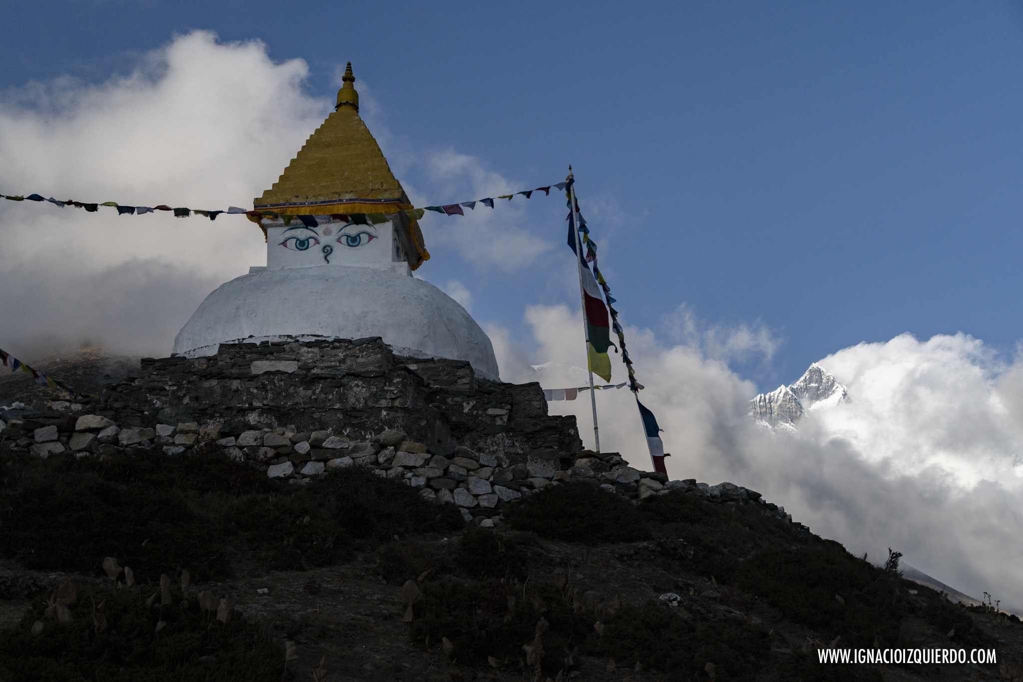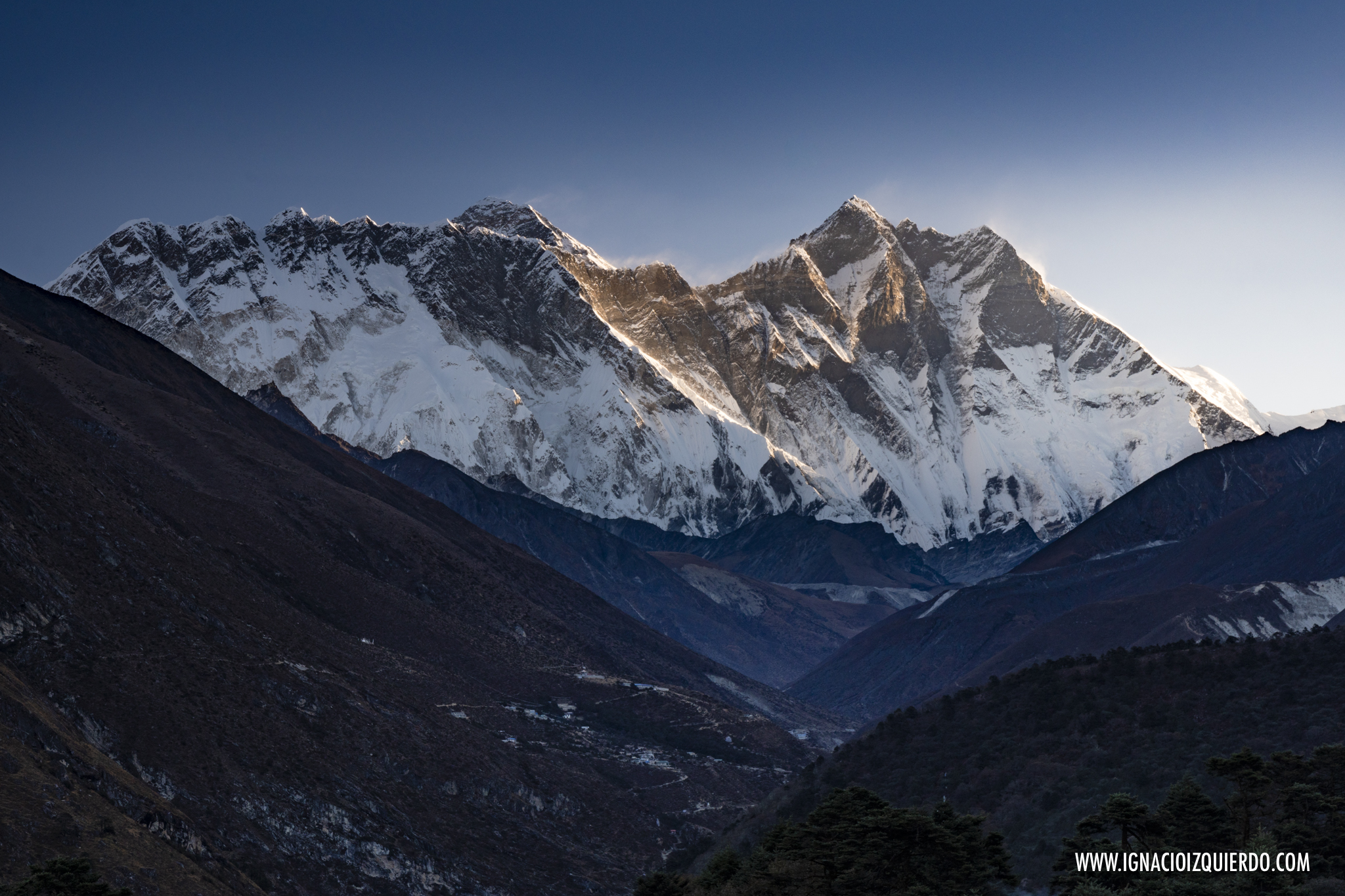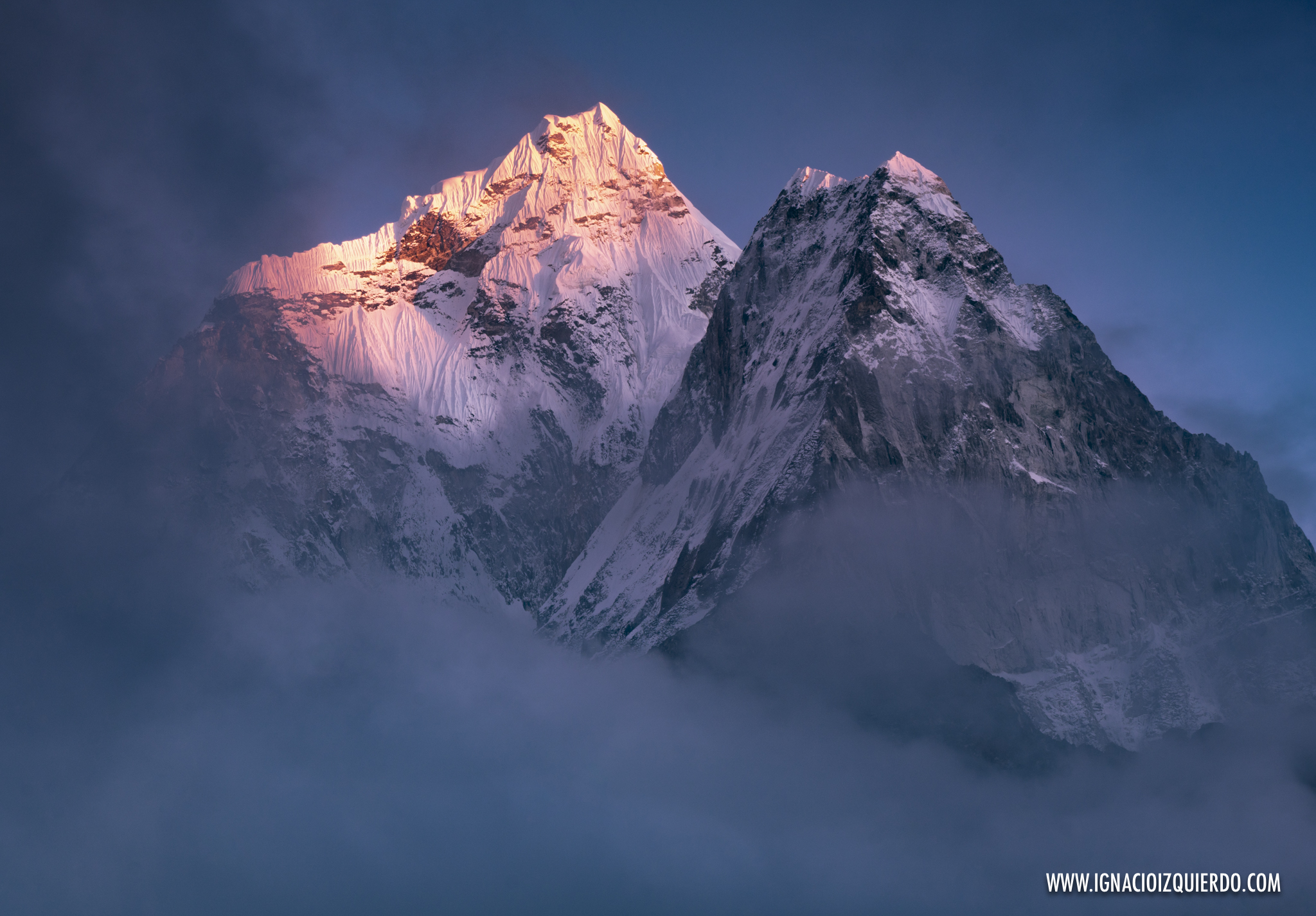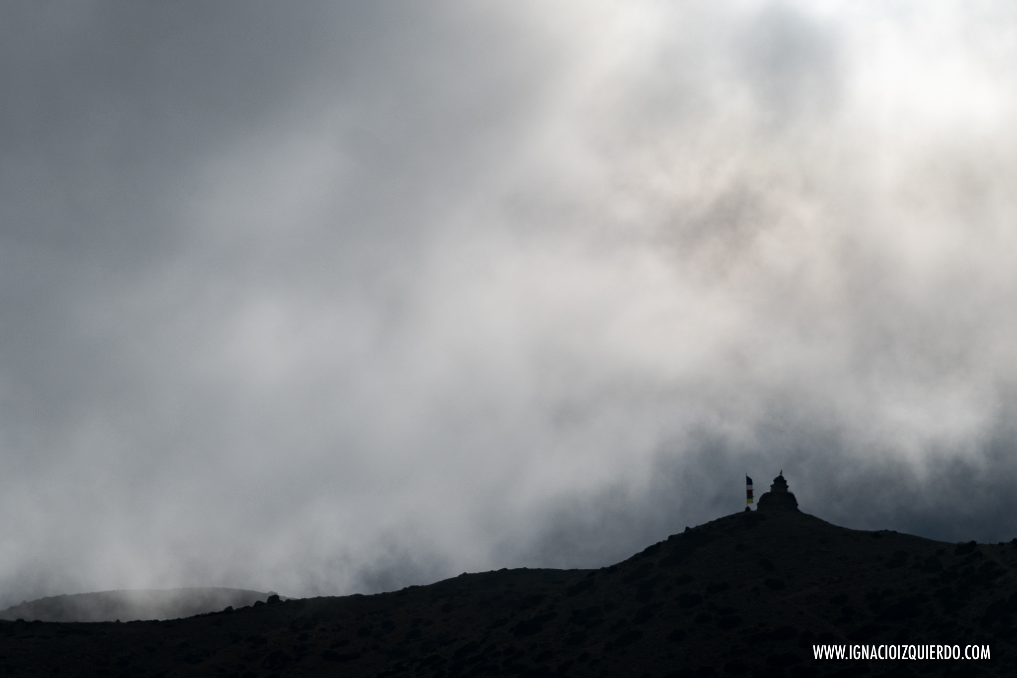 De vez en cuando las nubes aflojaban un poco y la cumbre del Ama Dablam asomaba durante unos instantes. No era mucho a lo que agarrarse pero me dió la moral suficiente para animarme a volver a subir a alguna colina y esperar a ver si podía hacer alguna foto del atardecer. Sería casi el primer atardecer que disfrutaría si lo conseguía. Hubo que tener fe, mucha, y no dejarse intimidar ni desistir antes de tiempo a las arremetidas del viento gélido y el frío imperante pero al final la montaña se apiadó de ese pobre hombre congelado agarrado a un trípode y me regaló un atardecer glorioso.