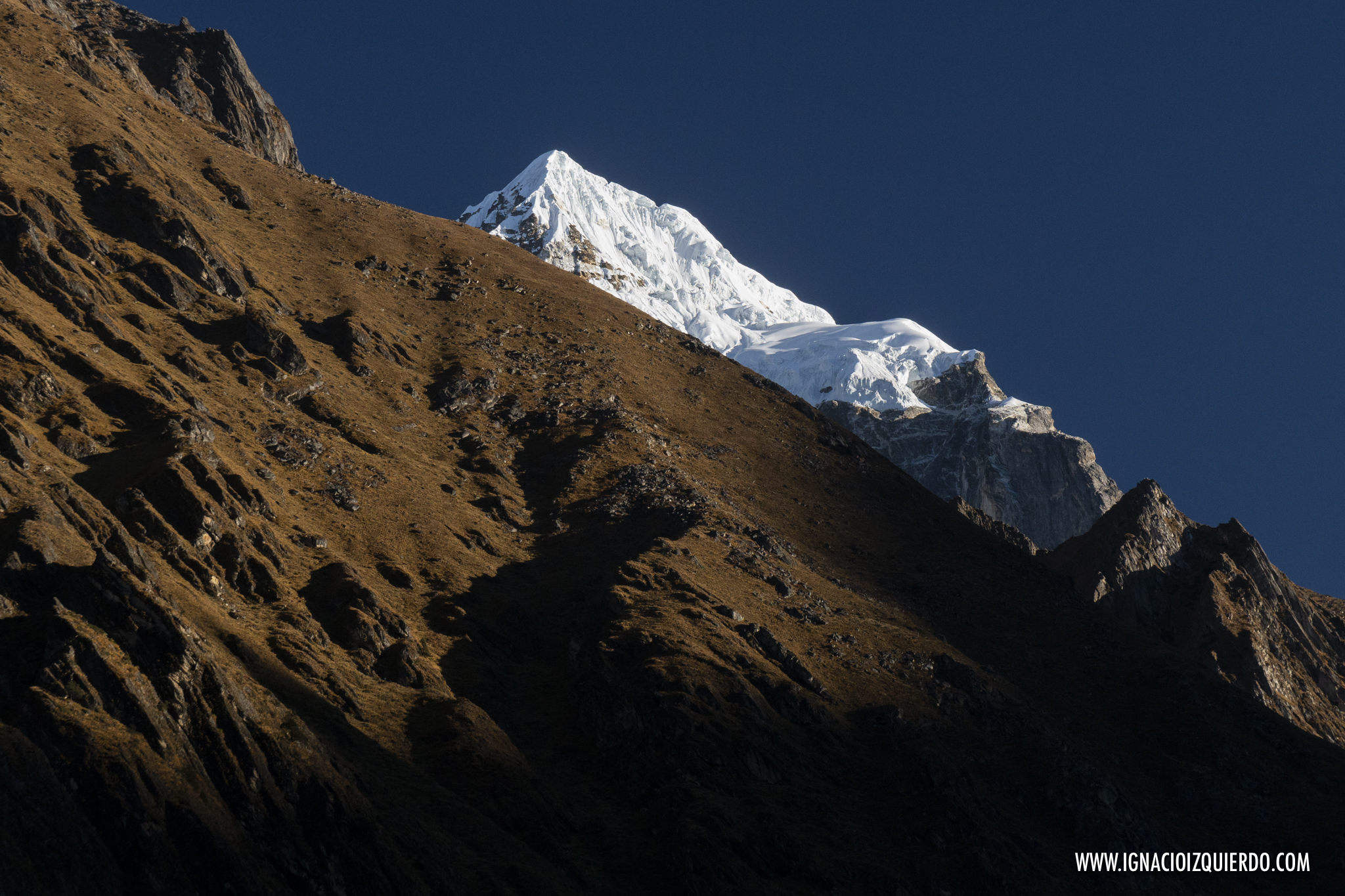 Nos despedimos con pena de esa postal antes de empezar a caminar. Ni siquiera eran las siete de la mañana y ya nos metíamos entre las sombras de la montaña bajo un bosque de rododendros. La etapa que nos esperaba no era, en teoría, demasiado difícil y su principal complicación radicaba en la altura. Íbamos a superar por primera vez los 4000 metros y entrábamos en terreno peliagudo donde tendríamos que estar muy atentos a la reacción de nuestro cuerpo a la estancia prolongada a partir de estas alturas.