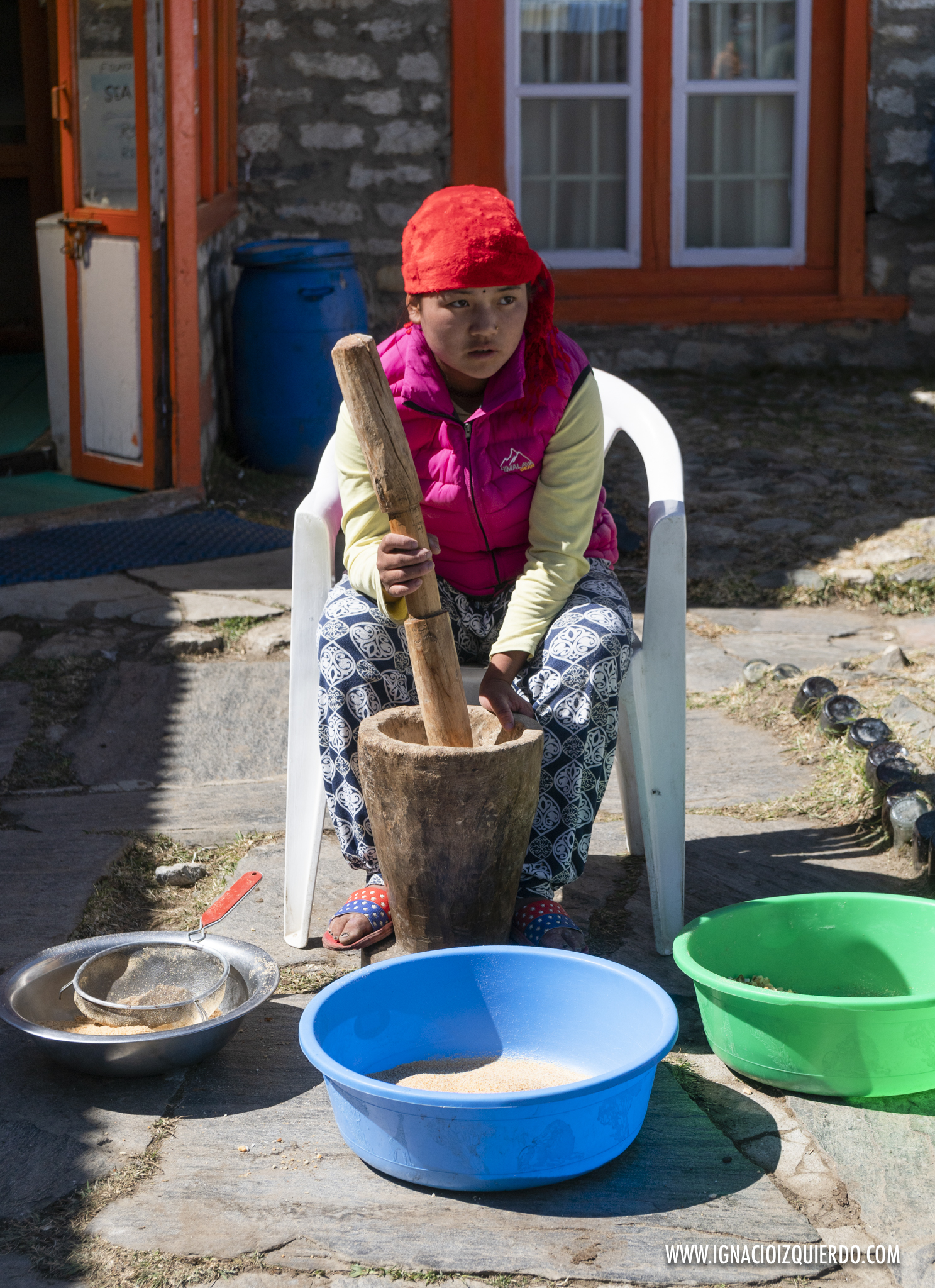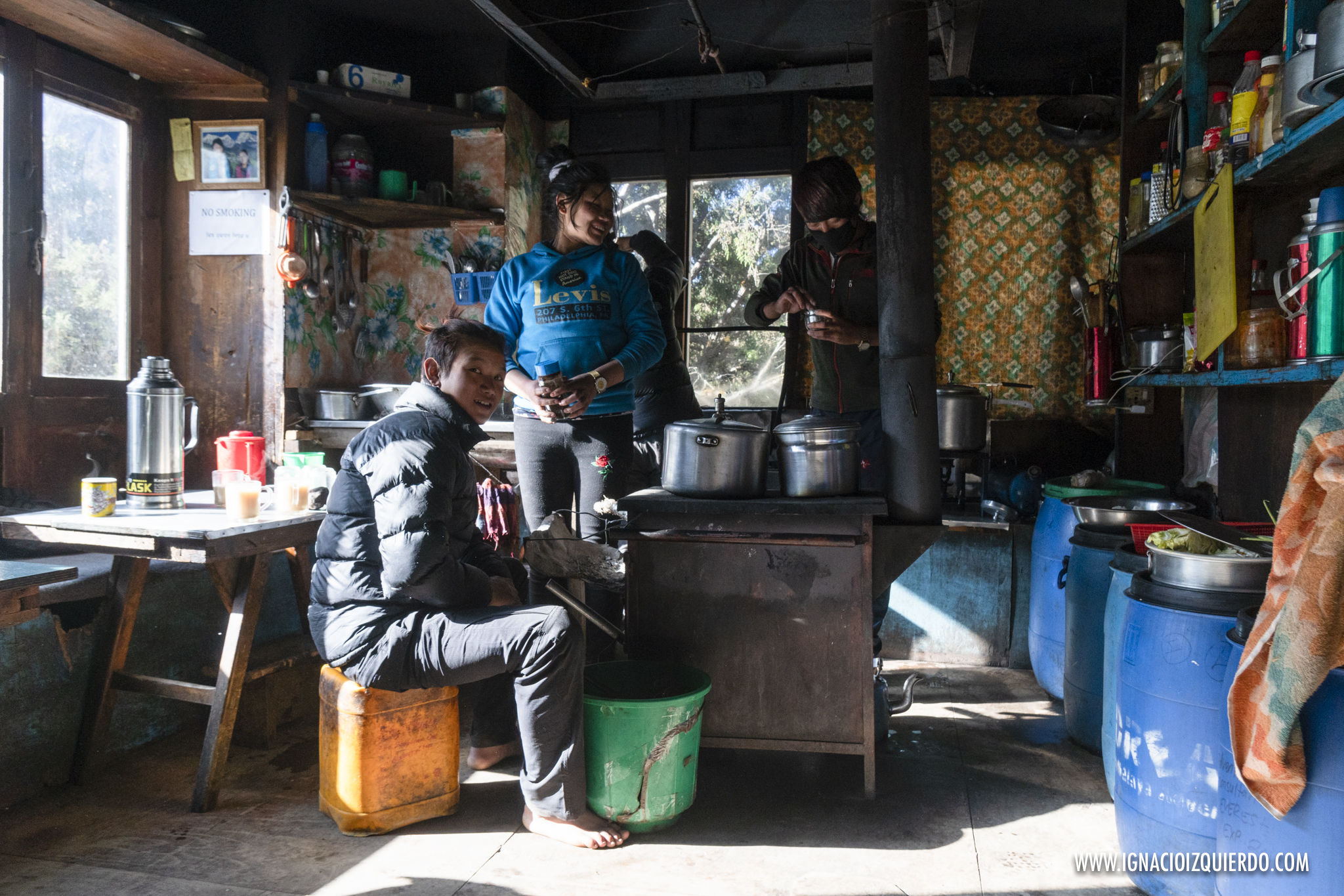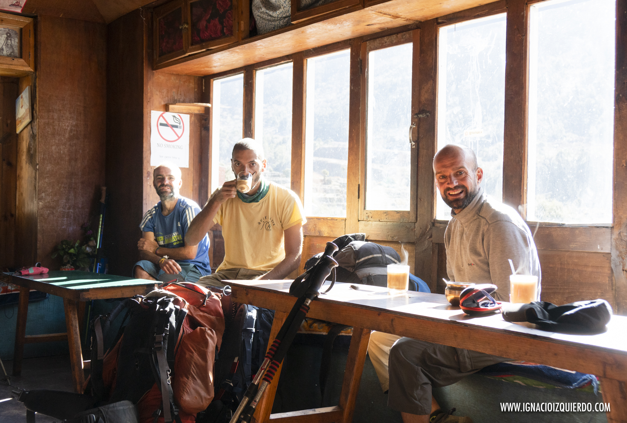 Paramos para nuestro segundo desayuno de milk tea y samosas en las primeras casas de Pangboché. Los grupos de excursionistas también estaban en marcha ya y paraban en la zona más central del pueblo. Haciendo gala de nuestro espíritu antisocial acabamos en una casa en la que éramos los únicos extranjeros y donde el sentimiento de fascinación era recíproco con nuestros anfitriones, tanto, que me dejaron entrar en la cocina a hacerles fotos mientras nos contaban como el que no era porteador, era guía y quién más quién menos ya había hecho cima en la mayoría de los picos de la zona. Era algo bastante normal cuando hablabas con los locales en los lodges, más de uno ya había hecho cumbre en el Everest en alguna ocasión. Por cierto que aunque nosotros no lo hicimos y para un viaje con aún menos prisa siempre podéis alojaros en Pangboché y gastar este día para acercaros desde allí al campamento base del Ama Dablam (4600 m.)