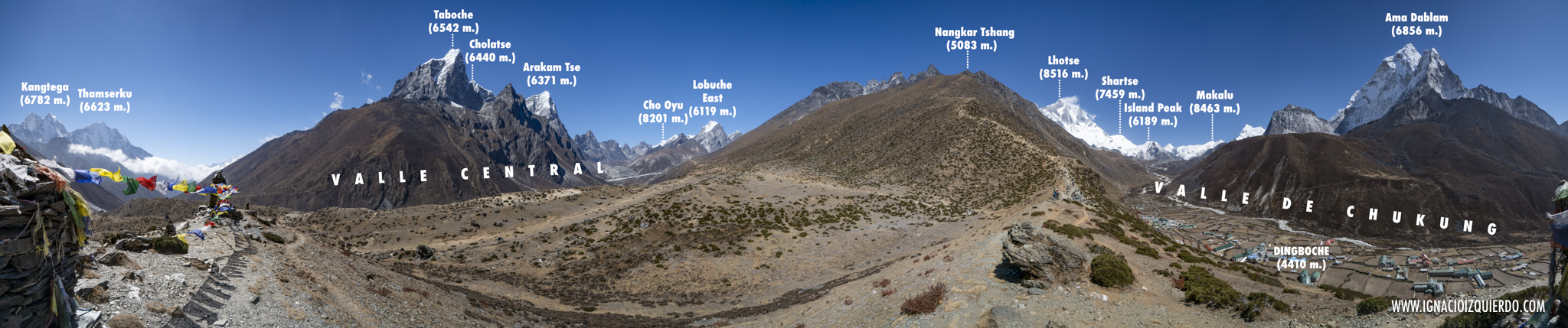 (Foto de 360 grados con donde se aprecian el valle Central y el valle de Chukung, además de tener 3 ochomiles en la misma foto: El Lhotse, el Makalu y el Cho Oyu)